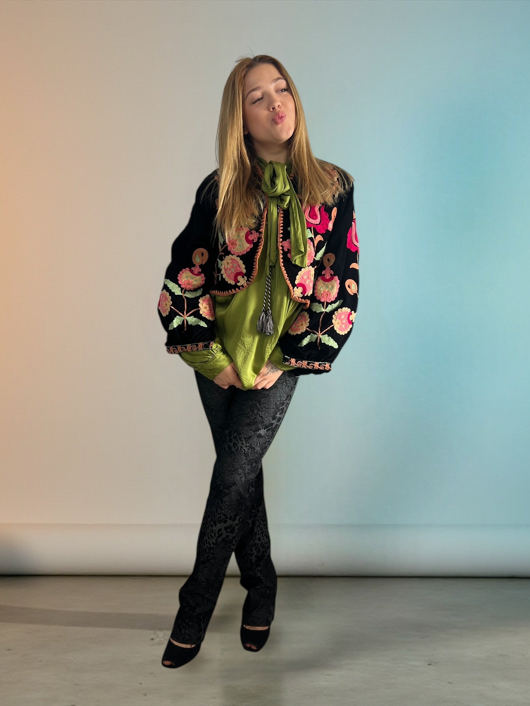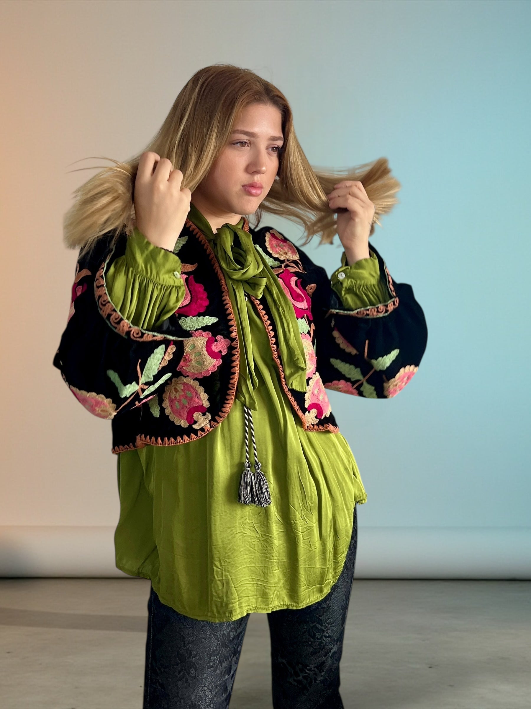 Este bolero corto, confeccionado en terciopelo suave y bordado a mano en la India, es una joya textil que combina delicadeza y carácter. Su diseño floral, elaborado con precisión artesanal, aporta un aire romántico y sofisticado a cualquier conjunto.