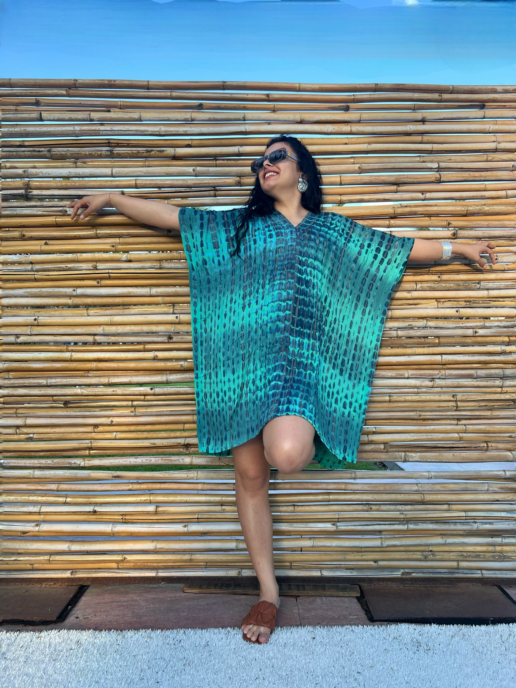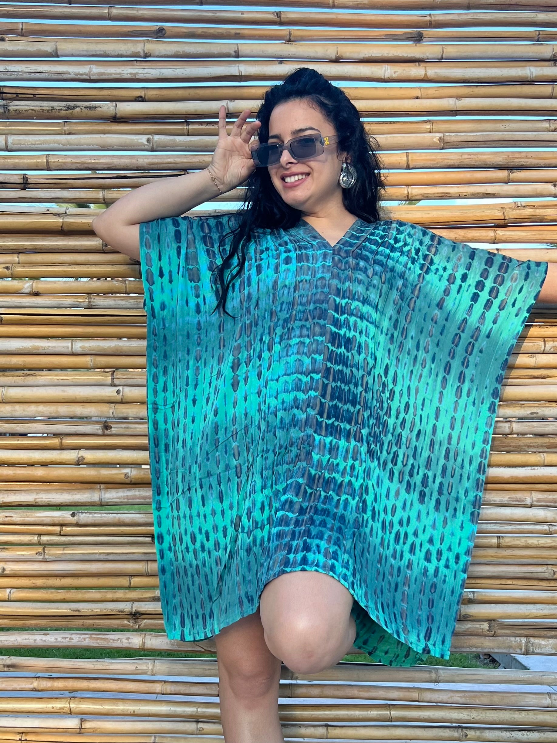 Déjate envolver por la frescura y el color de nuestro caftán corto de rayón, teñido a mano con la técnica Tie-Dye para un diseño vibrante y único.