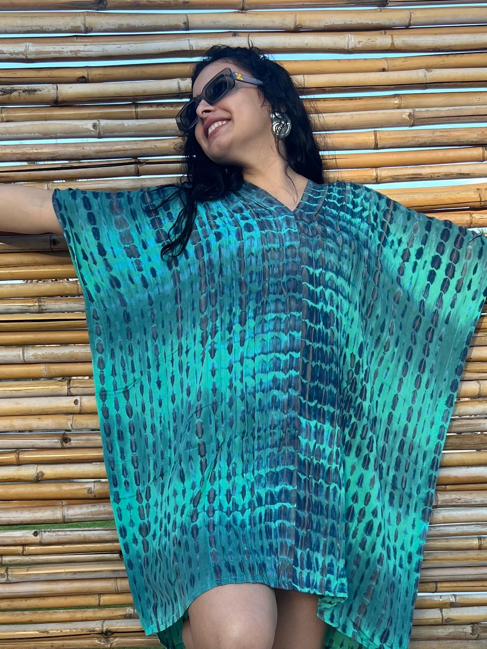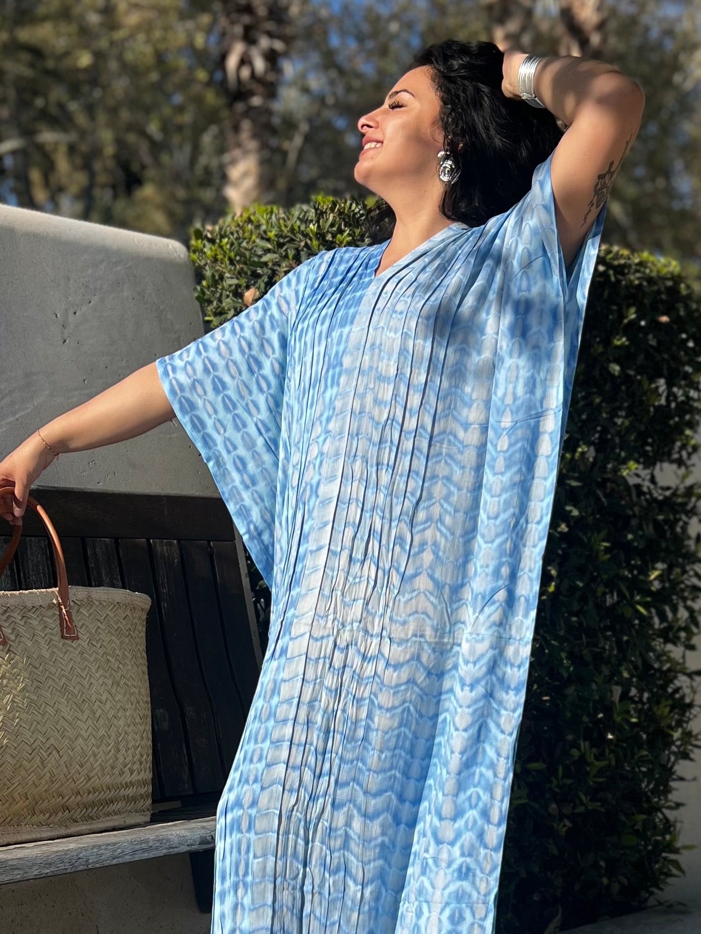 Déjate envolver por la frescura y el color de nuestro kaftan largo de rayón, teñido a mano con la técnica Tie-Dye para un diseño vibrante y único.