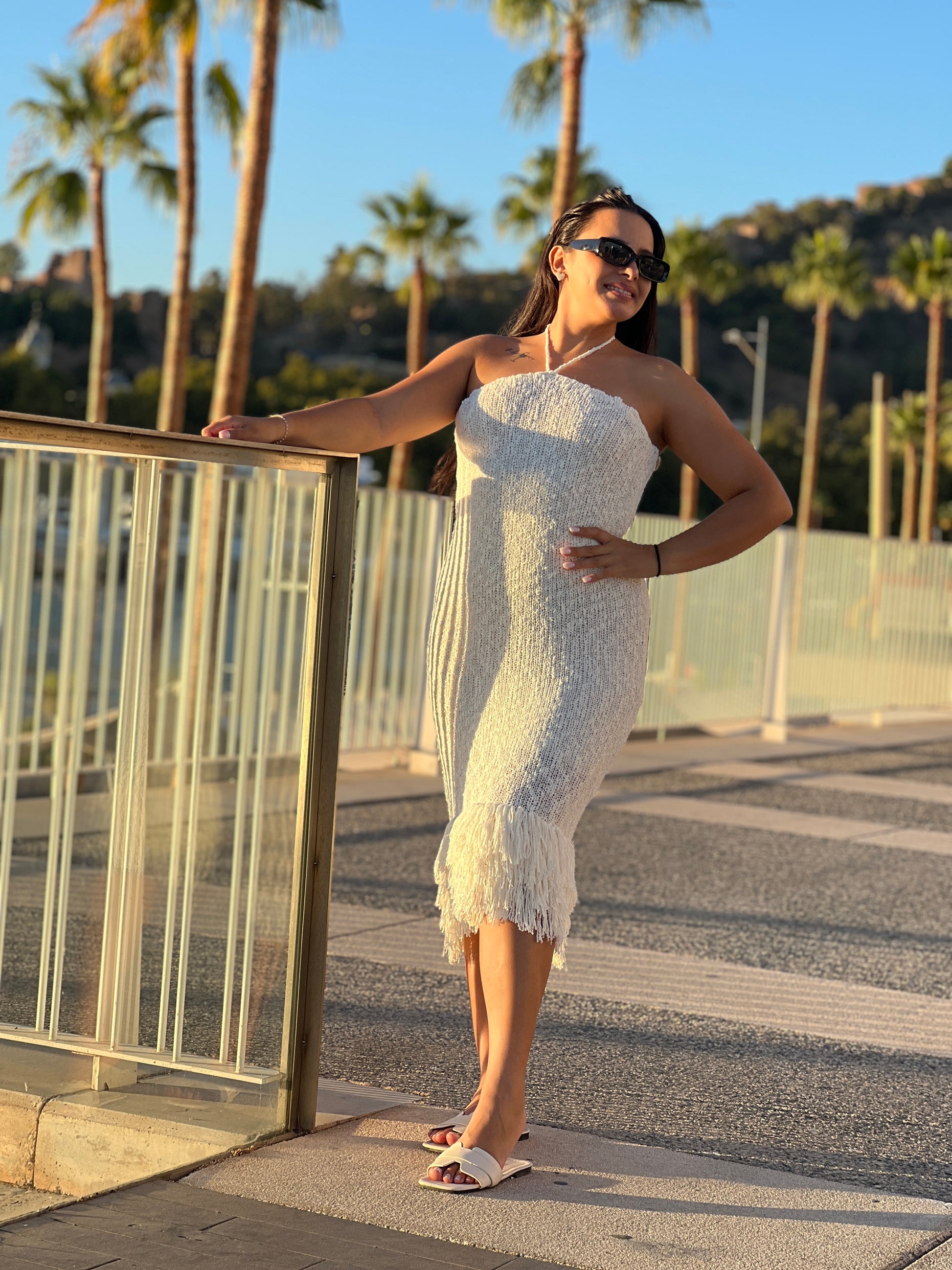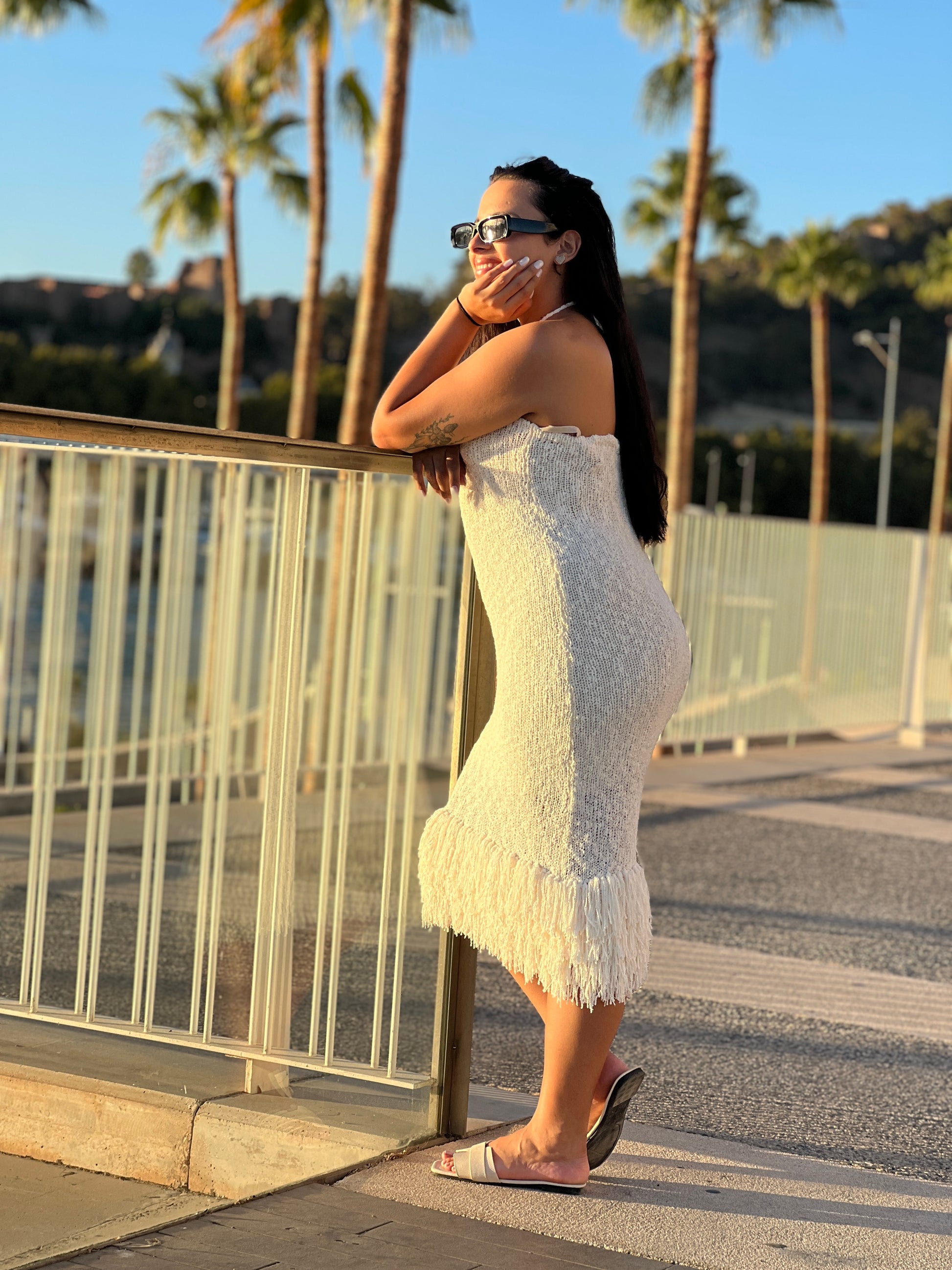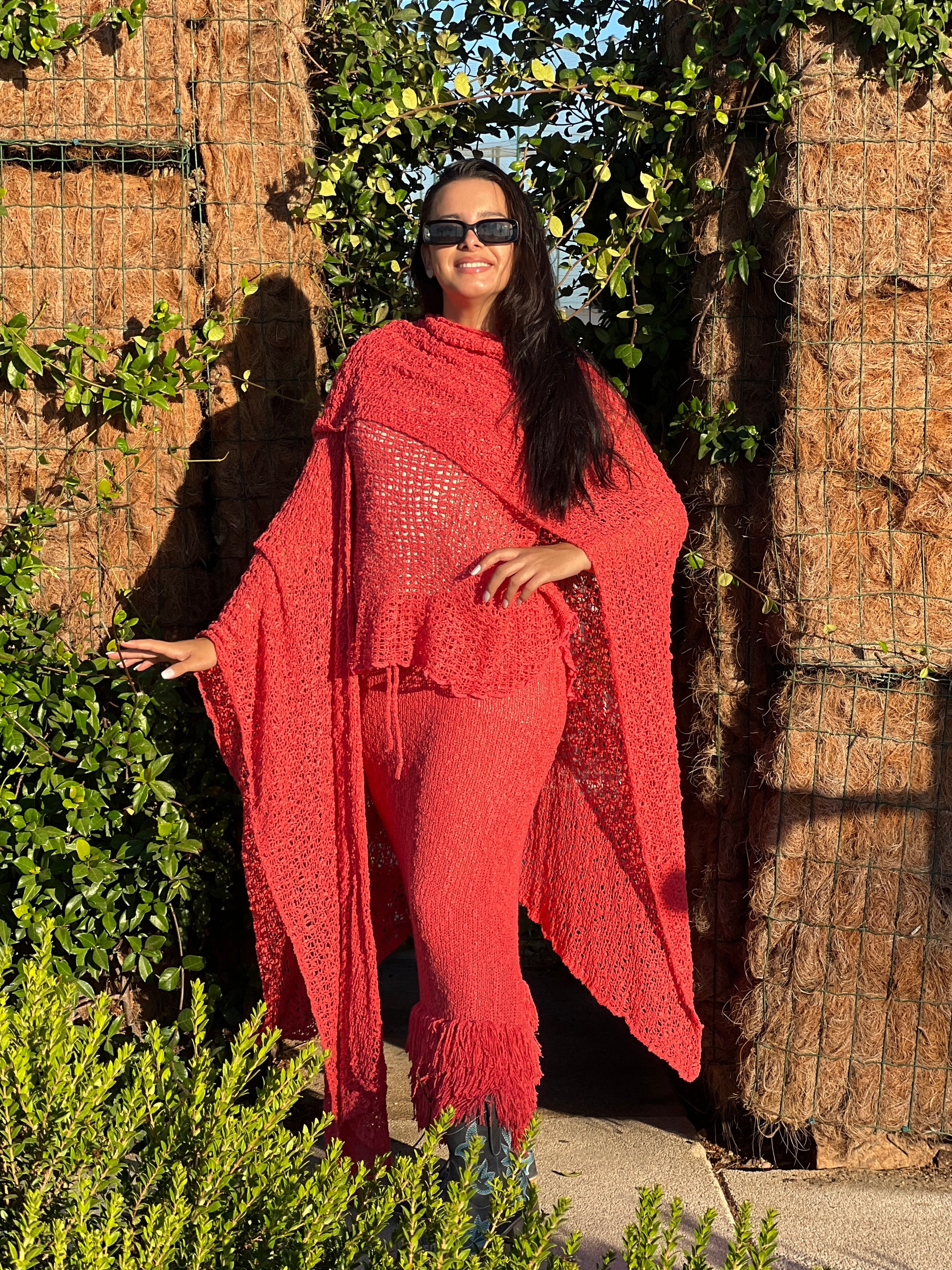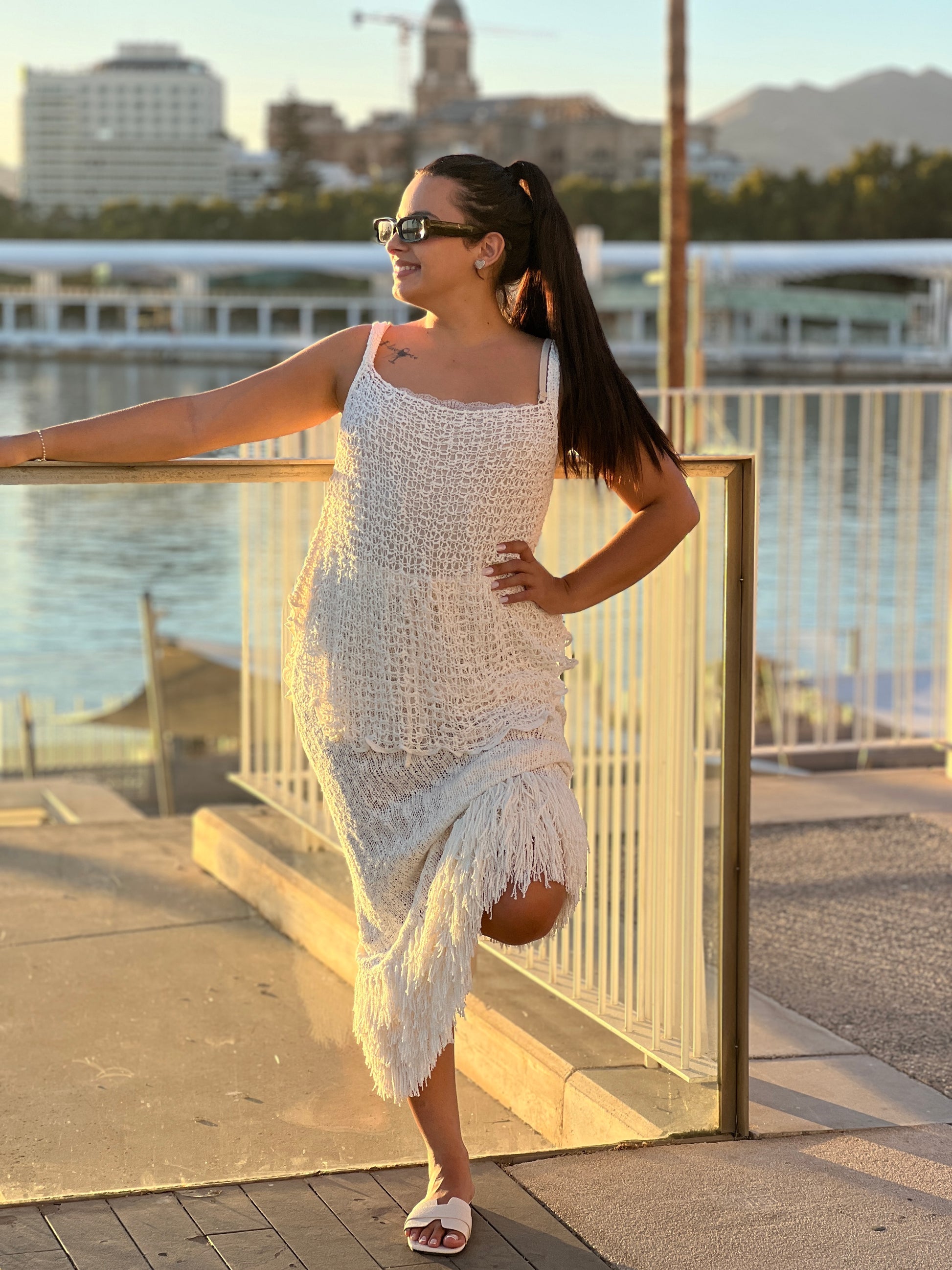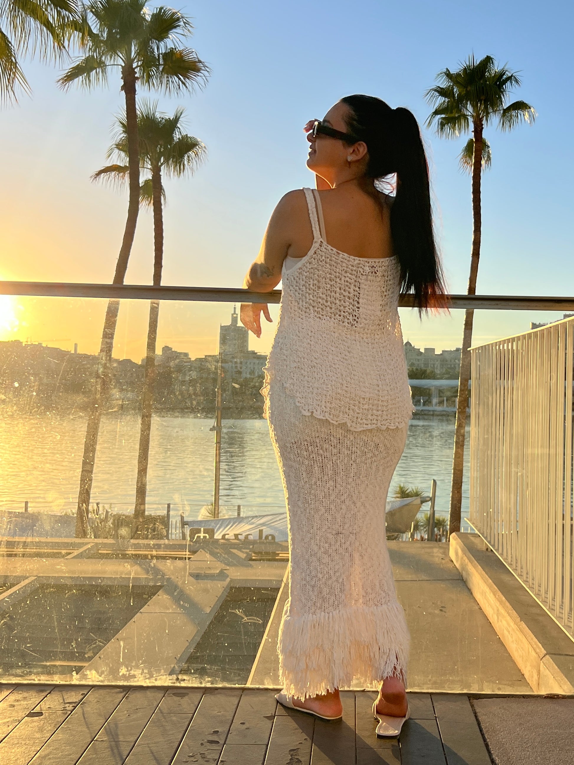 El diseño único incluye un top de tirantes y una falda larga a juego, esta falda es versatil: tambien se puede usar como vestido. Confeccionados en una delicada malla tipo crochet, con un acabado deshilachado que añade un toque artesanal y auténtico.
