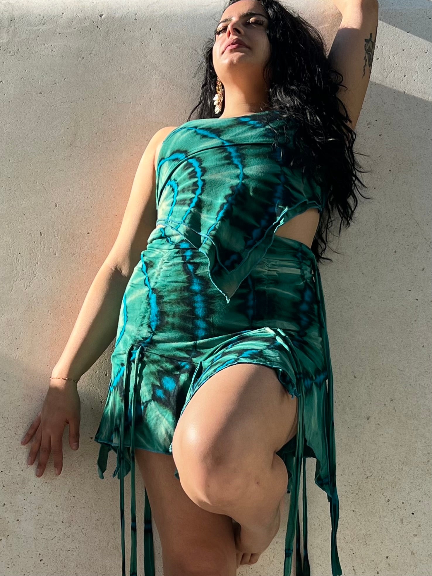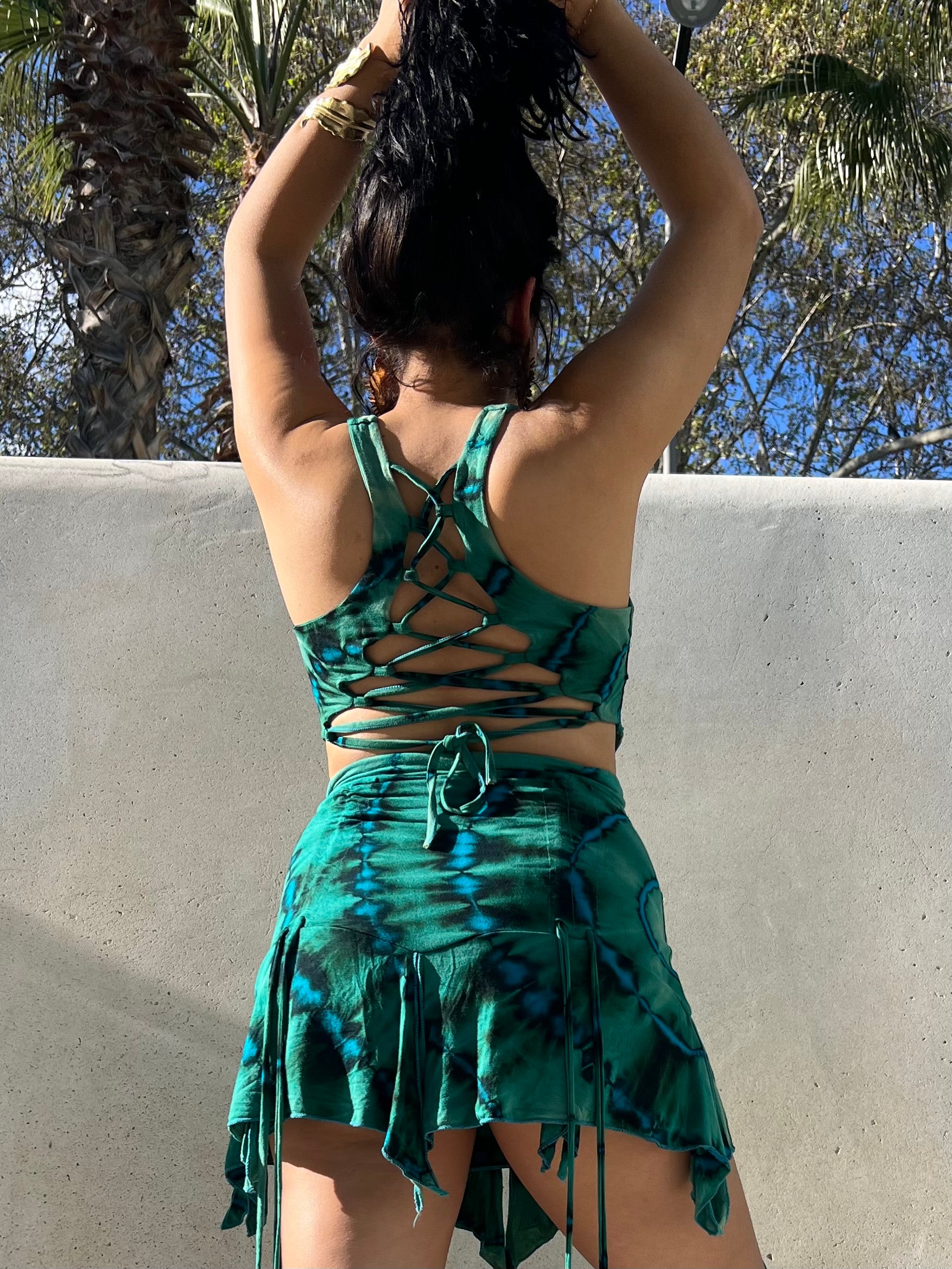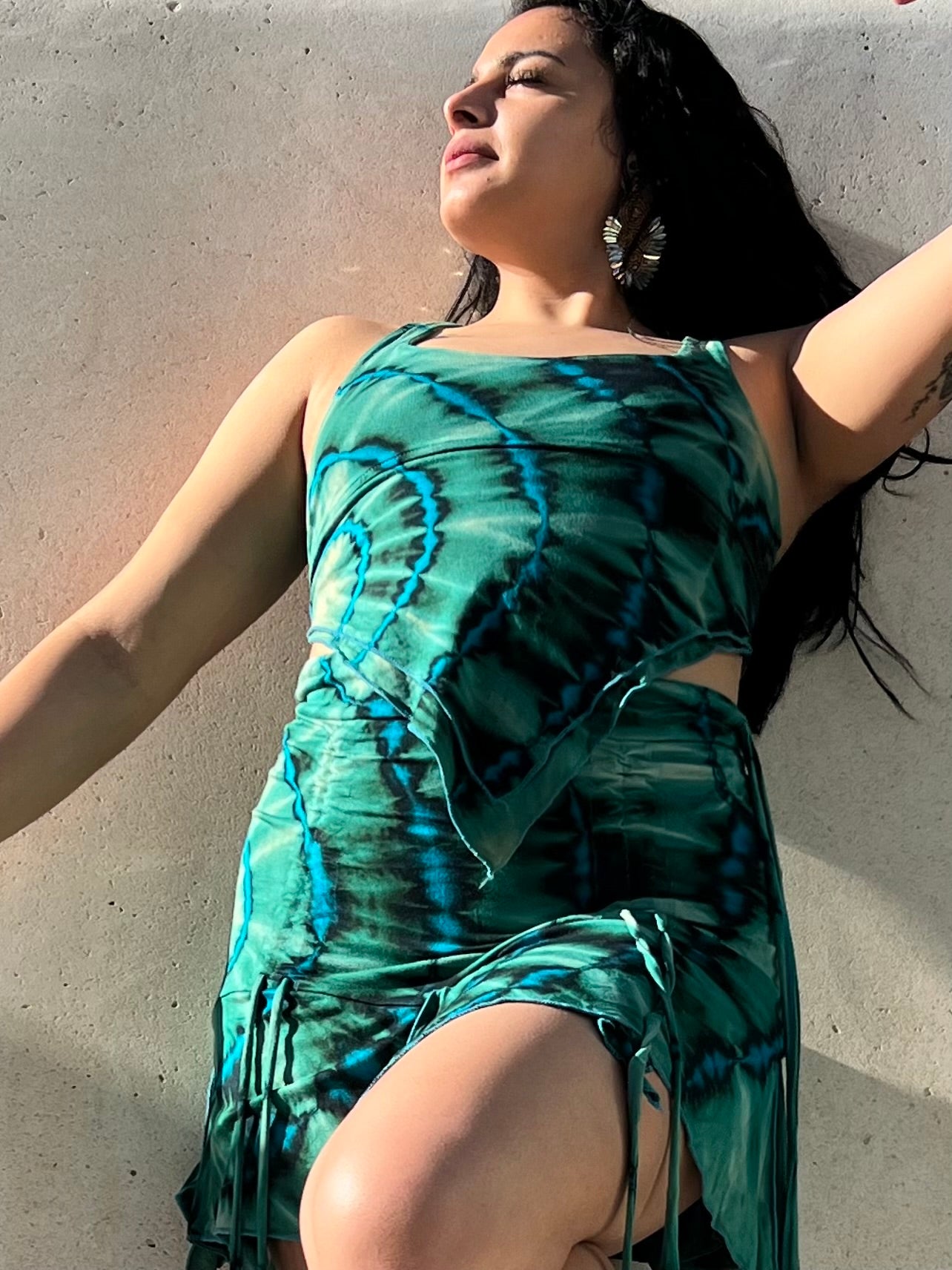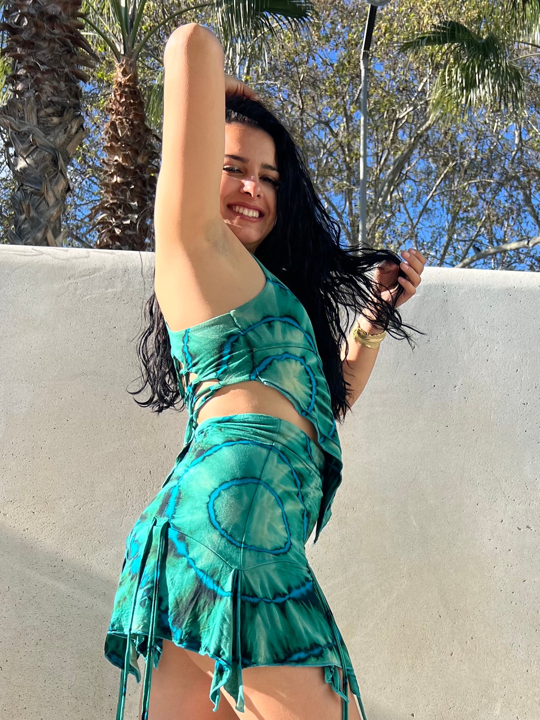 Este conjunto de top y falda en spandex de rayón con técnica tie-dye combina comodidad, elasticidad y estilo en una sola prenda.