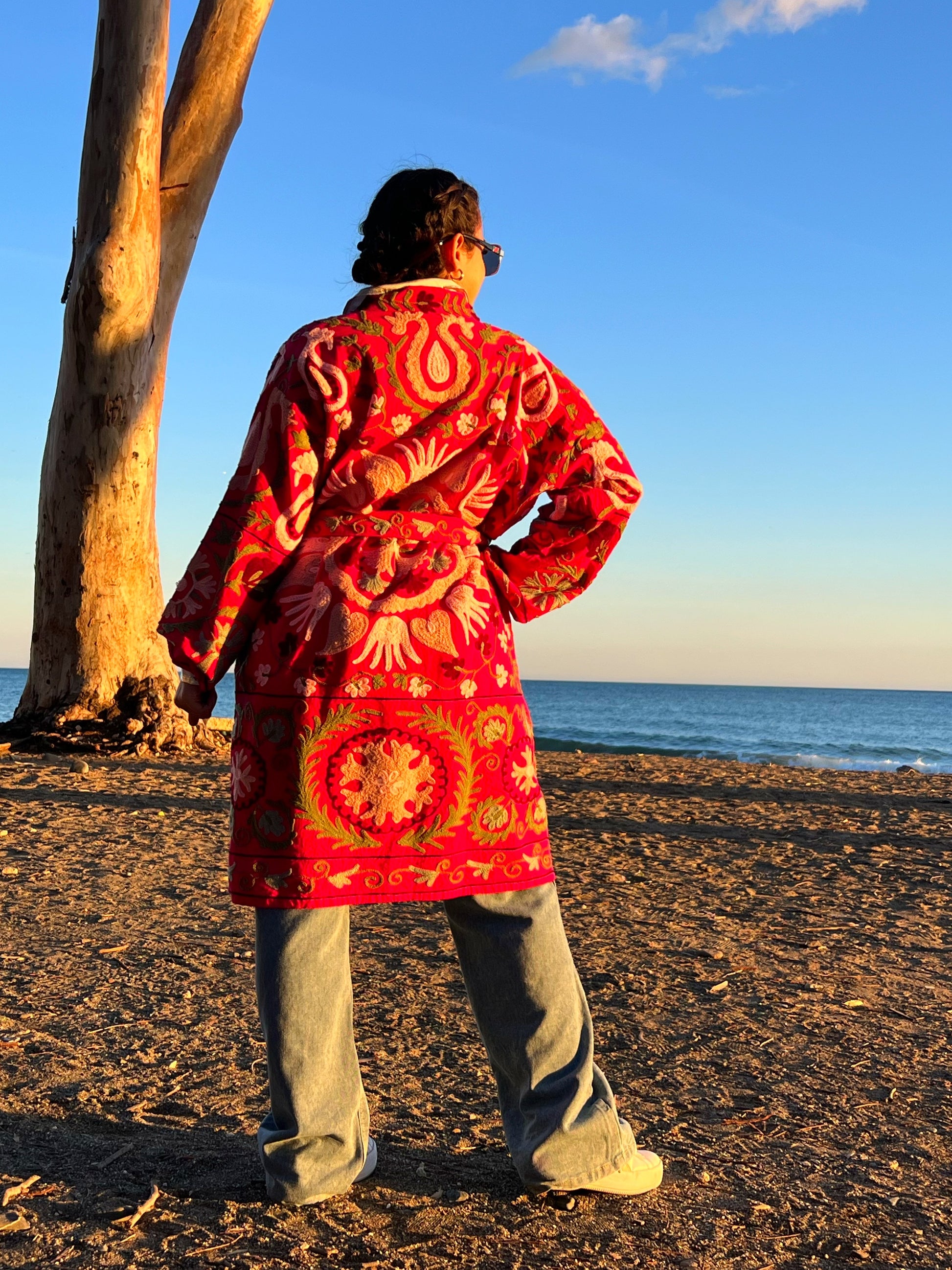 Este kimono de algodón en color fucsia es una prenda vibrante y llamativa. Está bordado a mano con motivos que evocan la rica cultura mexicana, como figuras inspiradas en artesanías tradicionales, tal vez alebrijes o patrones geométricos que recuerdan a los textiles indígenas. Además, está adornado con una variedad de flores en tonos vivos, como rojos, naranjas, azules, verdes y amarillos, lo que añade un toque festivo y alegre.