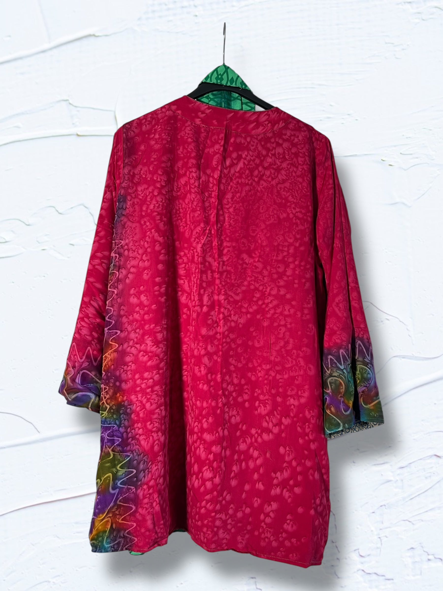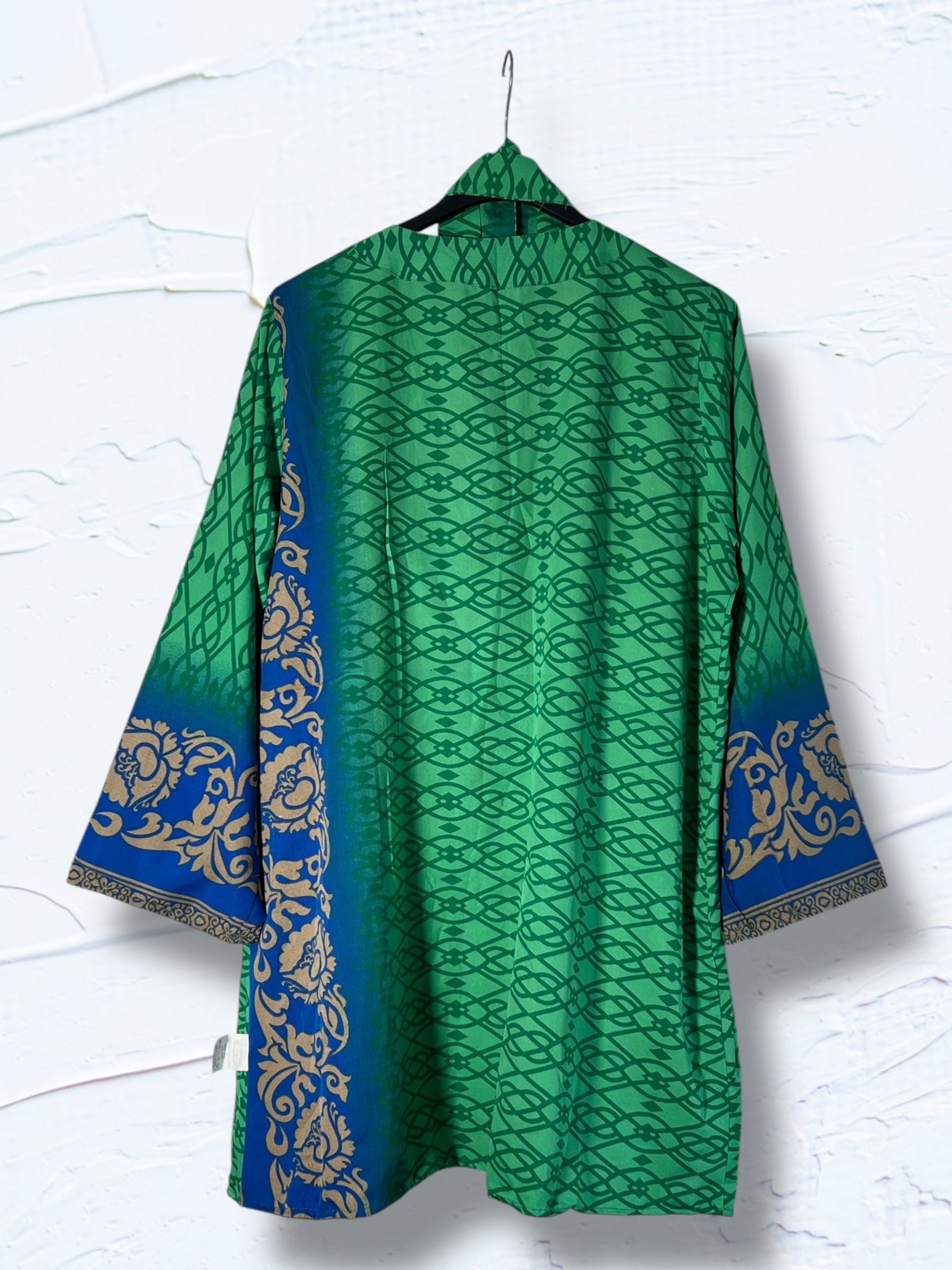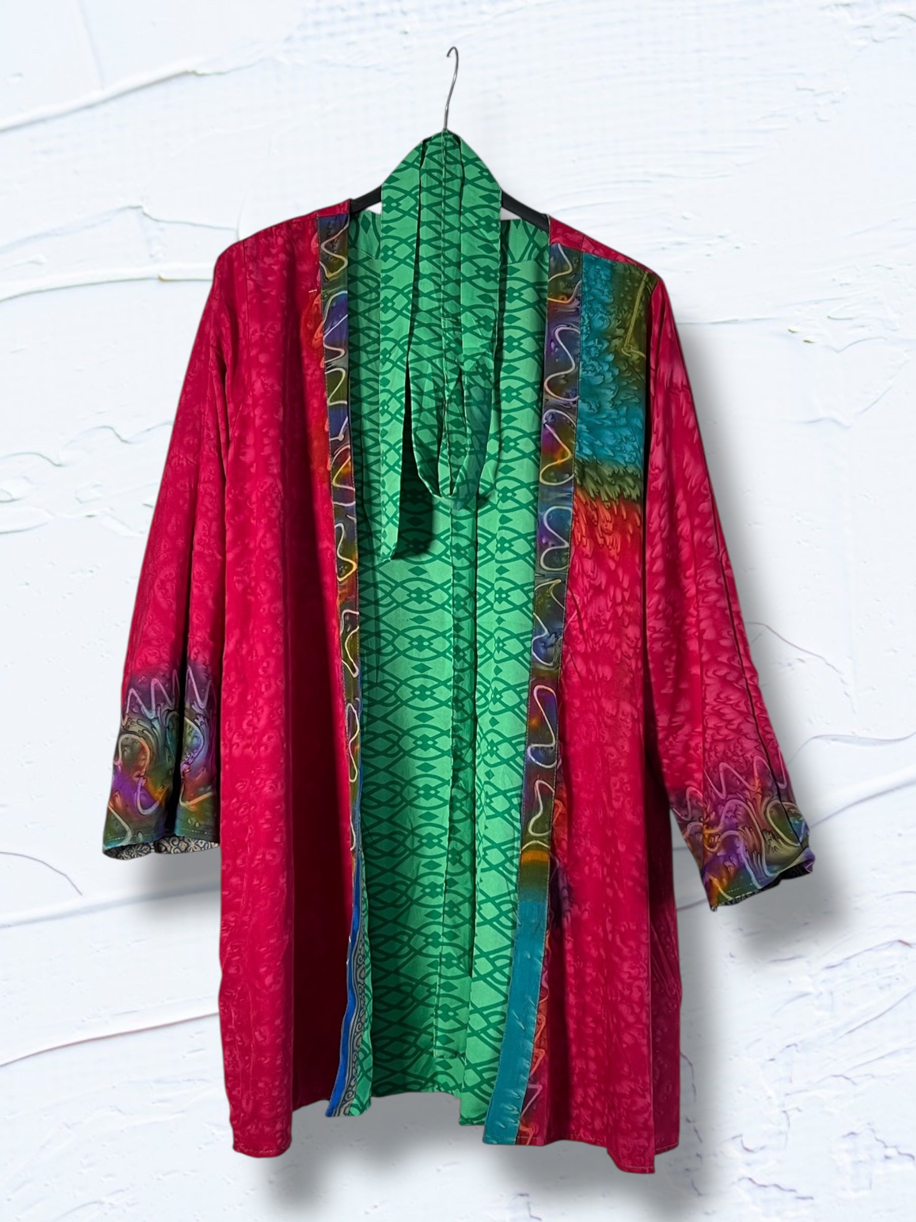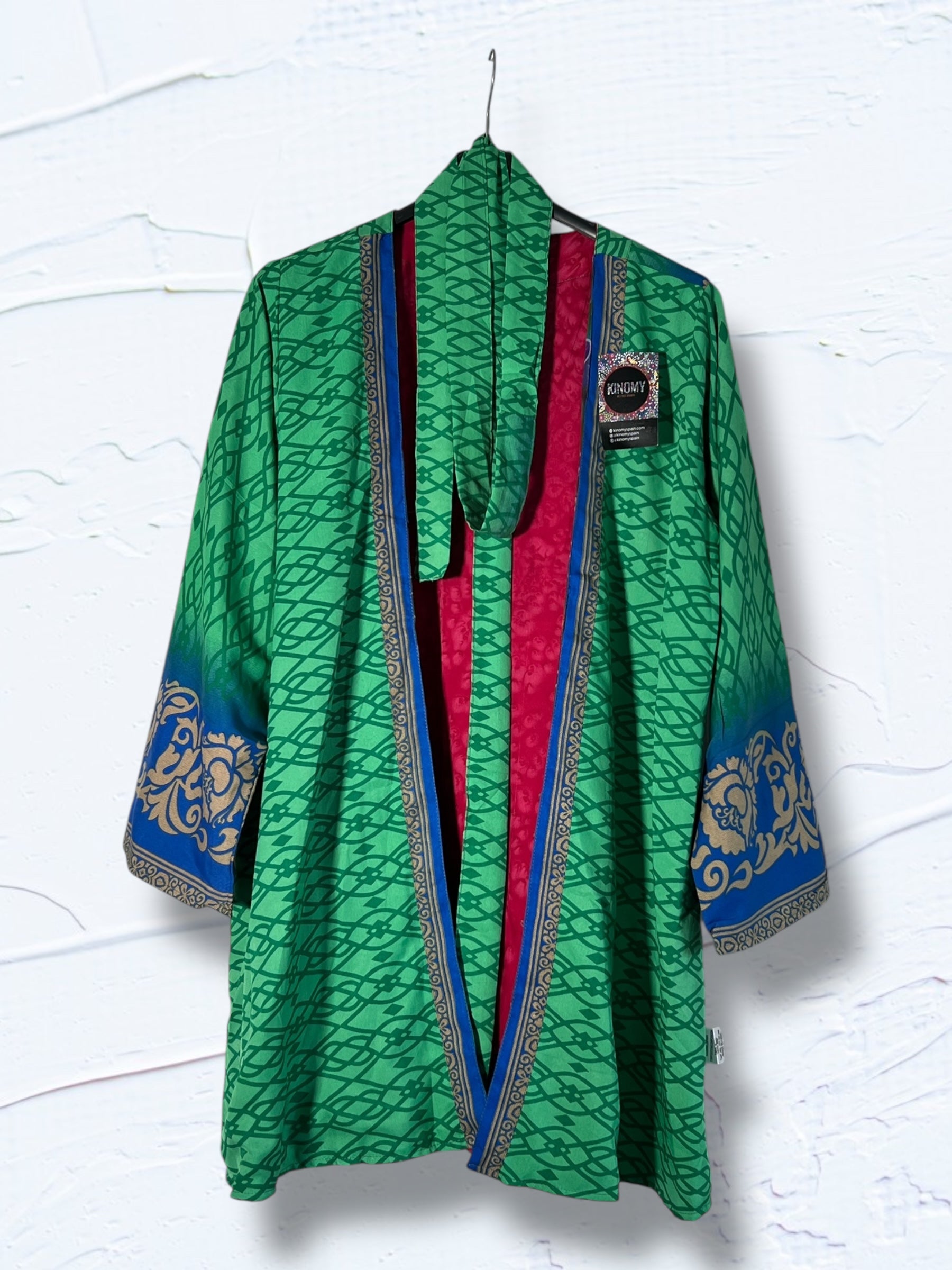 Kimono corto de seda 100% hecho en India. Doble tejido y reversible, con cinturón. Cada kimono es único y exclusivo. Talla única recomendable para la talla M o L ( axila-axila:64cm/ largo 80cm)