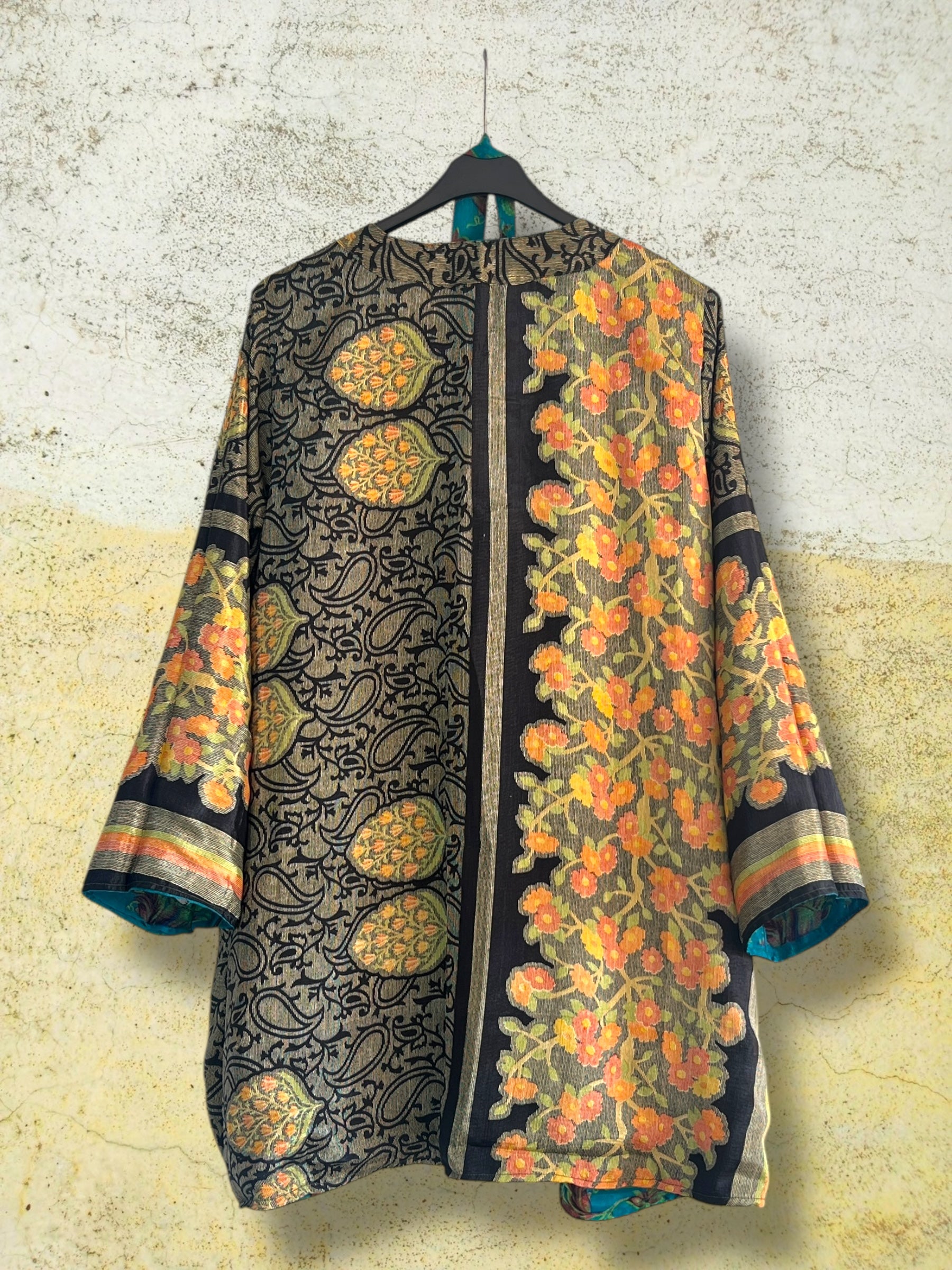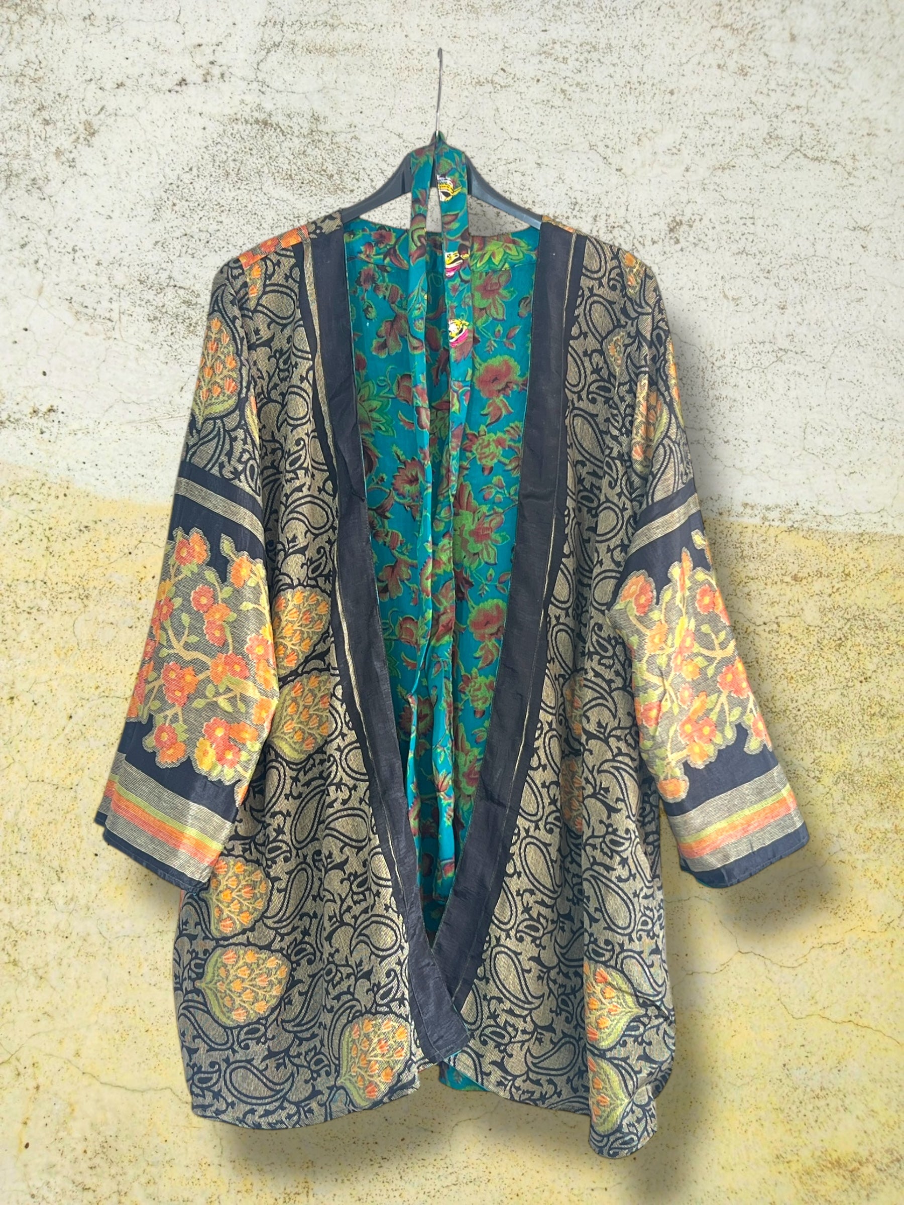 Kimono corto de seda 100% hecho en India. Doble tejido y reversible, con cinturón. Cada kimono es único y exclusivo. Talla única recomendable para la talla M o L ( axila-axila:64cm/ largo 80cm)