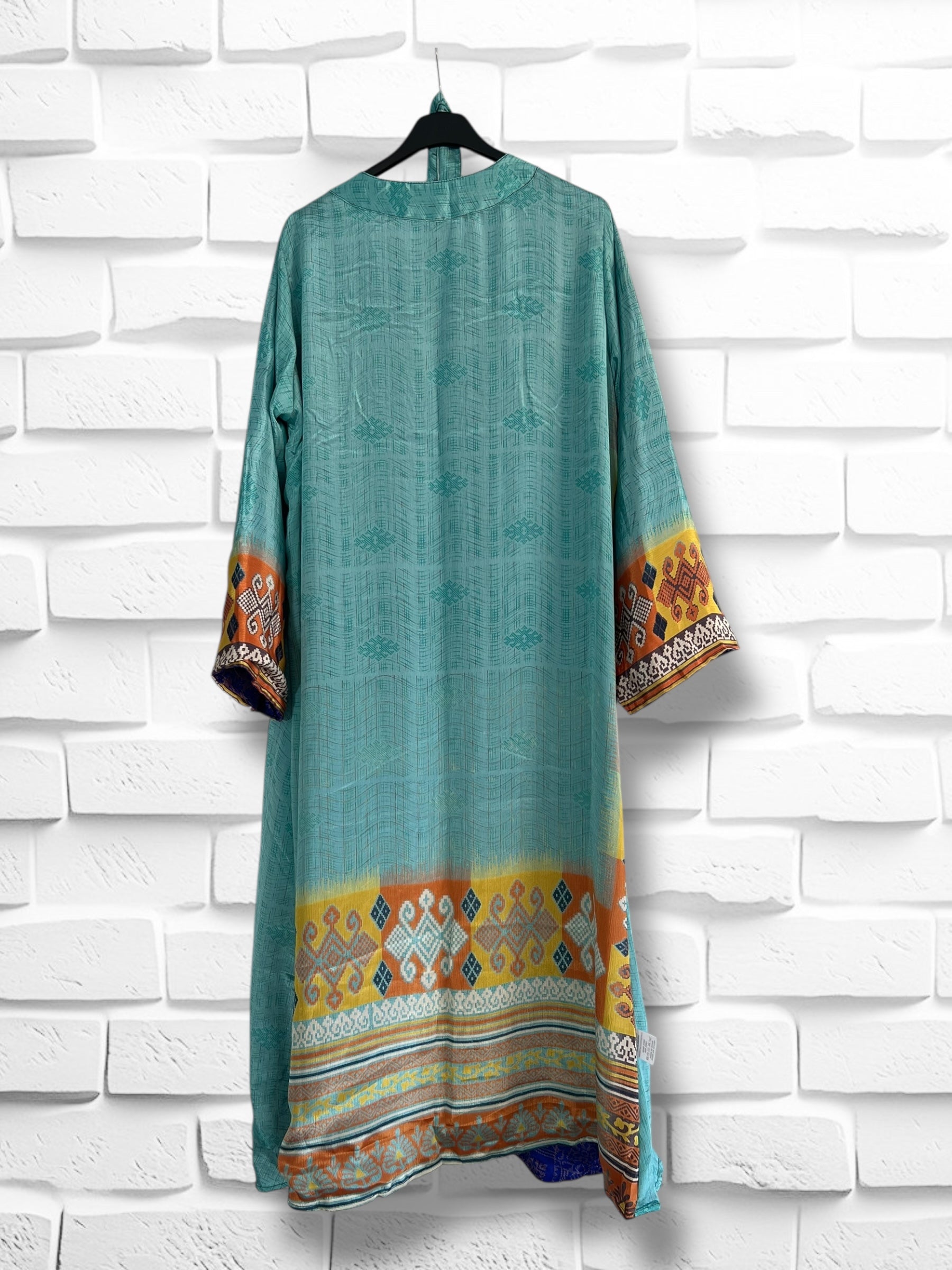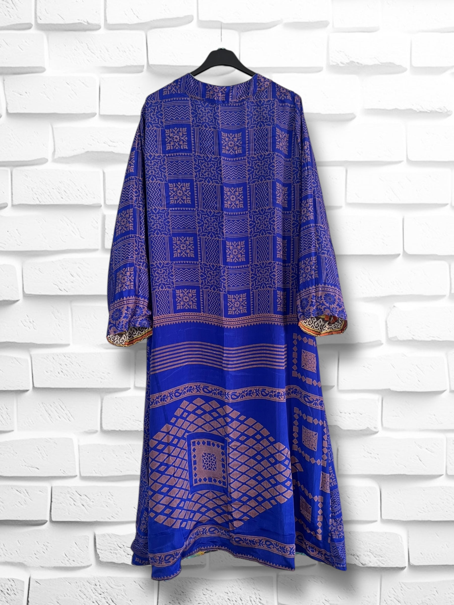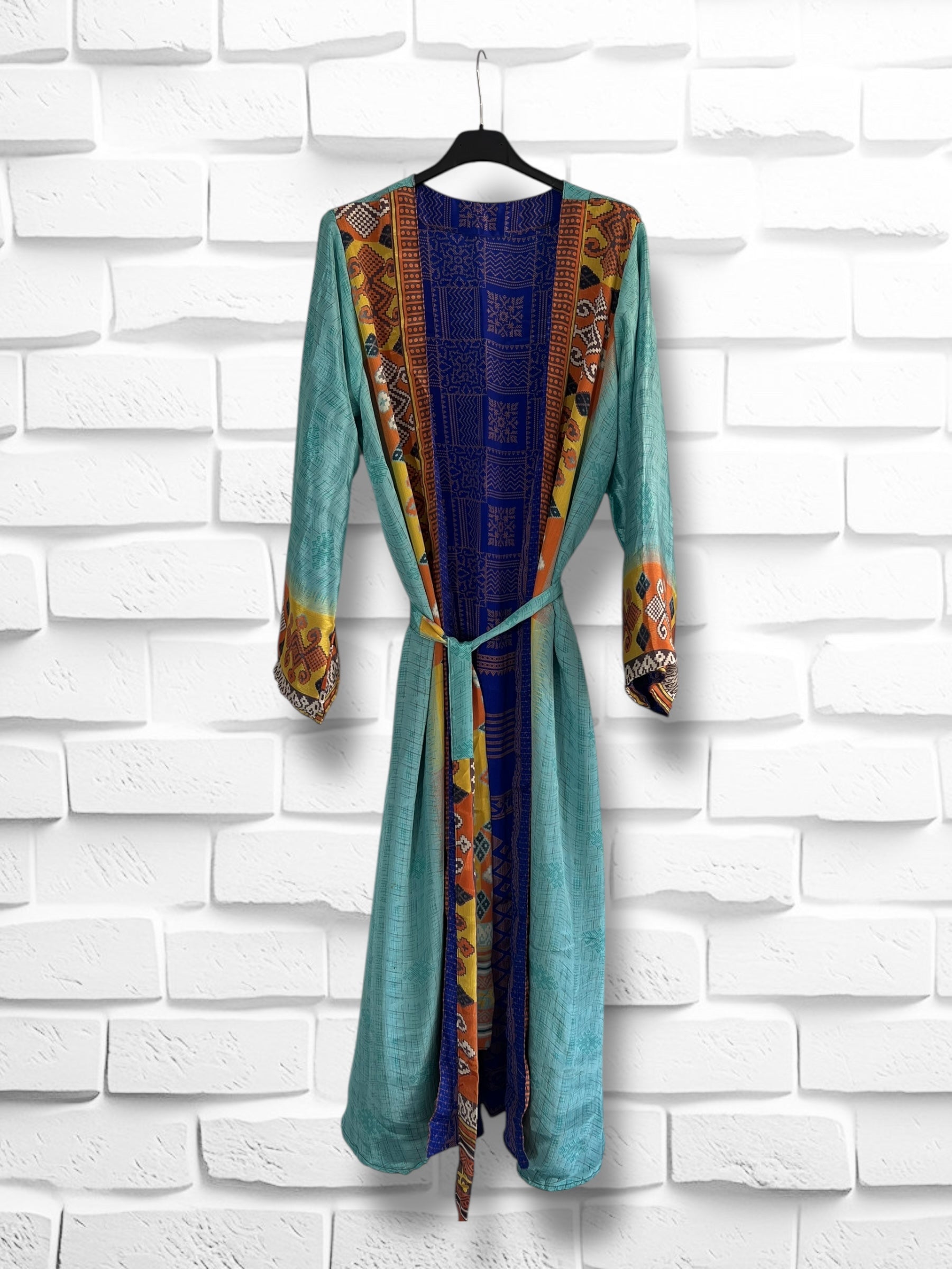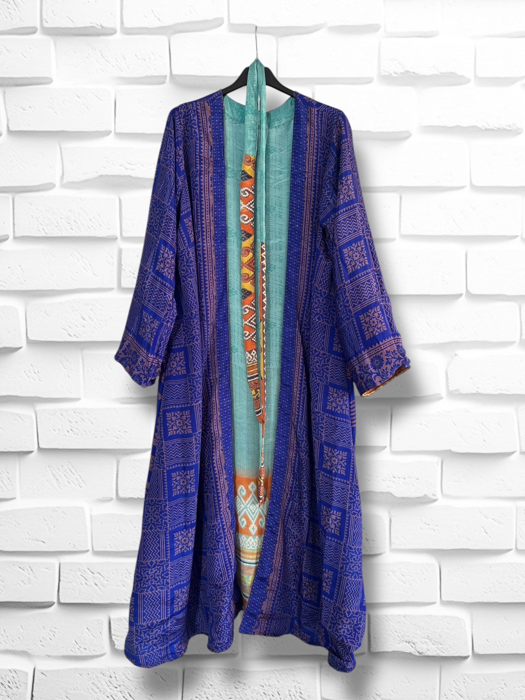 Kimono reversible confeccionado en seda reciclada, una prenda única y sostenible que combina elegancia y versatilidad. Su diseño de doble cara permite lucir dos estilos en una sola pieza, con patrones y colores cuidadosamente seleccionados para ofrecer un look sofisticado y atemporal. La seda reciclada aporta una textura suave y ligera, garantizando comodidad y fluidez en el movimiento. Ideal para usar como capa ligera sobre cualquier conjunto, este kimono fusiona tradición y modernidad con un enfoque eco-friendly.