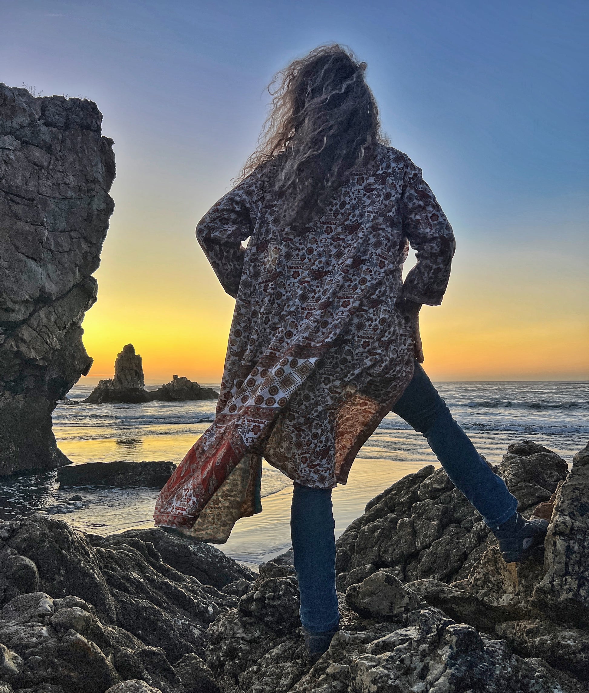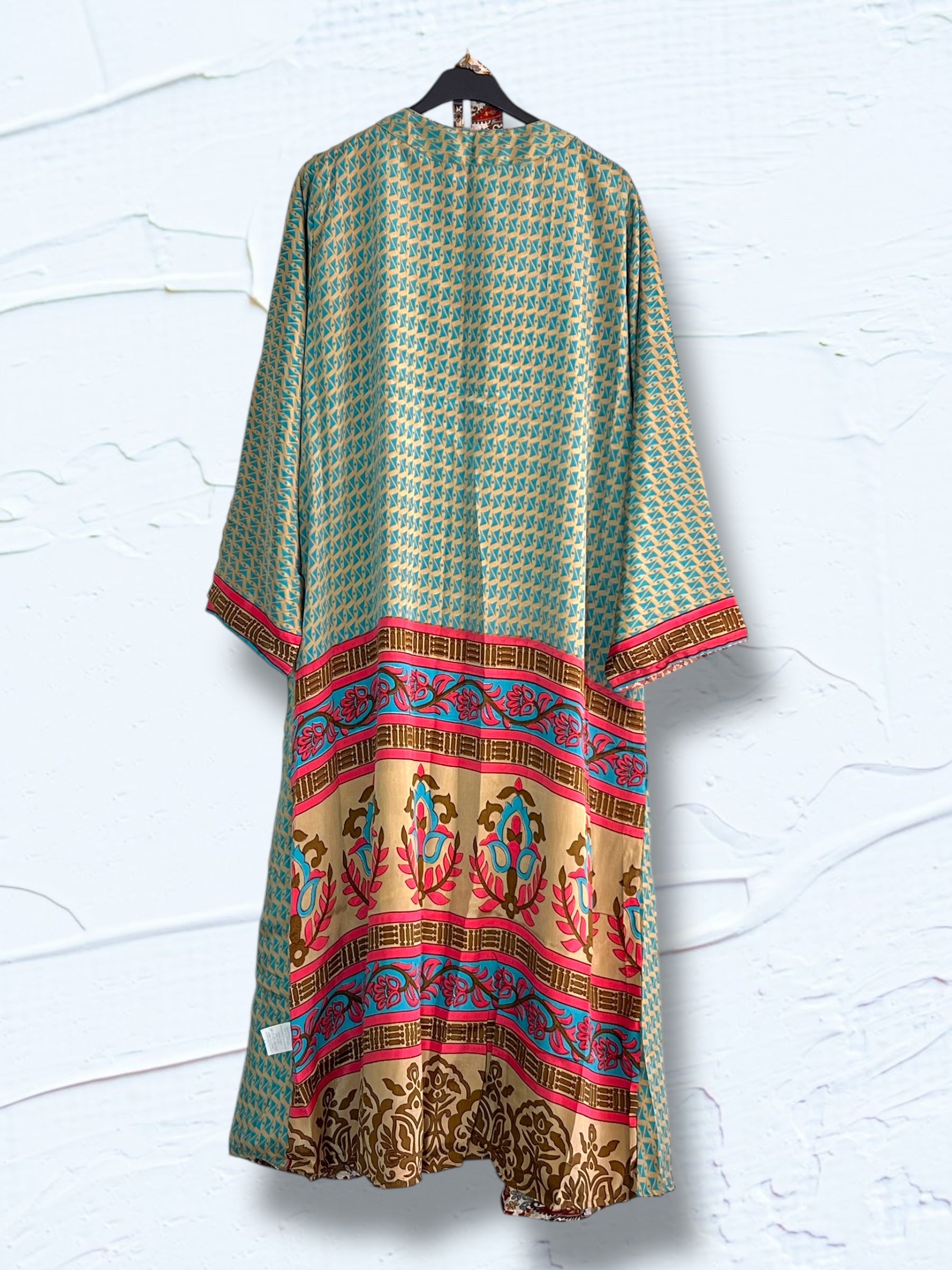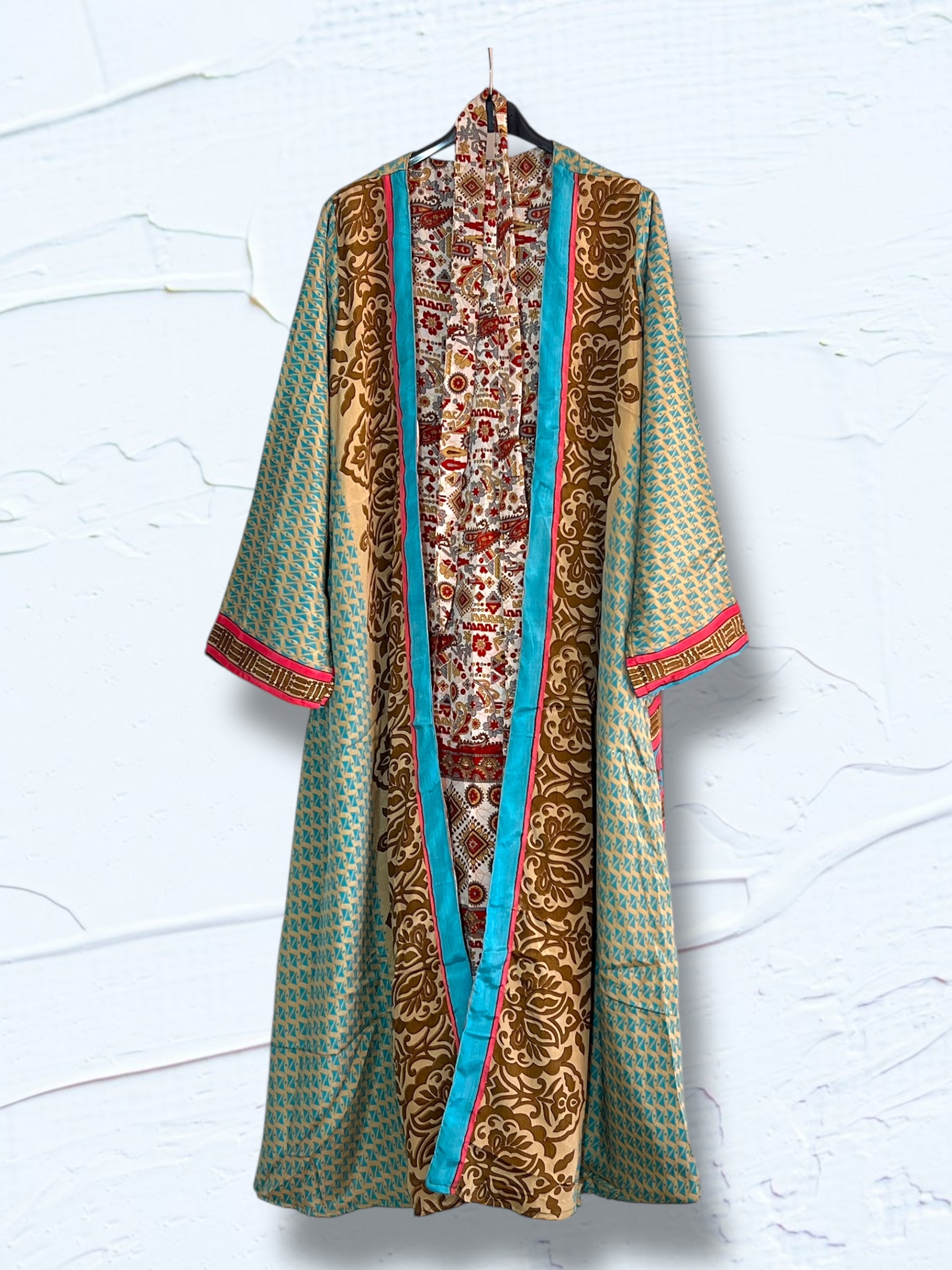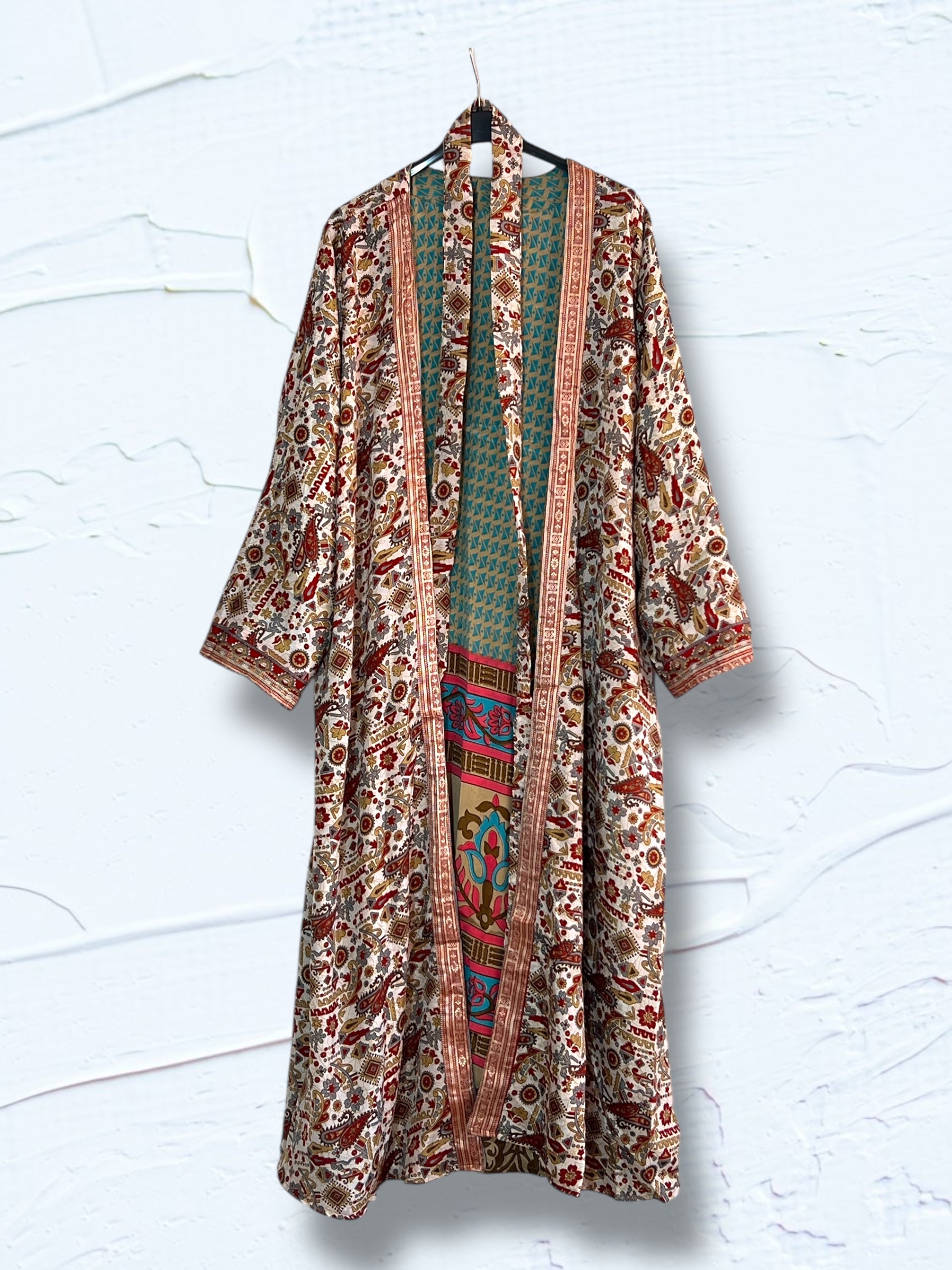 Kimono reversible confeccionado en seda reciclada, una prenda única y sostenible que combina elegancia y versatilidad. Su diseño de doble cara permite lucir dos estilos en una sola pieza, con patrones y colores cuidadosamente seleccionados para ofrecer un look sofisticado y atemporal. La seda reciclada aporta una textura suave y ligera, garantizando comodidad y fluidez en el movimiento. Ideal para usar como capa ligera sobre cualquier conjunto, este kimono fusiona tradición y modernidad con un enfoque eco-friendly.