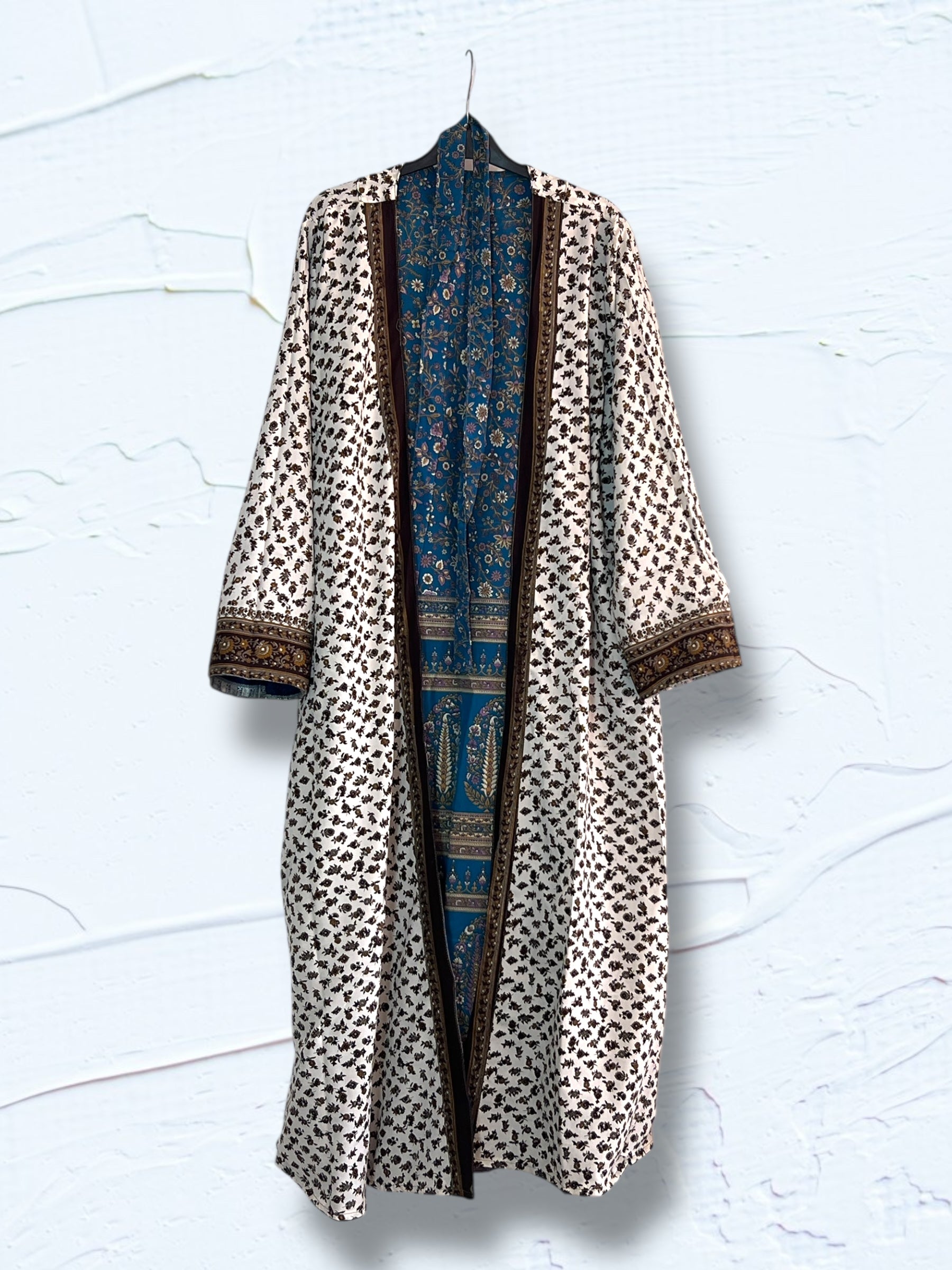 Kimono reversible confeccionado en seda reciclada, una prenda única y sostenible que combina elegancia y versatilidad. Su diseño de doble cara permite lucir dos estilos en una sola pieza, con patrones y colores cuidadosamente seleccionados para ofrecer un look sofisticado y atemporal. La seda reciclada aporta una textura suave y ligera, garantizando comodidad y fluidez en el movimiento. Ideal para usar como capa ligera sobre cualquier conjunto, este kimono fusiona tradición y modernidad con un enfoque eco-friendly.