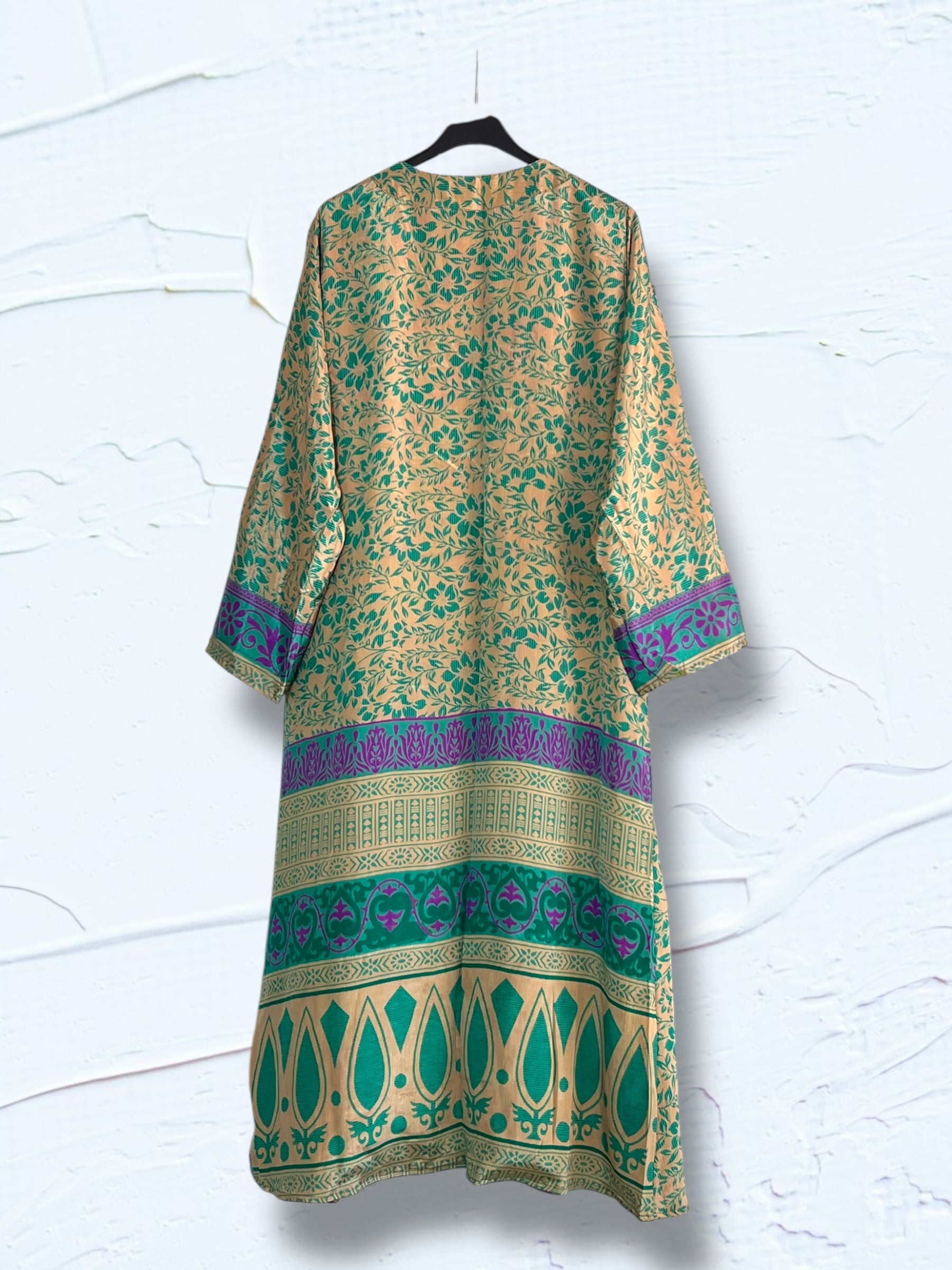 Kimono reversible confeccionado en seda reciclada, una prenda única y sostenible que combina elegancia y versatilidad. Su diseño de doble cara permite lucir dos estilos en una sola pieza, con patrones y colores cuidadosamente seleccionados para ofrecer un look sofisticado y atemporal. La seda reciclada aporta una textura suave y ligera, garantizando comodidad y fluidez en el movimiento. Ideal para usar como capa ligera sobre cualquier conjunto, este kimono fusiona tradición y modernidad con un enfoque eco-friendly.