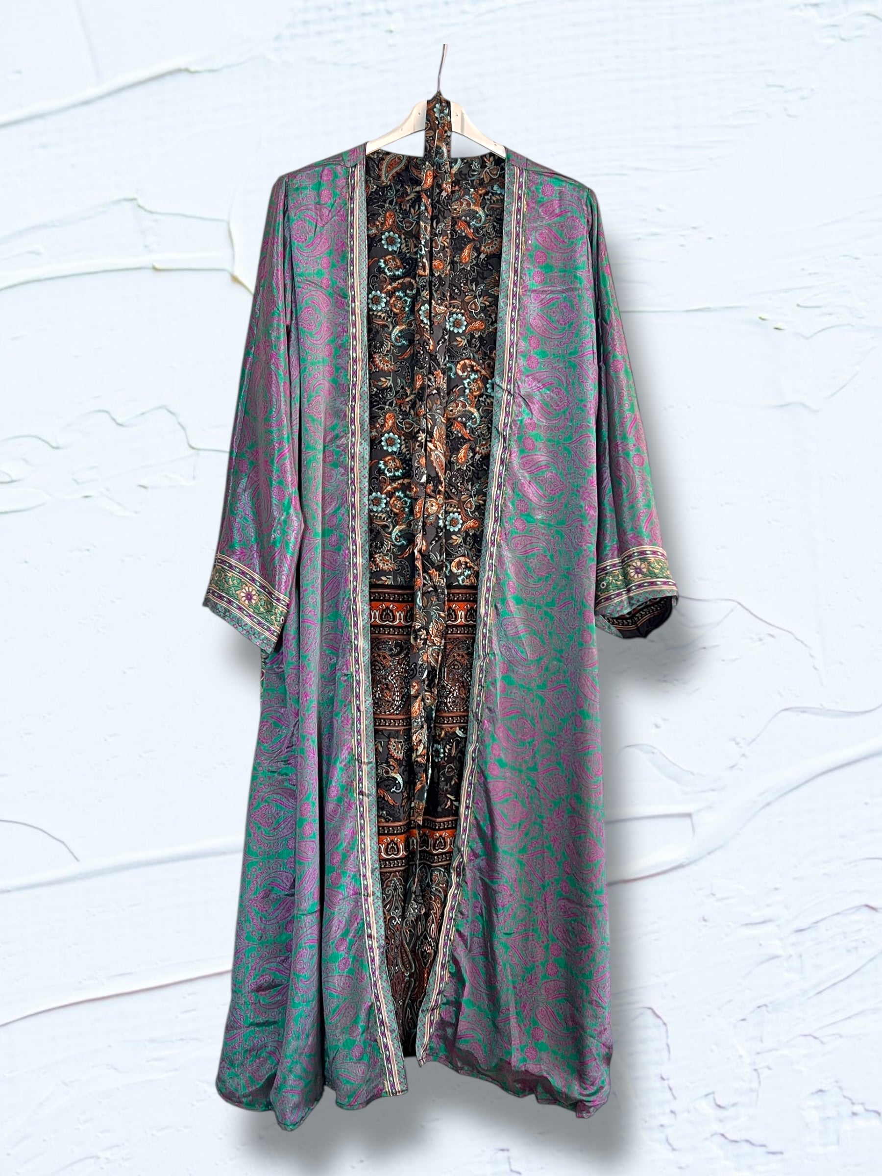 Kimono reversible confeccionado en seda reciclada, una prenda única y sostenible que combina elegancia y versatilidad. Su diseño de doble cara permite lucir dos estilos en una sola pieza, con patrones y colores cuidadosamente seleccionados para ofrecer un look sofisticado y atemporal. La seda reciclada aporta una textura suave y ligera, garantizando comodidad y fluidez en el movimiento. Ideal para usar como capa ligera sobre cualquier conjunto, este kimono fusiona tradición y modernidad con un enfoque eco-friendly.