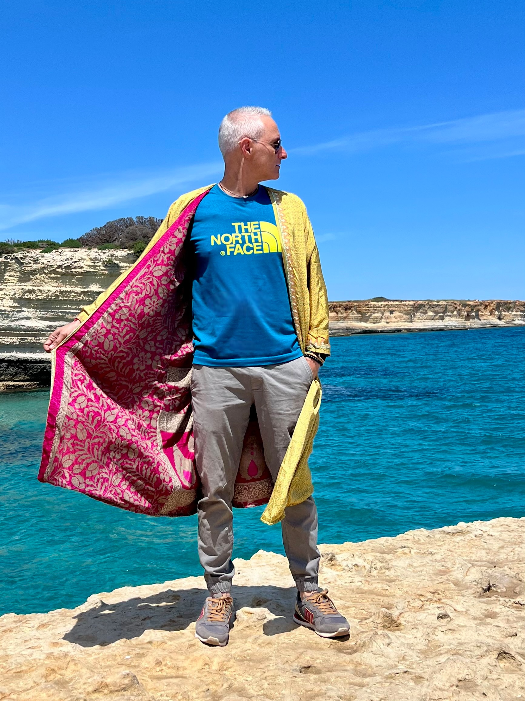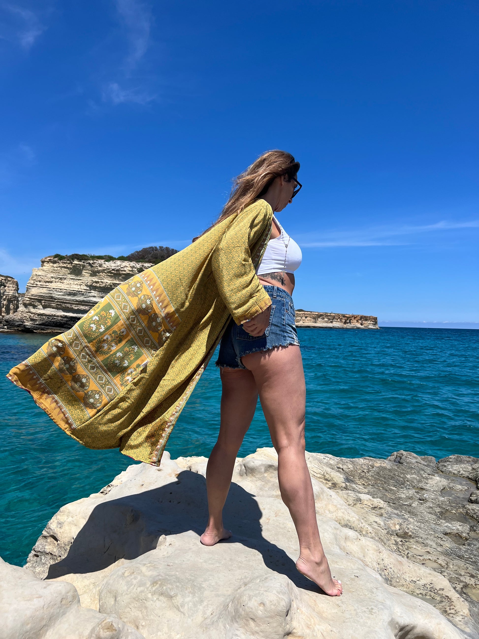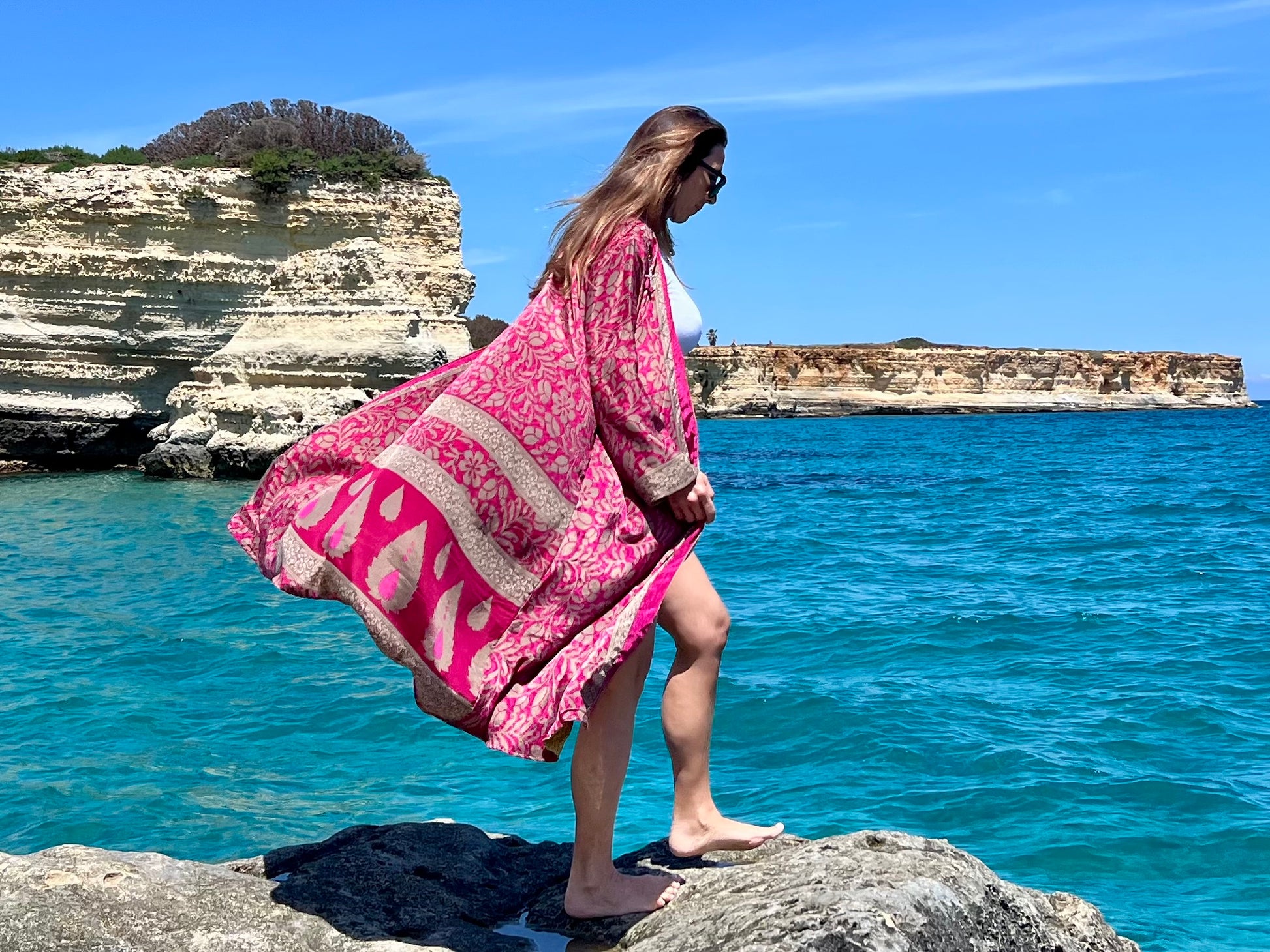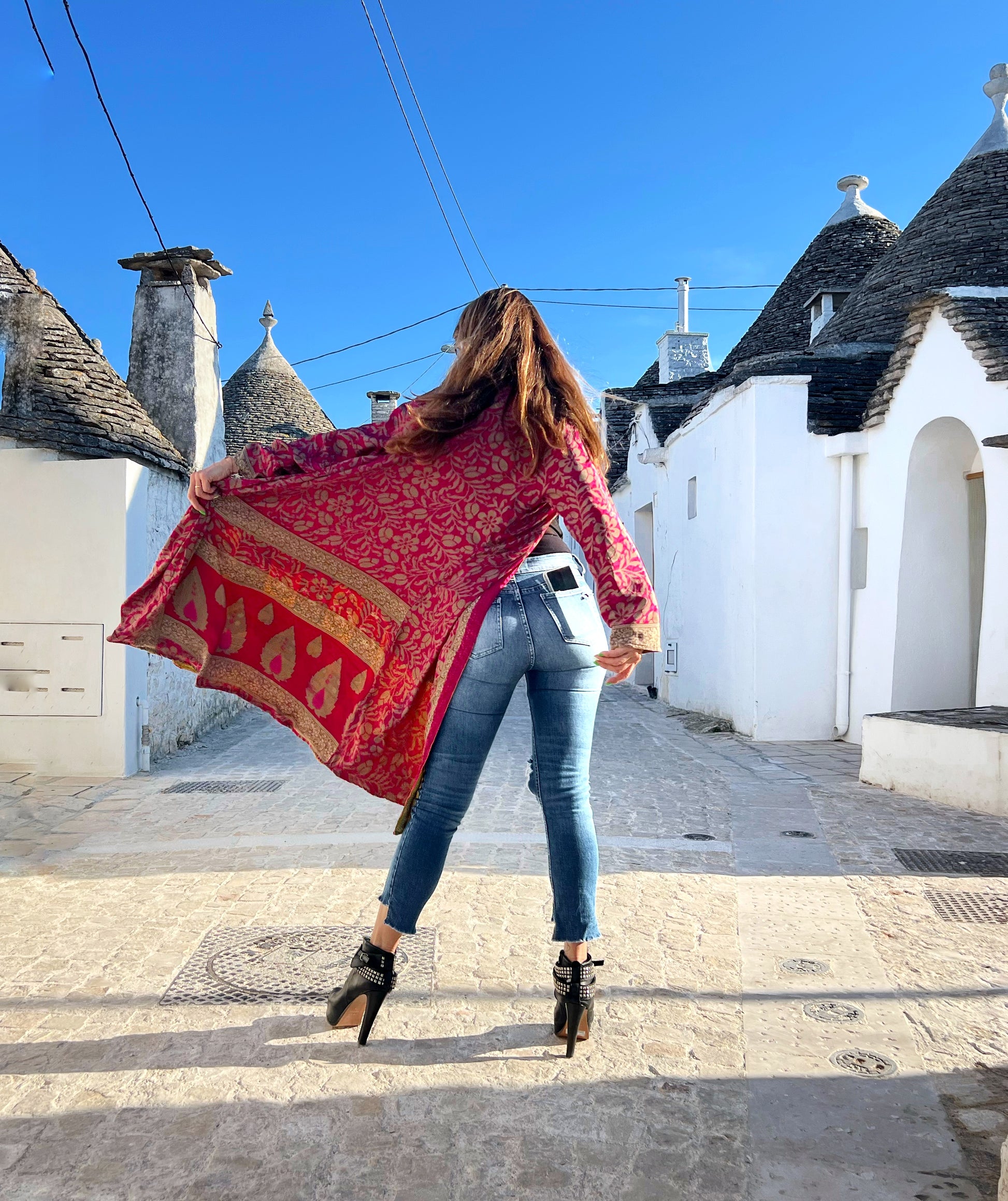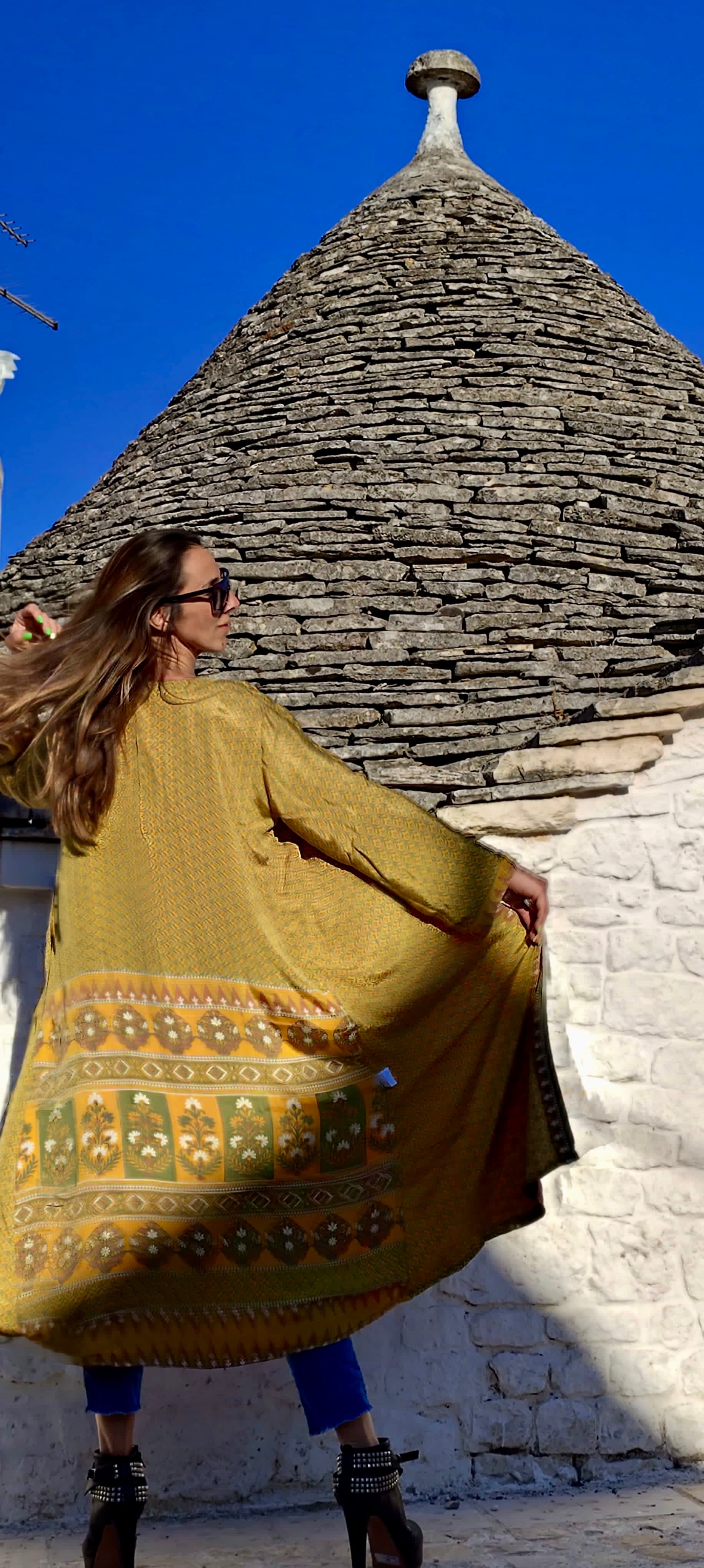 Este kimono unisex está confeccionado con seda reciclada de alta calidad, proveniente de antiguos saris y textiles tradicionales, transformados en una prenda contemporánea con alma. Su diseño reversible presenta dos lados igualmente vibrantes, cada uno con colores, patrones y texturas únicas, permitiéndote elegir según tu estado de ánimo, la ocasión o el estilo del día.