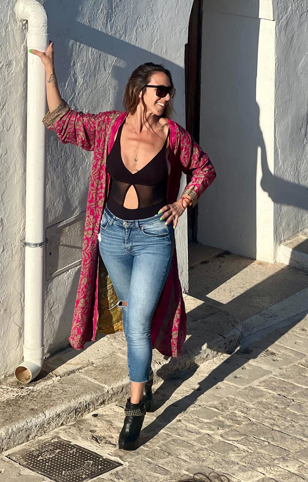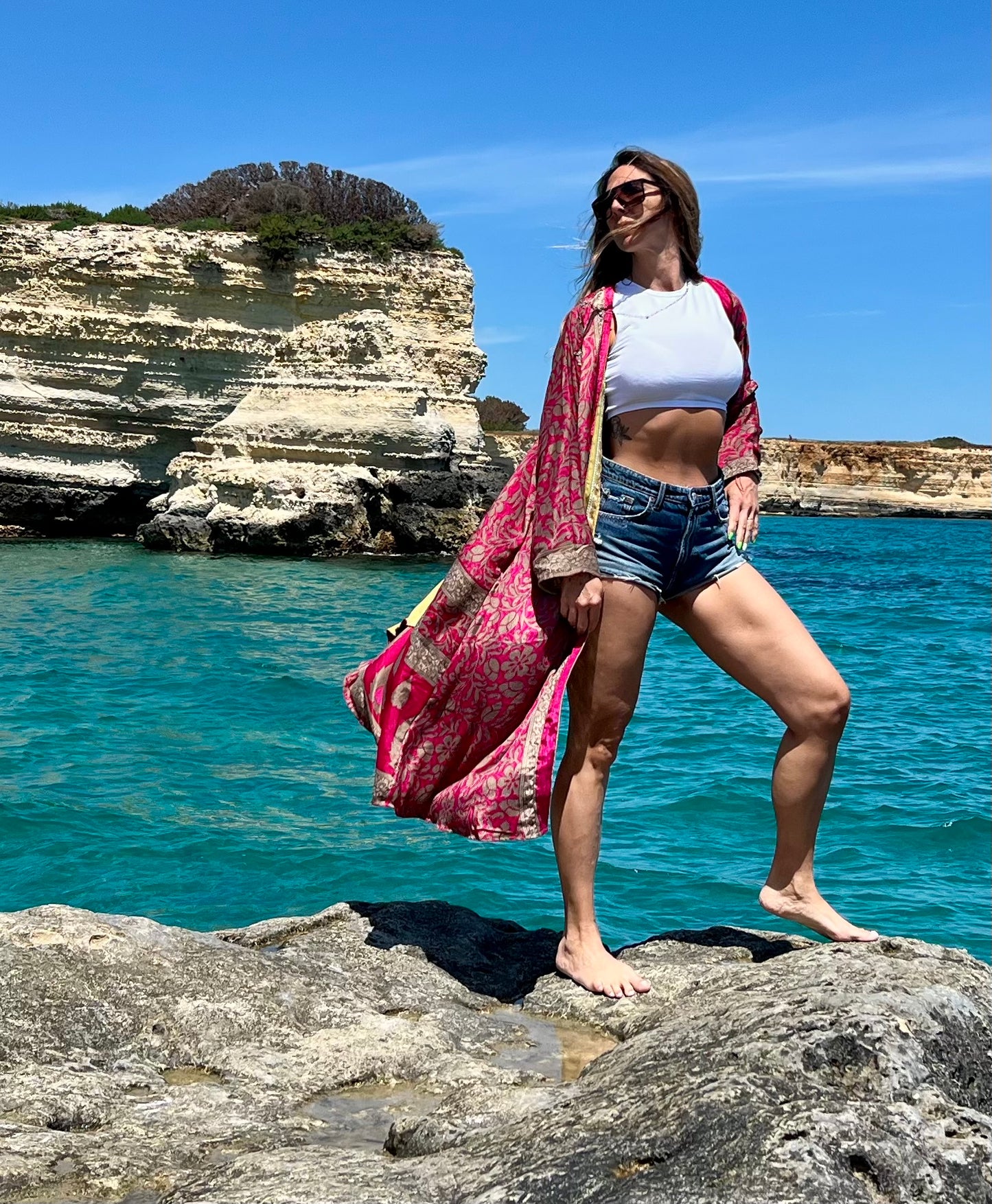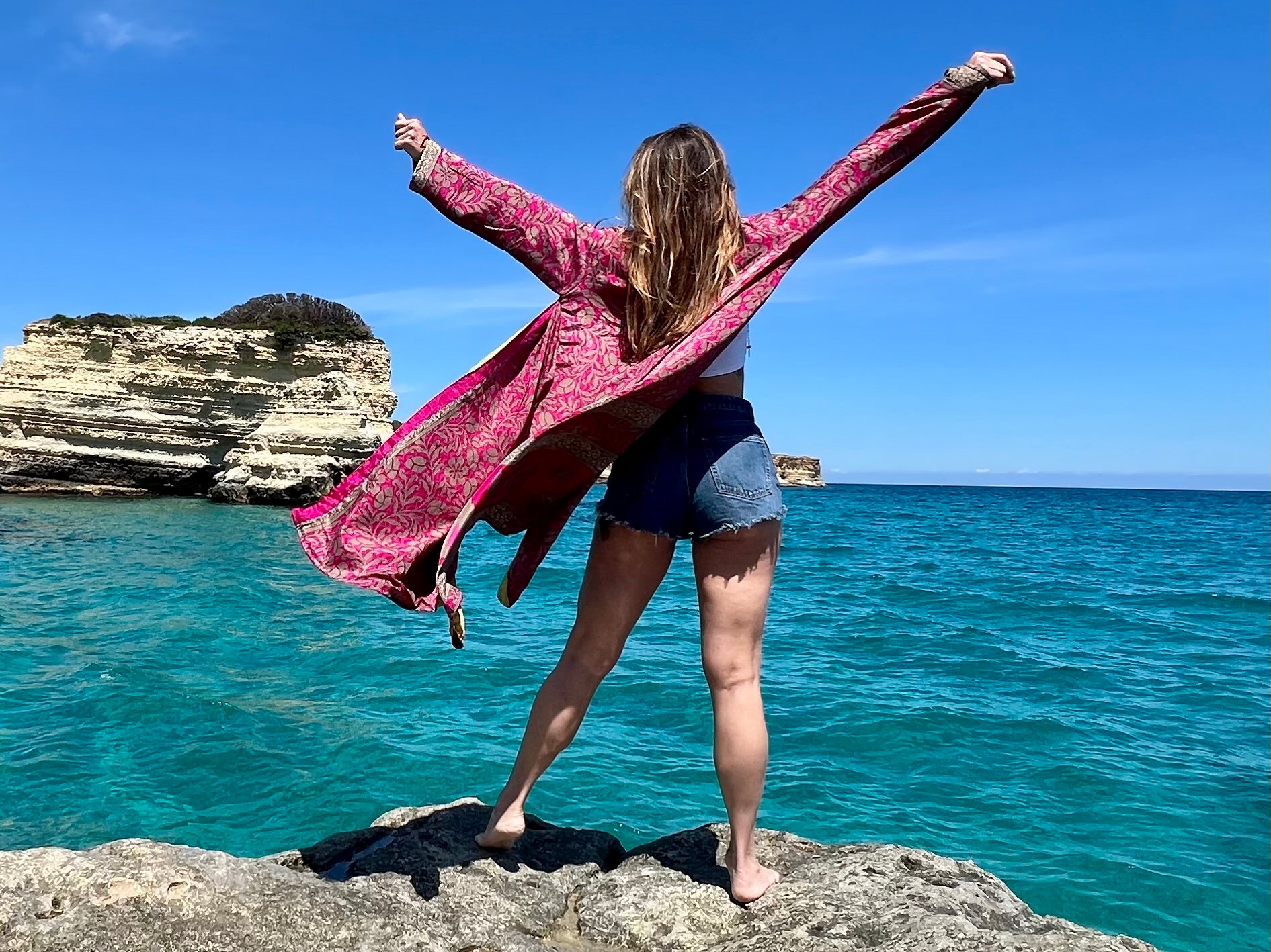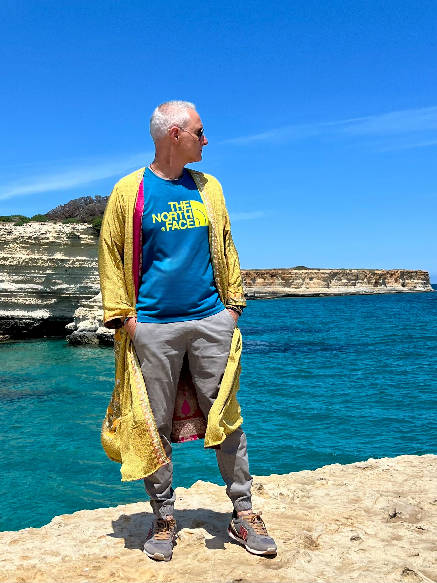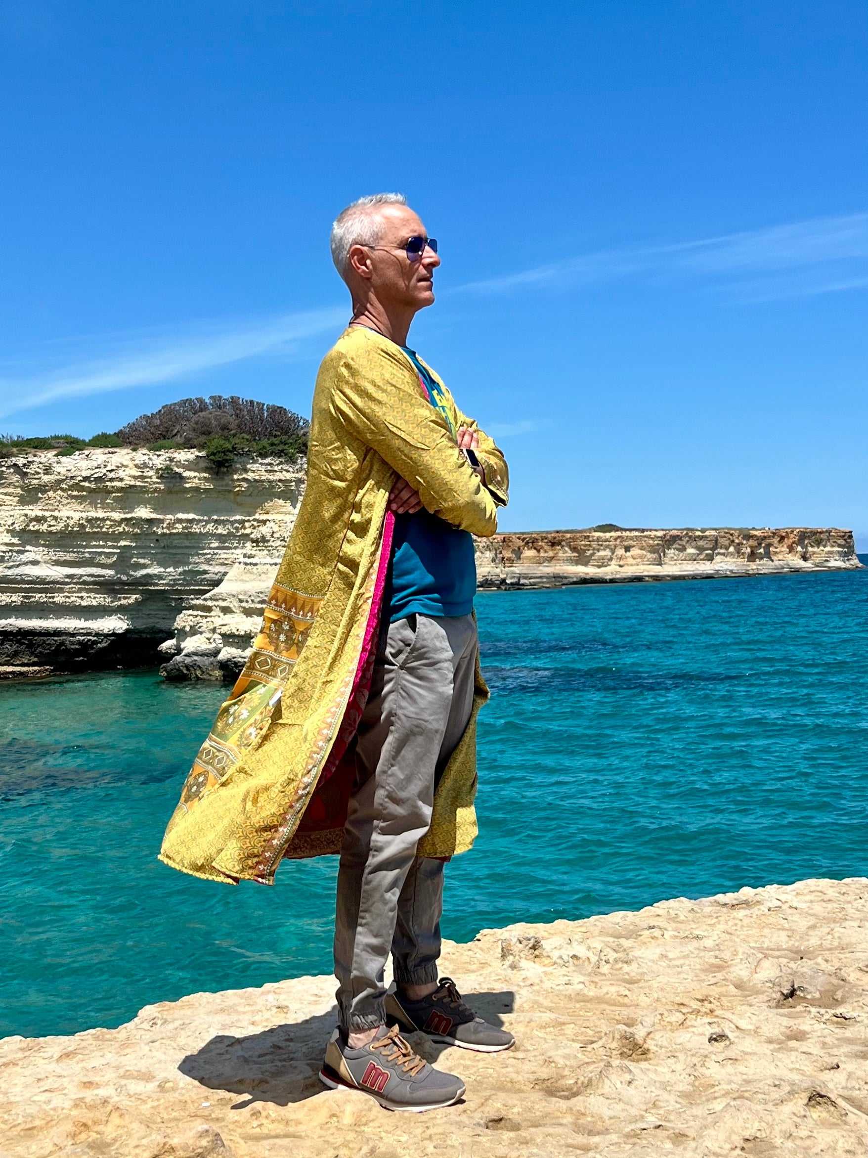 Este kimono unisex está confeccionado con seda reciclada de alta calidad, proveniente de antiguos saris y textiles tradicionales, transformados en una prenda contemporánea con alma. Su diseño reversible presenta dos lados igualmente vibrantes, cada uno con colores, patrones y texturas únicas, permitiéndote elegir según tu estado de ánimo, la ocasión o el estilo del día.