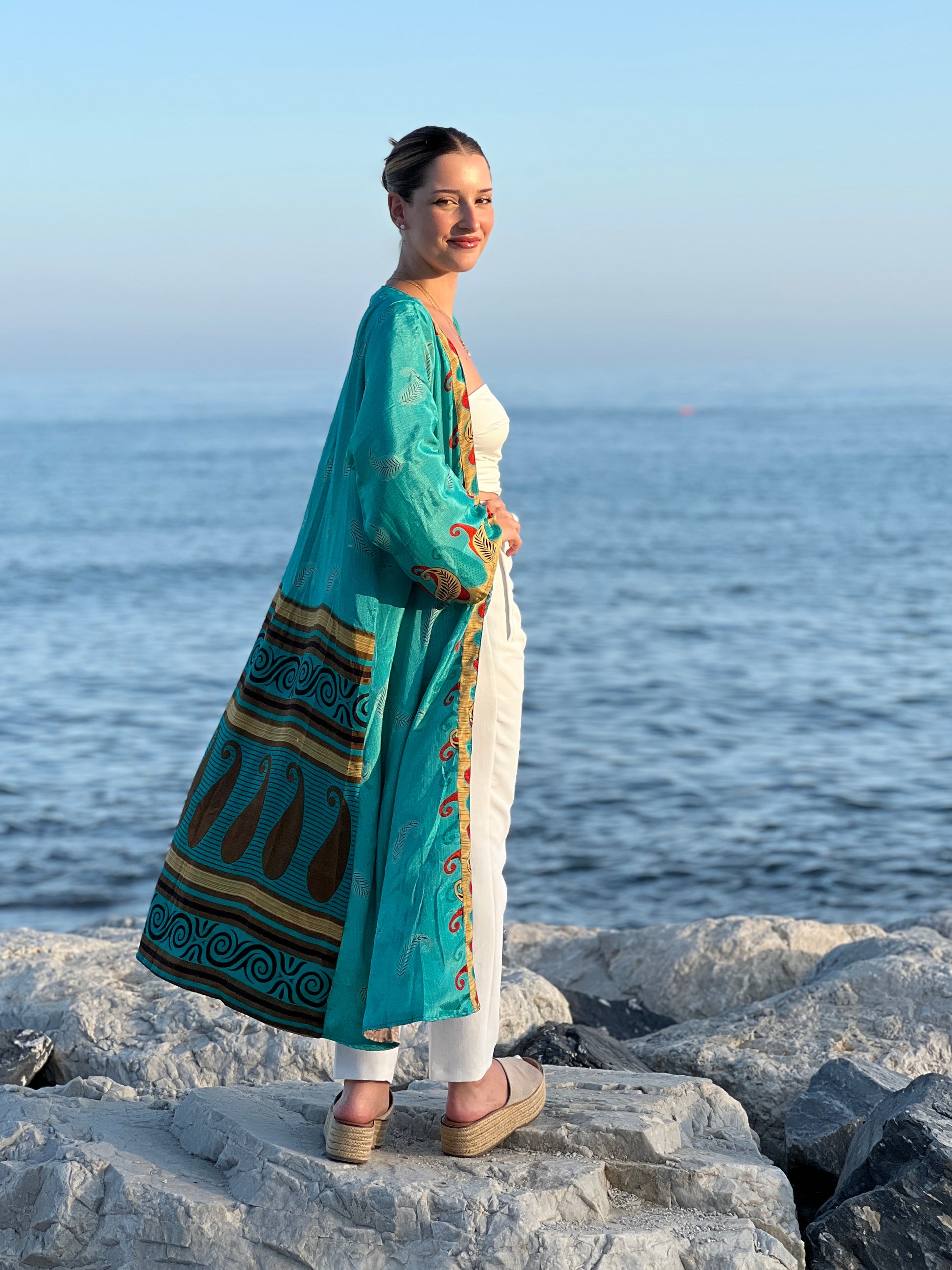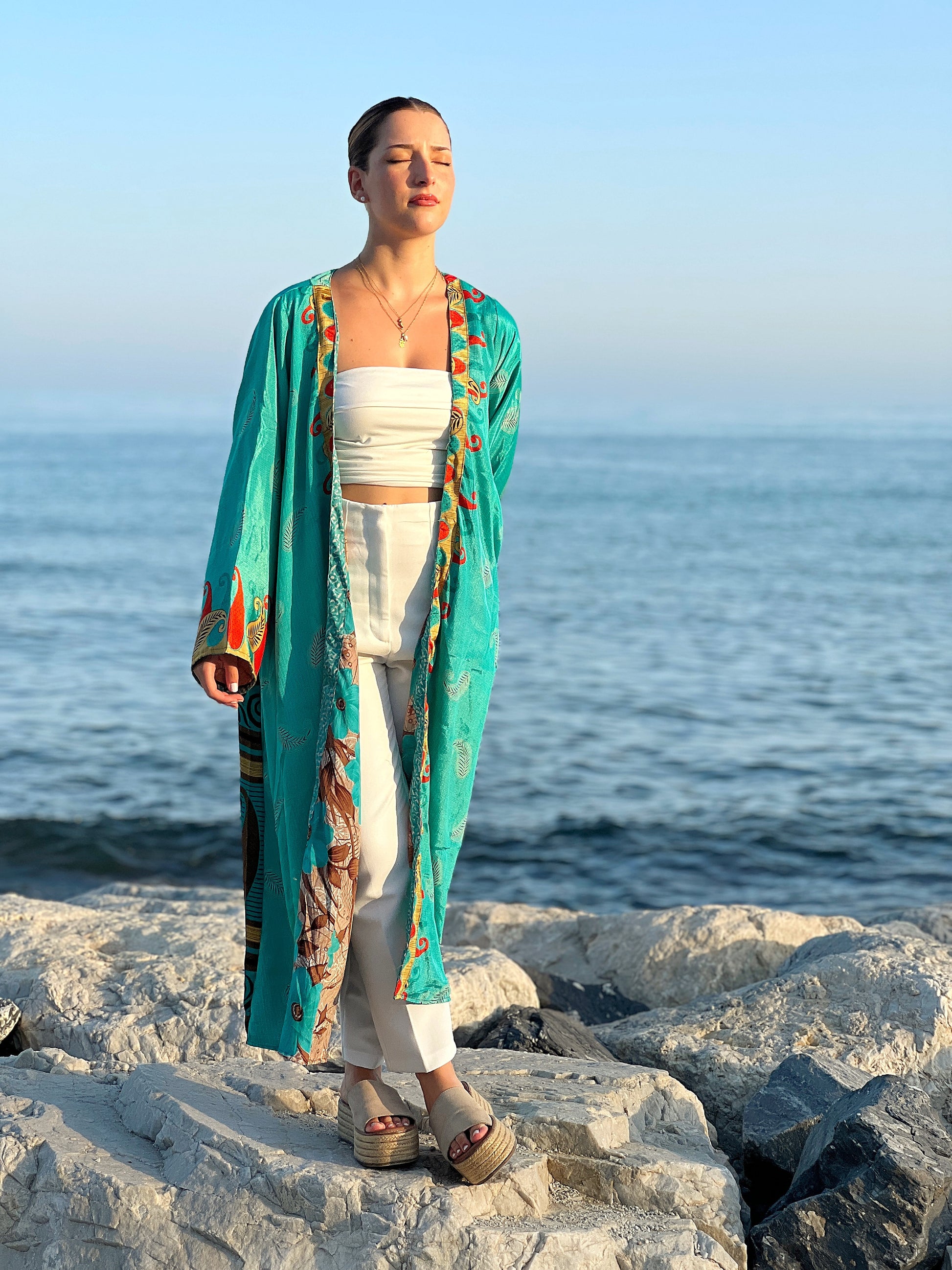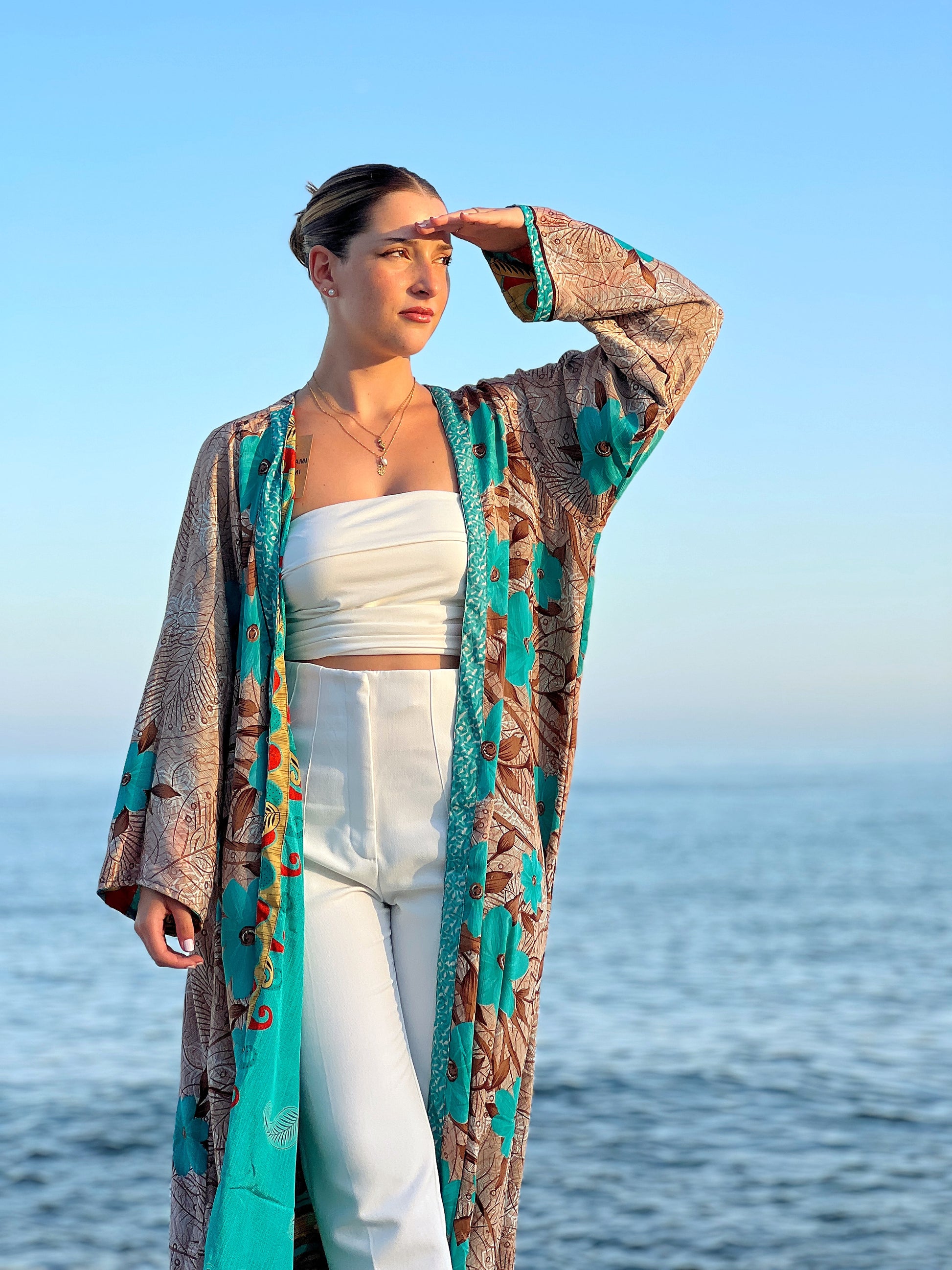 Este kimono unisex está confeccionado con seda reciclada de alta calidad, proveniente de antiguos saris y textiles tradicionales, transformados en una prenda contemporánea con alma. Su diseño reversible presenta dos lados igualmente vibrantes, cada uno con colores, patrones y texturas únicas, permitiéndote elegir según tu estado de ánimo, la ocasión o el estilo del día.