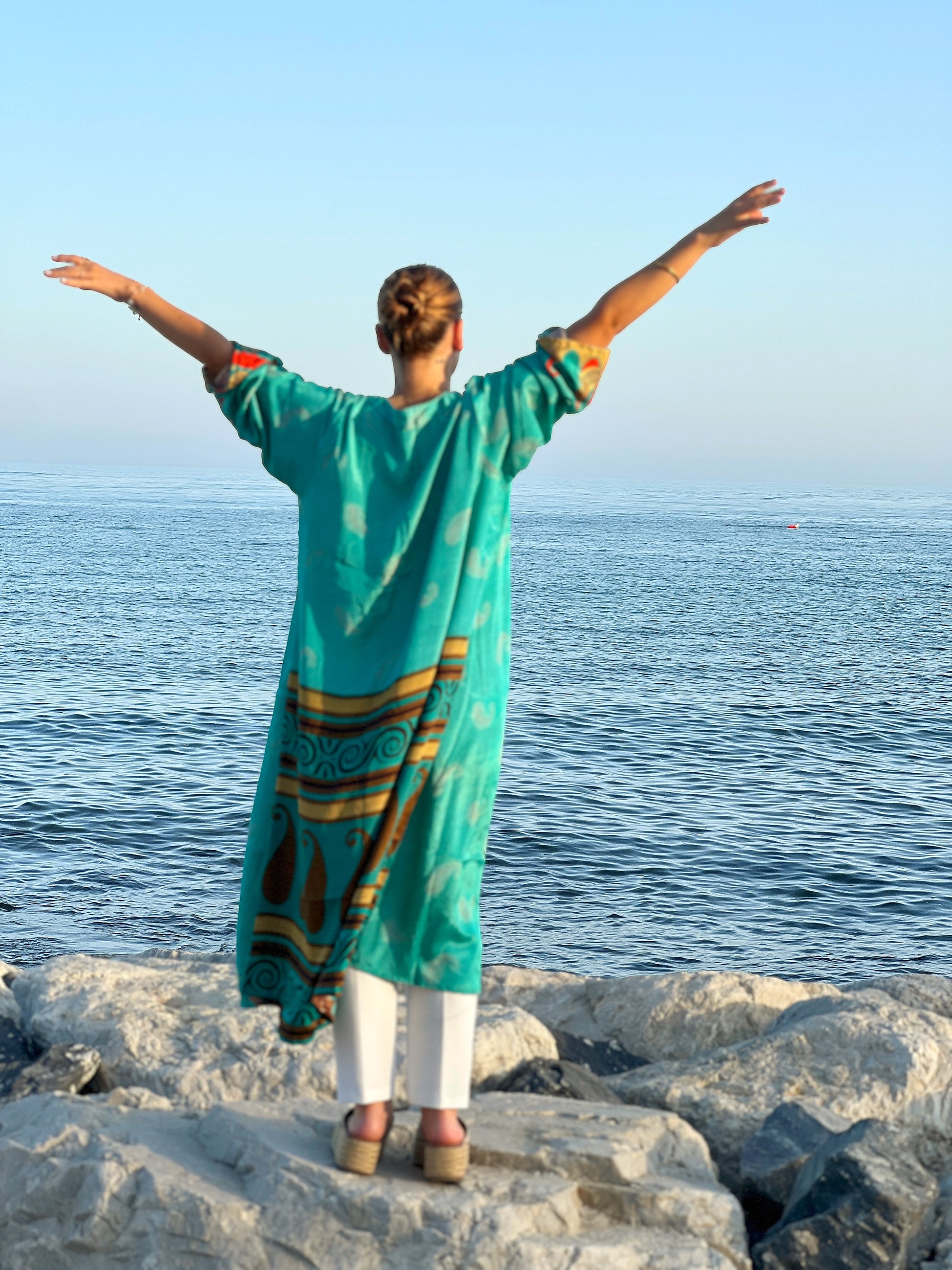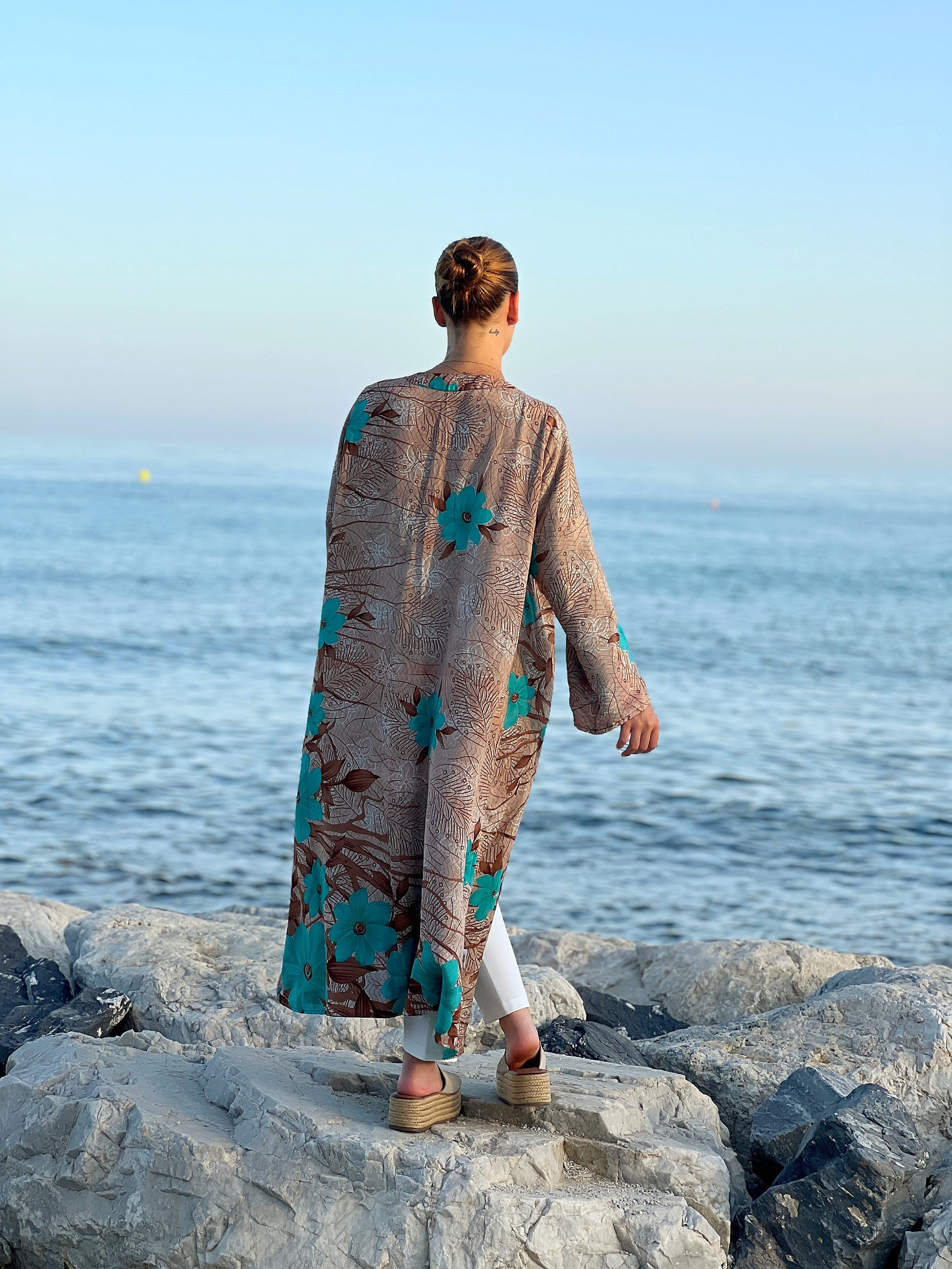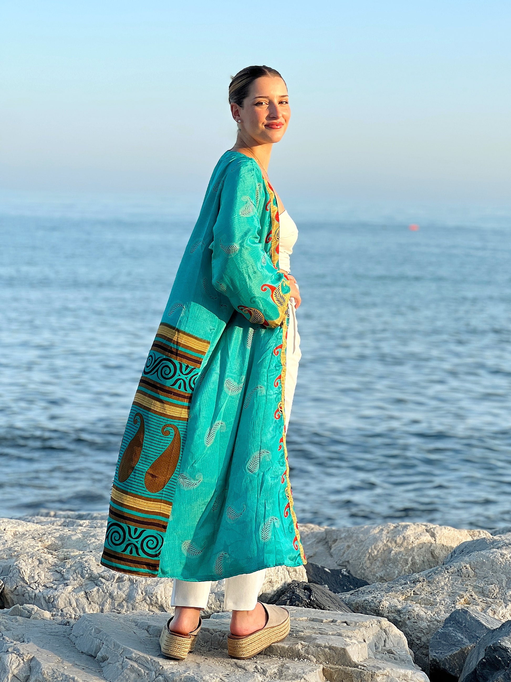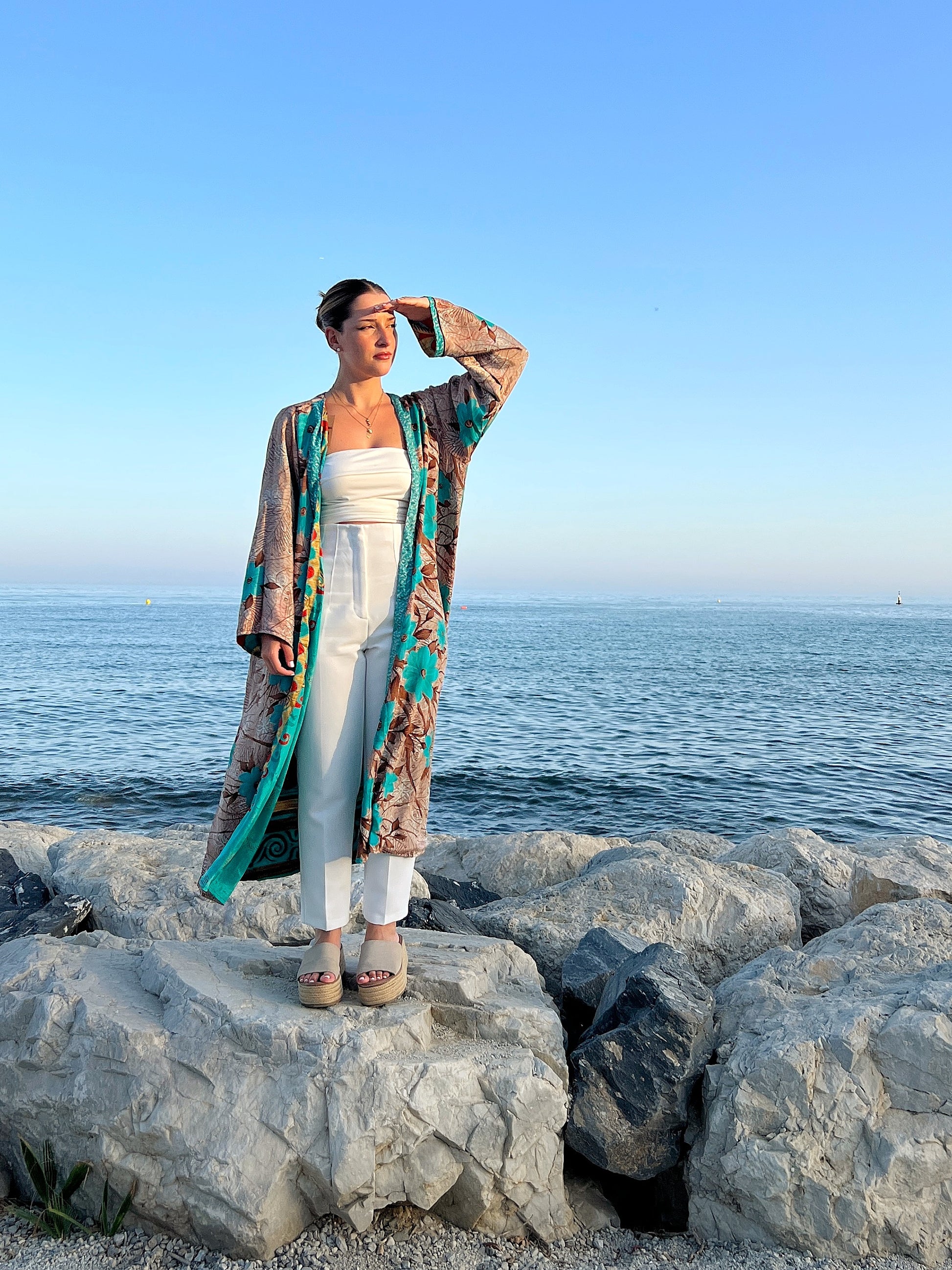 Este kimono unisex está confeccionado con seda reciclada de alta calidad, proveniente de antiguos saris y textiles tradicionales, transformados en una prenda contemporánea con alma. Su diseño reversible presenta dos lados igualmente vibrantes, cada uno con colores, patrones y texturas únicas, permitiéndote elegir según tu estado de ánimo, la ocasión o el estilo del día.