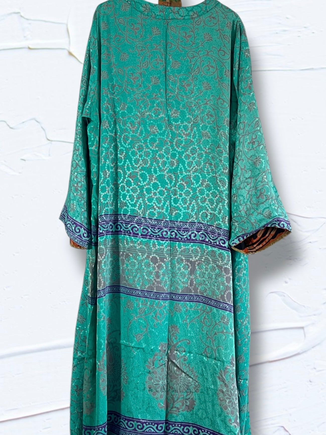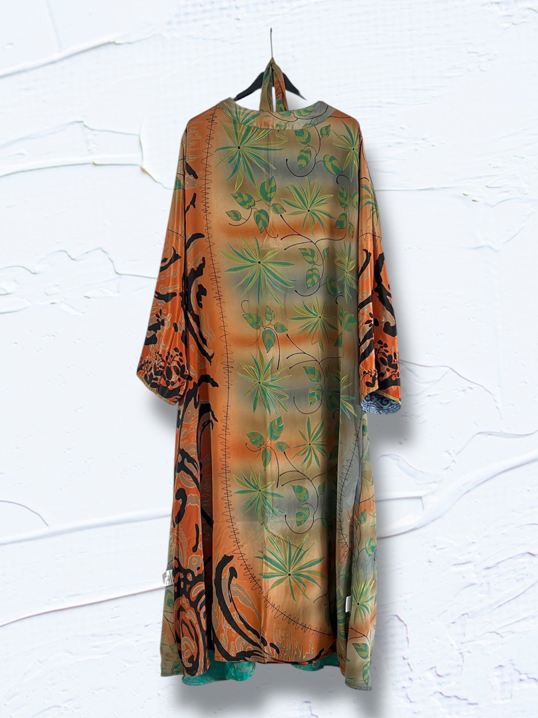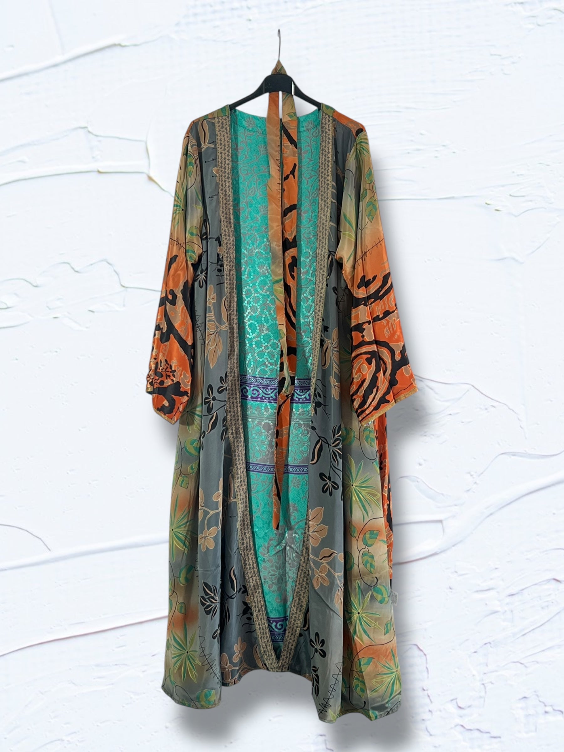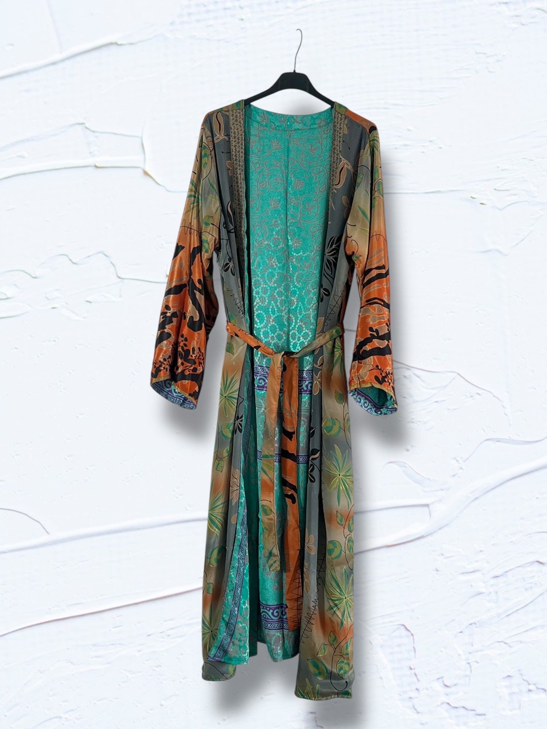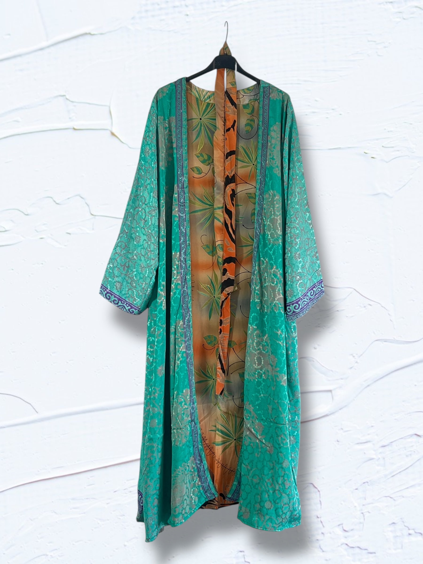Este kimono está confeccionado con seda reciclada de alta calidad, proveniente de antiguos saris y textiles tradicionales, transformados en una prenda contemporánea con alma. Su diseño reversible presenta dos lados igualmente vibrantes, cada uno con colores, patrones y texturas únicas, permitiéndote elegir según tu estado de ánimo, la ocasión o el estilo del día.