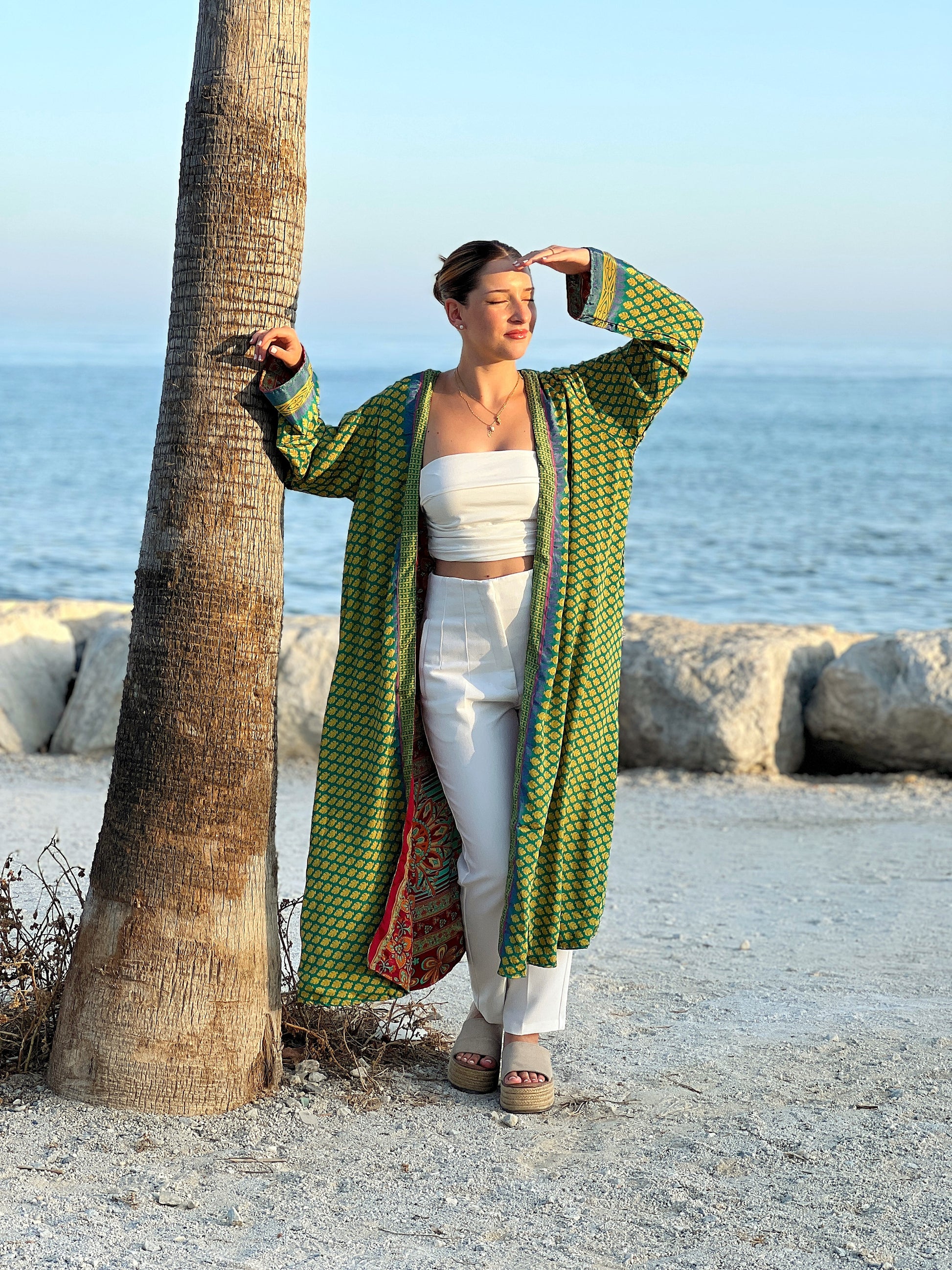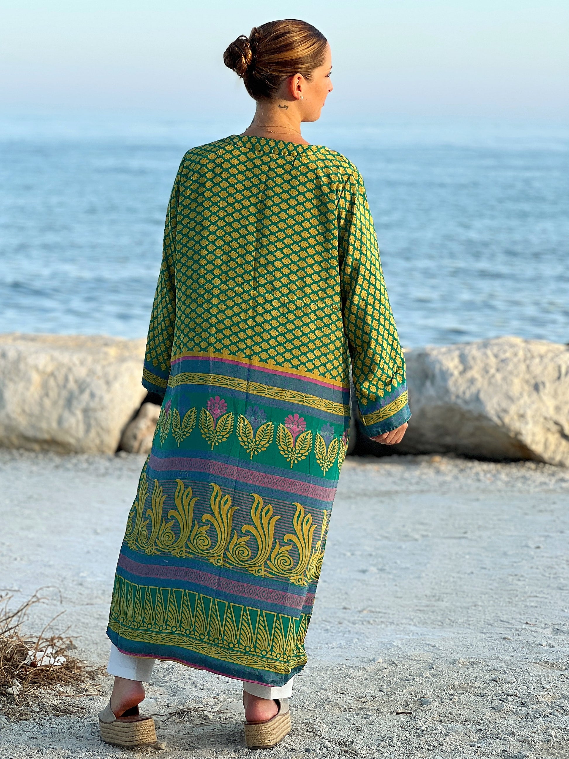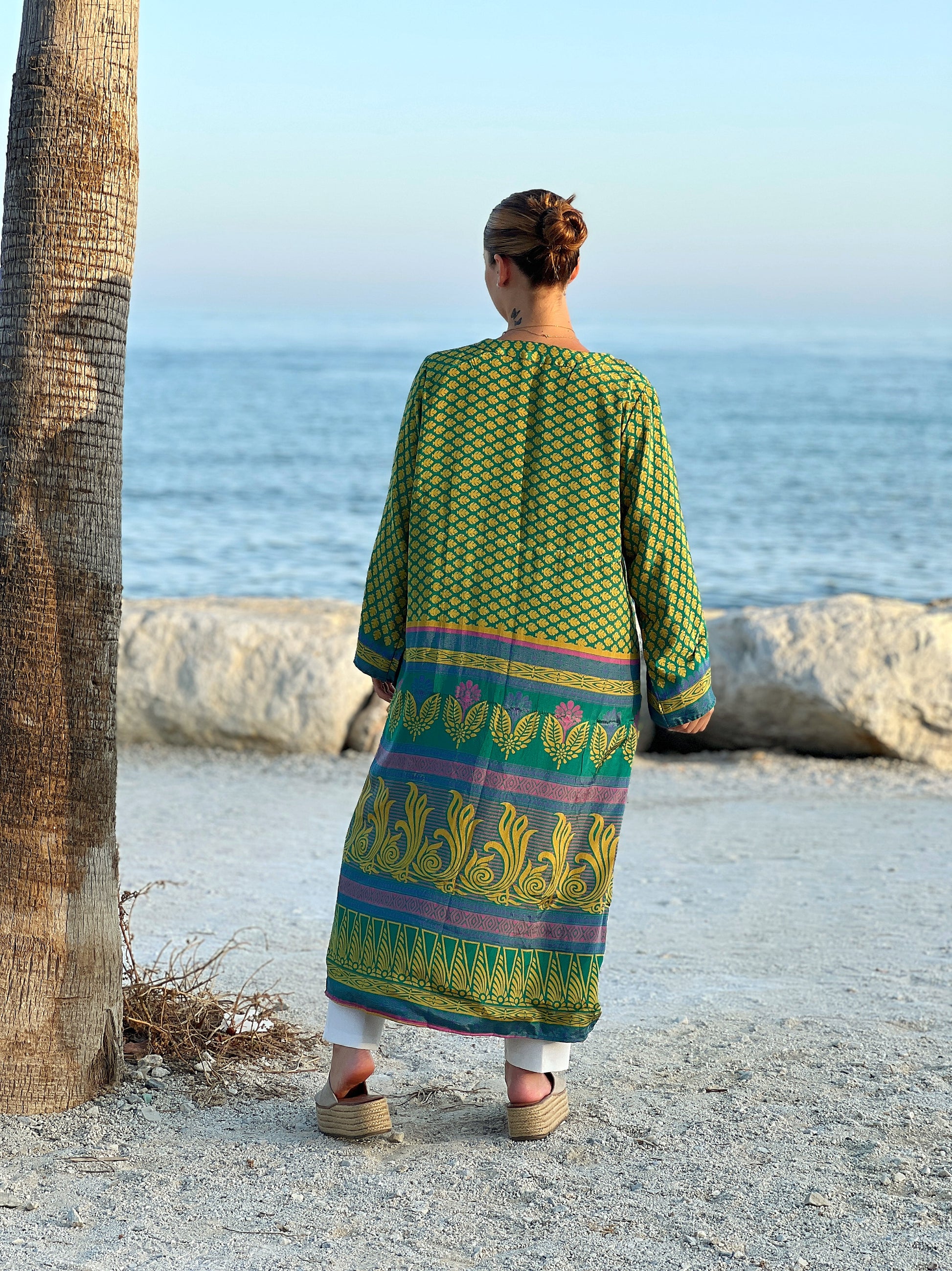 Este kimono unisex está confeccionado con seda reciclada de alta calidad, proveniente de antiguos saris y textiles tradicionales, transformados en una prenda contemporánea con alma. Su diseño reversible presenta dos lados igualmente vibrantes, cada uno con colores, patrones y texturas únicas, permitiéndote elegir según tu estado de ánimo, la ocasión o el estilo del día.