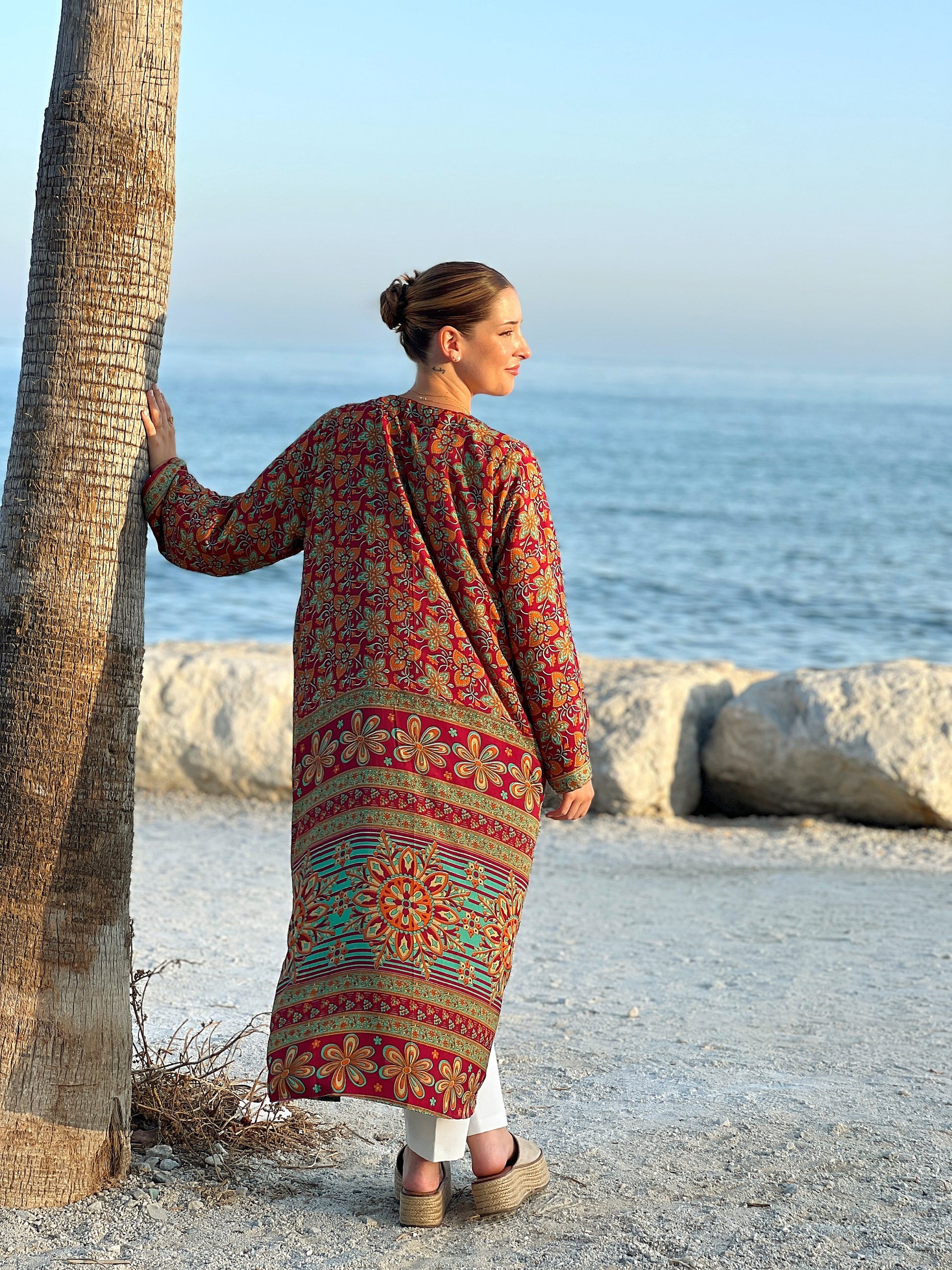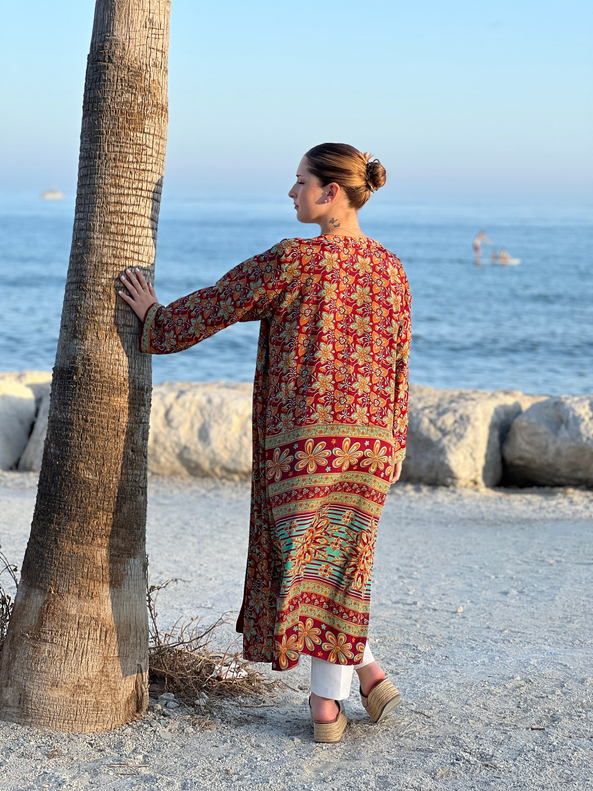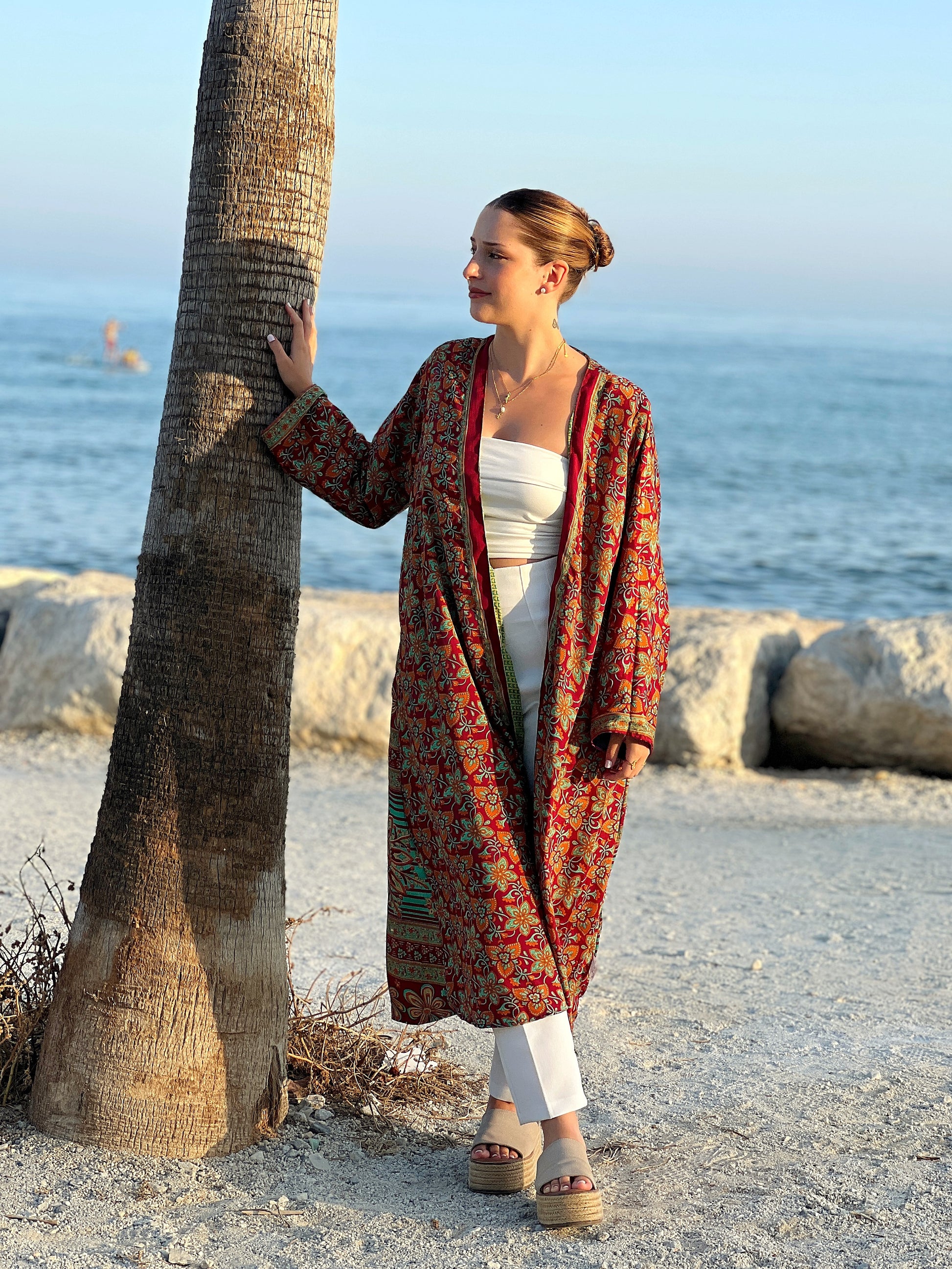 Este kimono unisex está confeccionado con seda reciclada de alta calidad, proveniente de antiguos saris y textiles tradicionales, transformados en una prenda contemporánea con alma. Su diseño reversible presenta dos lados igualmente vibrantes, cada uno con colores, patrones y texturas únicas, permitiéndote elegir según tu estado de ánimo, la ocasión o el estilo del día.