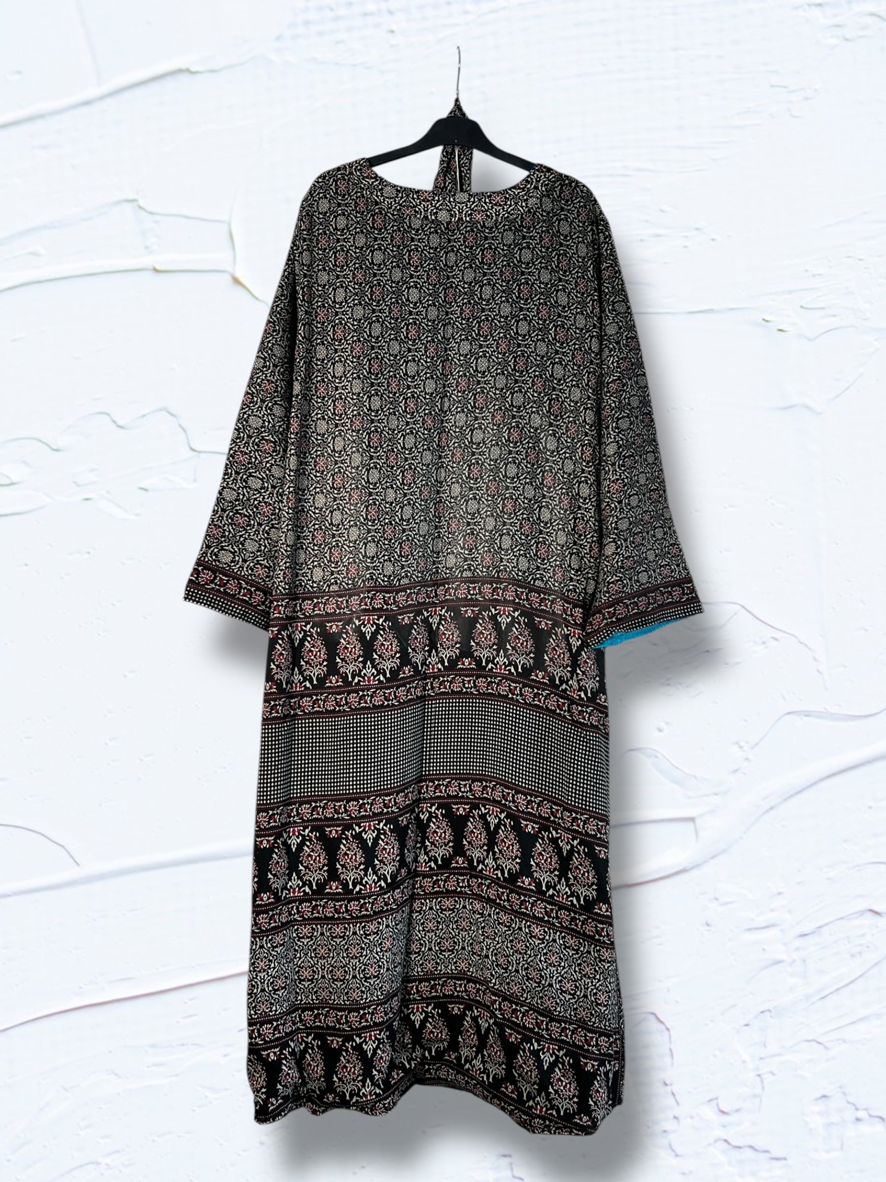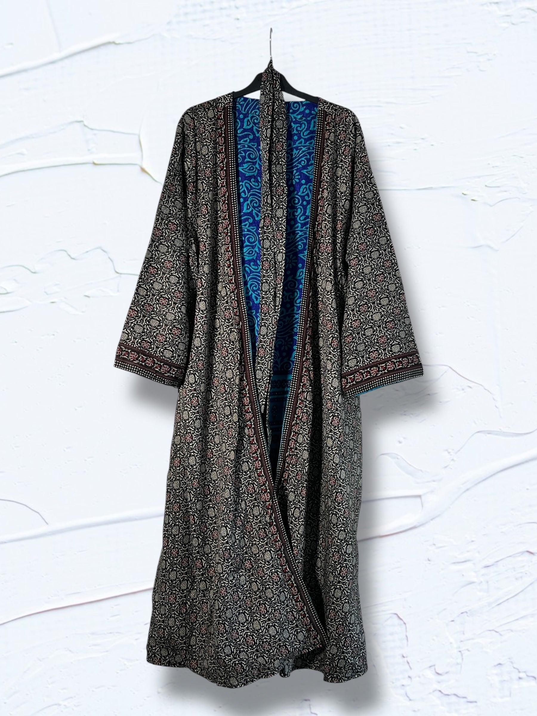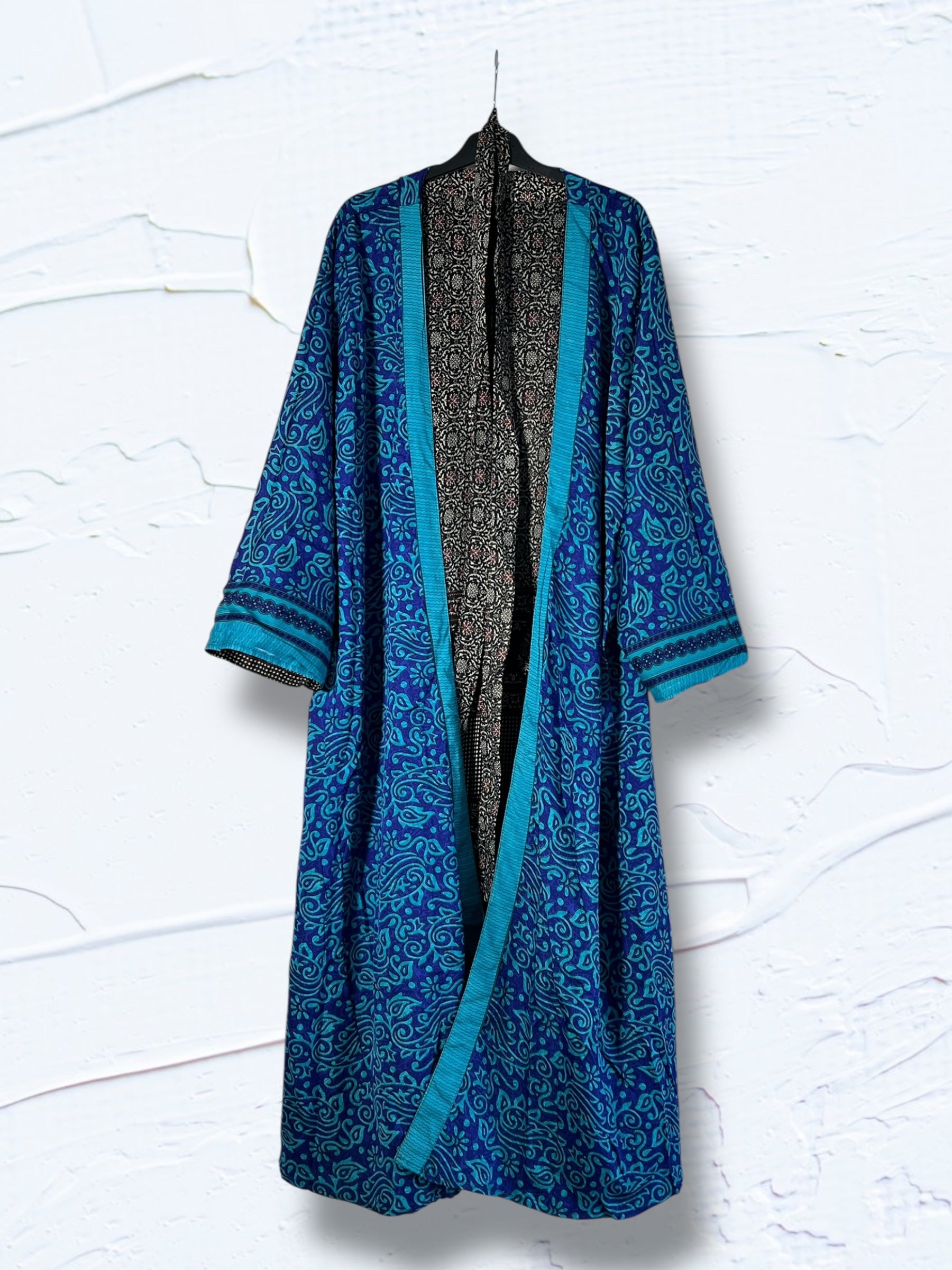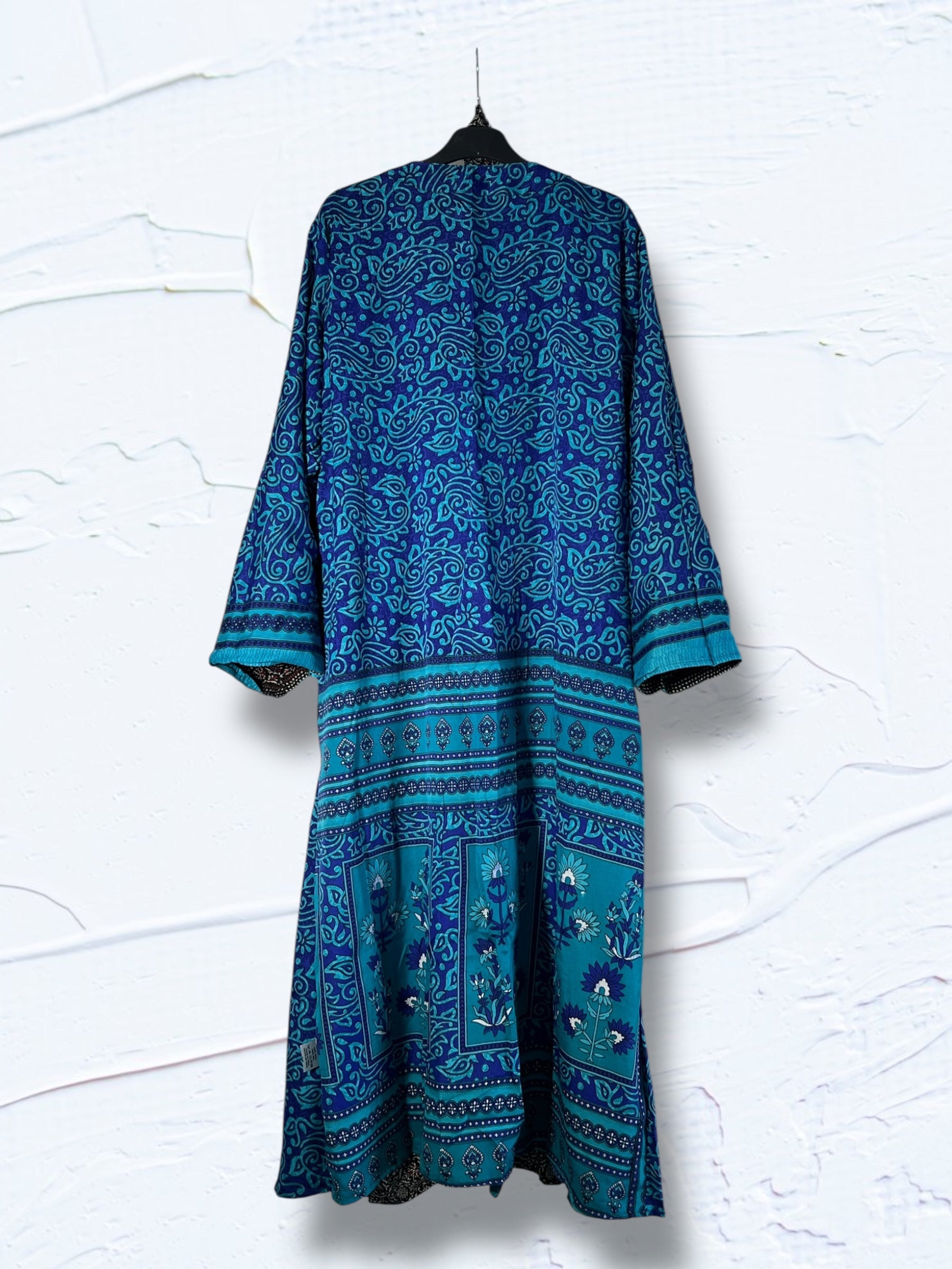 Este kimono unisex está confeccionado con seda reciclada de alta calidad, proveniente de antiguos saris y textiles tradicionales, transformados en una prenda contemporánea con alma. Su diseño reversible presenta dos lados igualmente vibrantes, cada uno con colores, patrones y texturas únicas, permitiéndote elegir según tu estado de ánimo, la ocasión o el estilo del día.