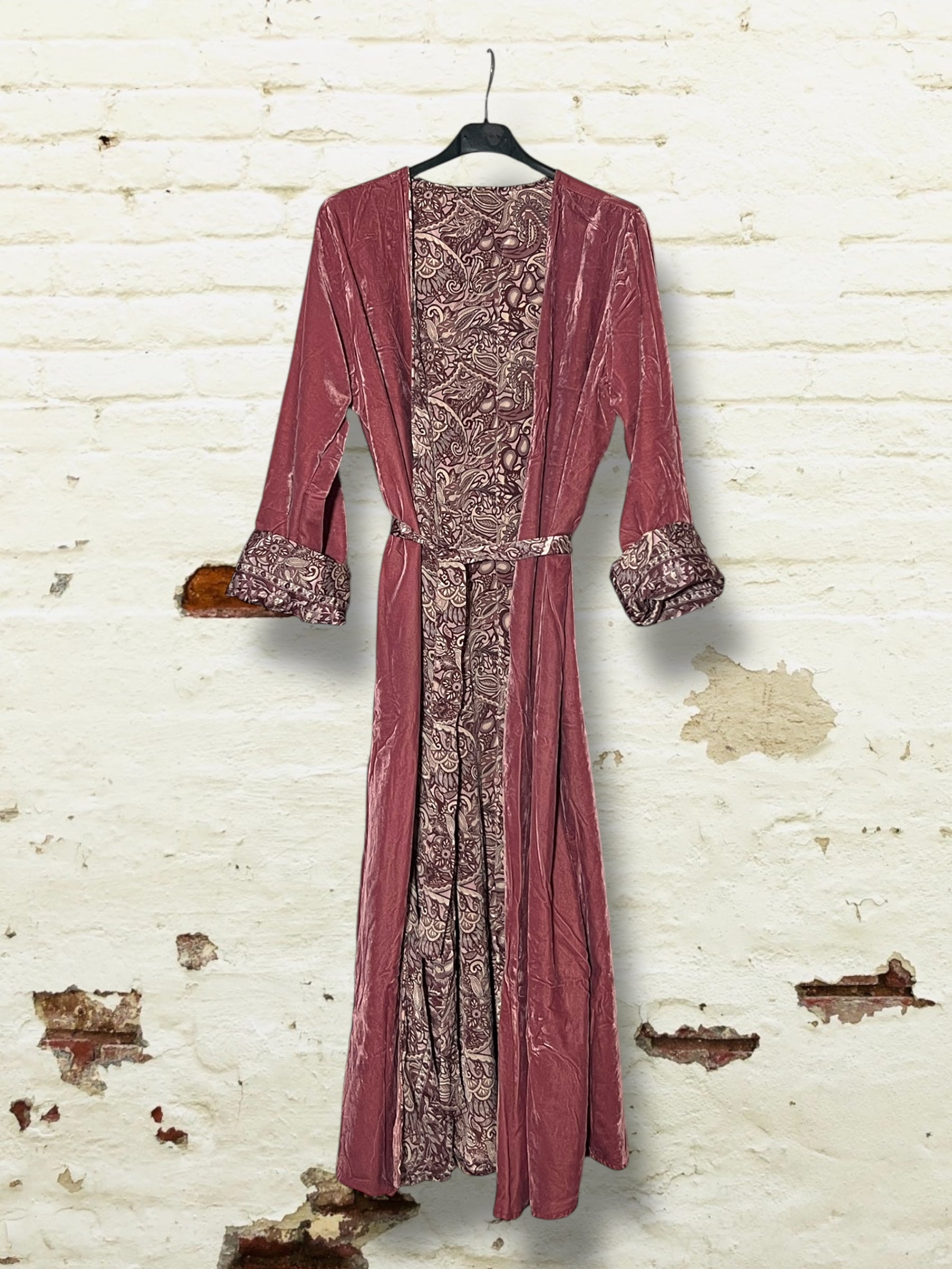 Este kimono único fusiona elegancia y versatilidad. Por un lado, luce un suave terciopelo en tono rosa empolvado que aporta calidez y sofisticación; por el otro, una exquisita seda estampada con motivos paisley que añade un toque artístico y refinado.