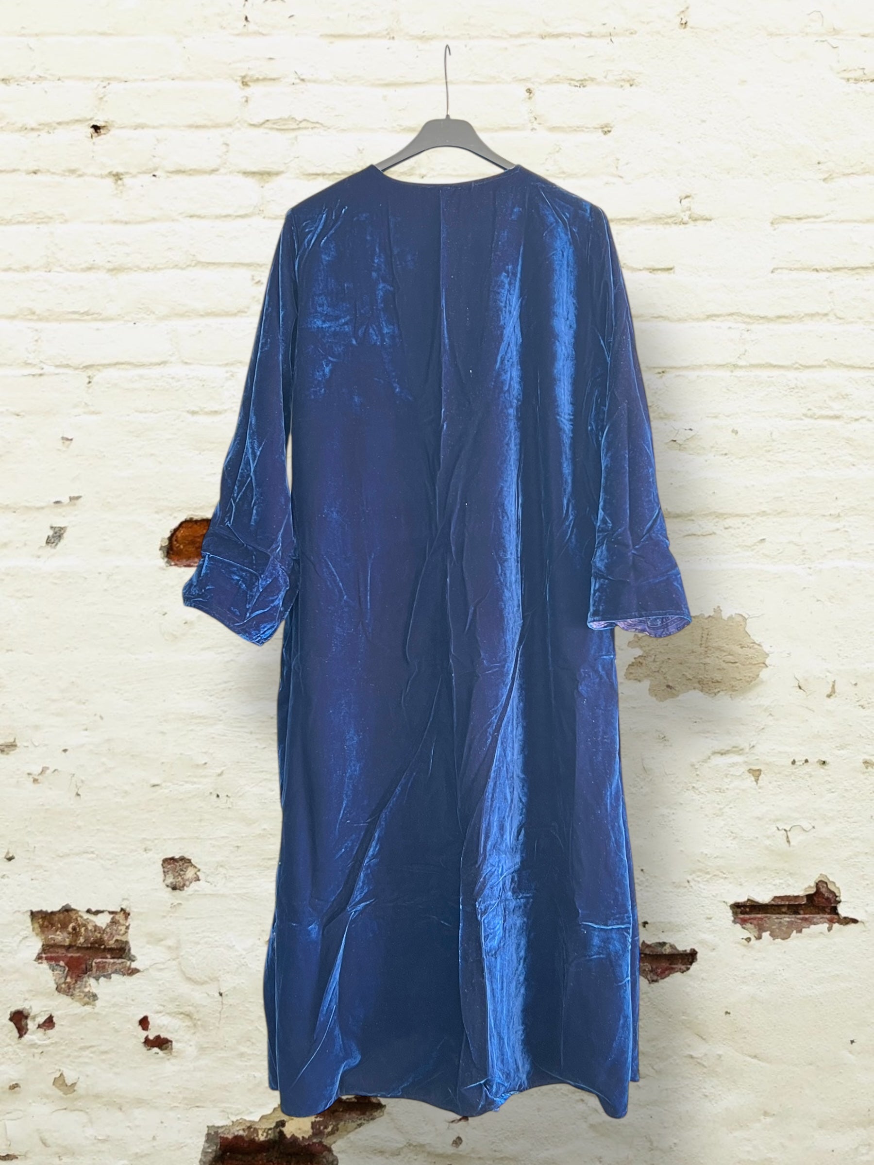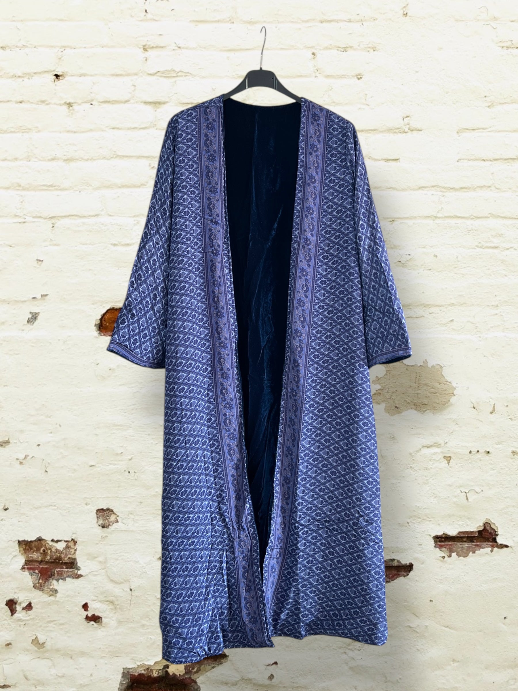 Este kimono único fusiona elegancia y versatilidad. Por un lado, luce un suave terciopelo en tono Azul marino que aporta calidez y sofisticación; por el otro, una exquisita seda estampada con motivos paisley que añade un toque artístico y refinado.