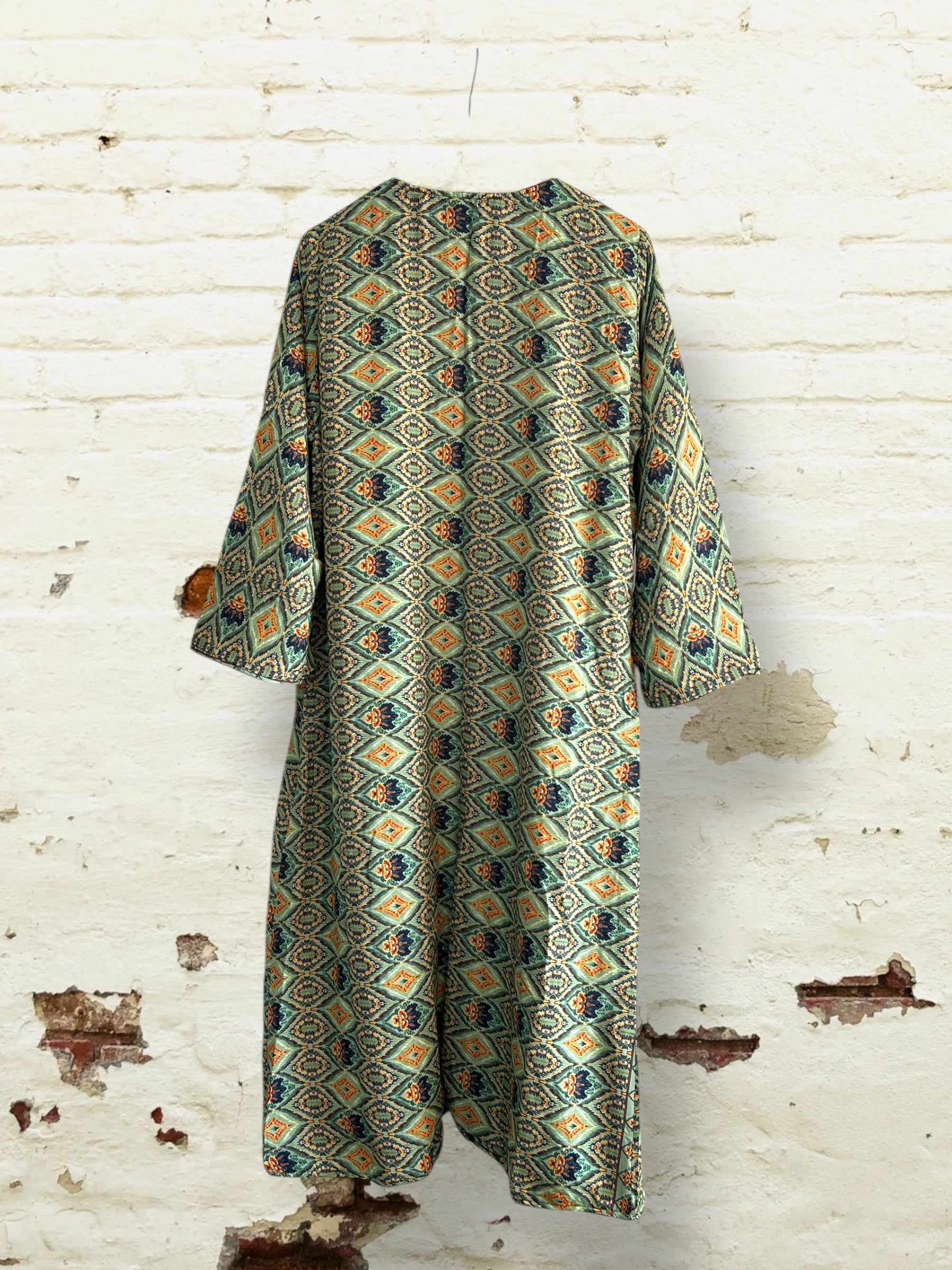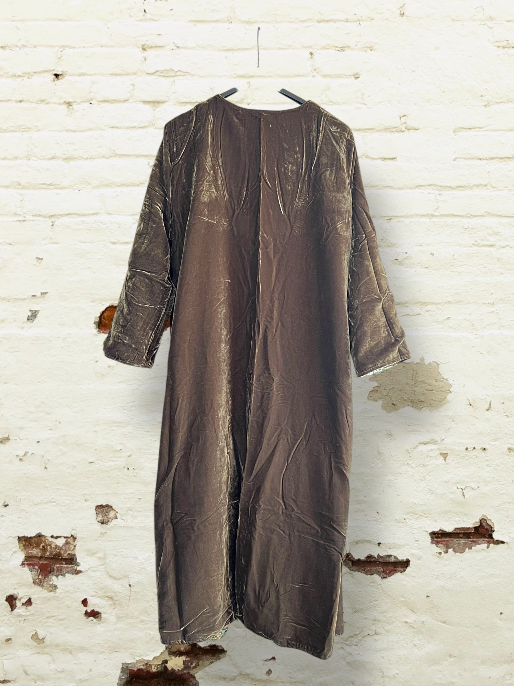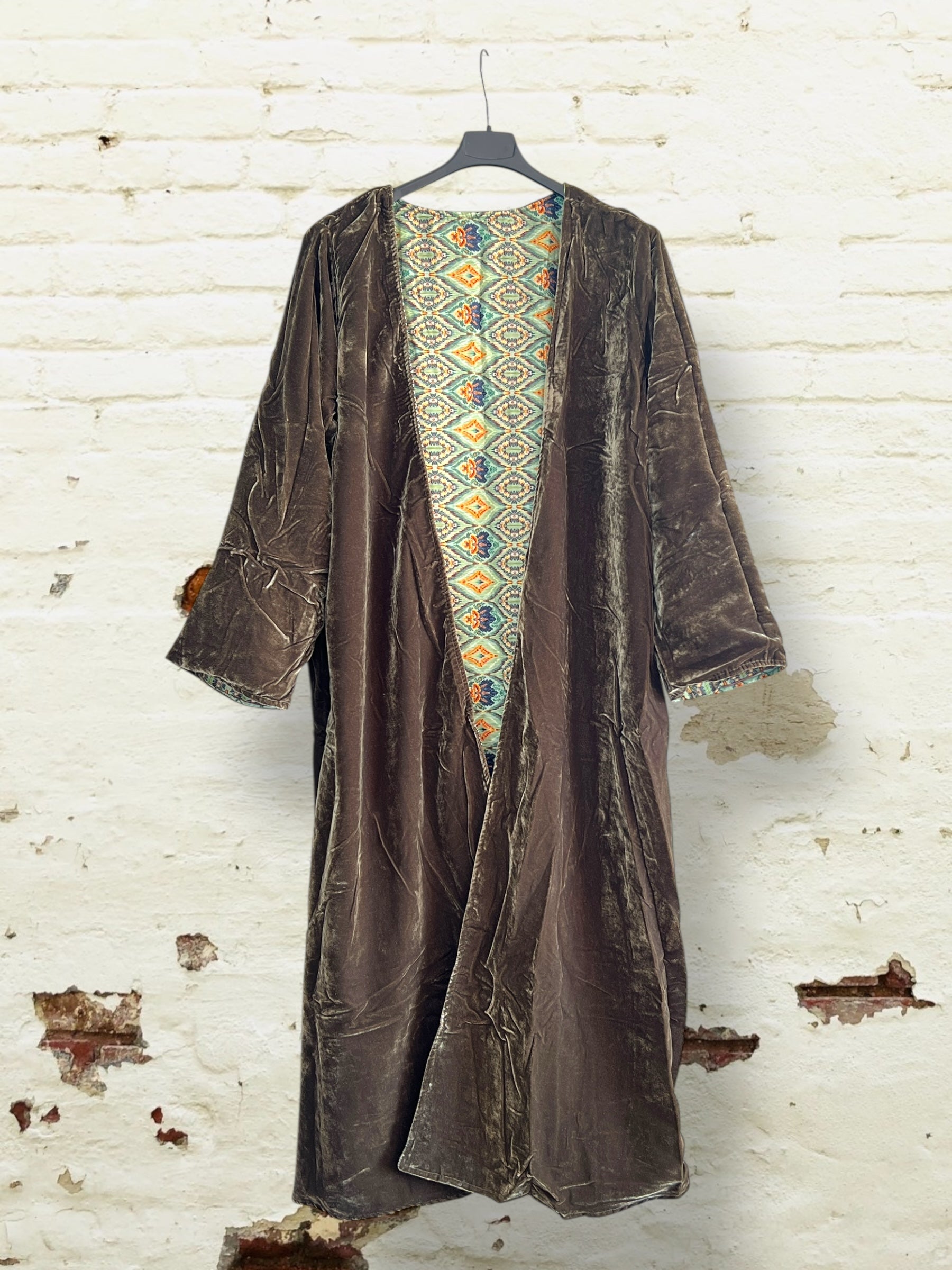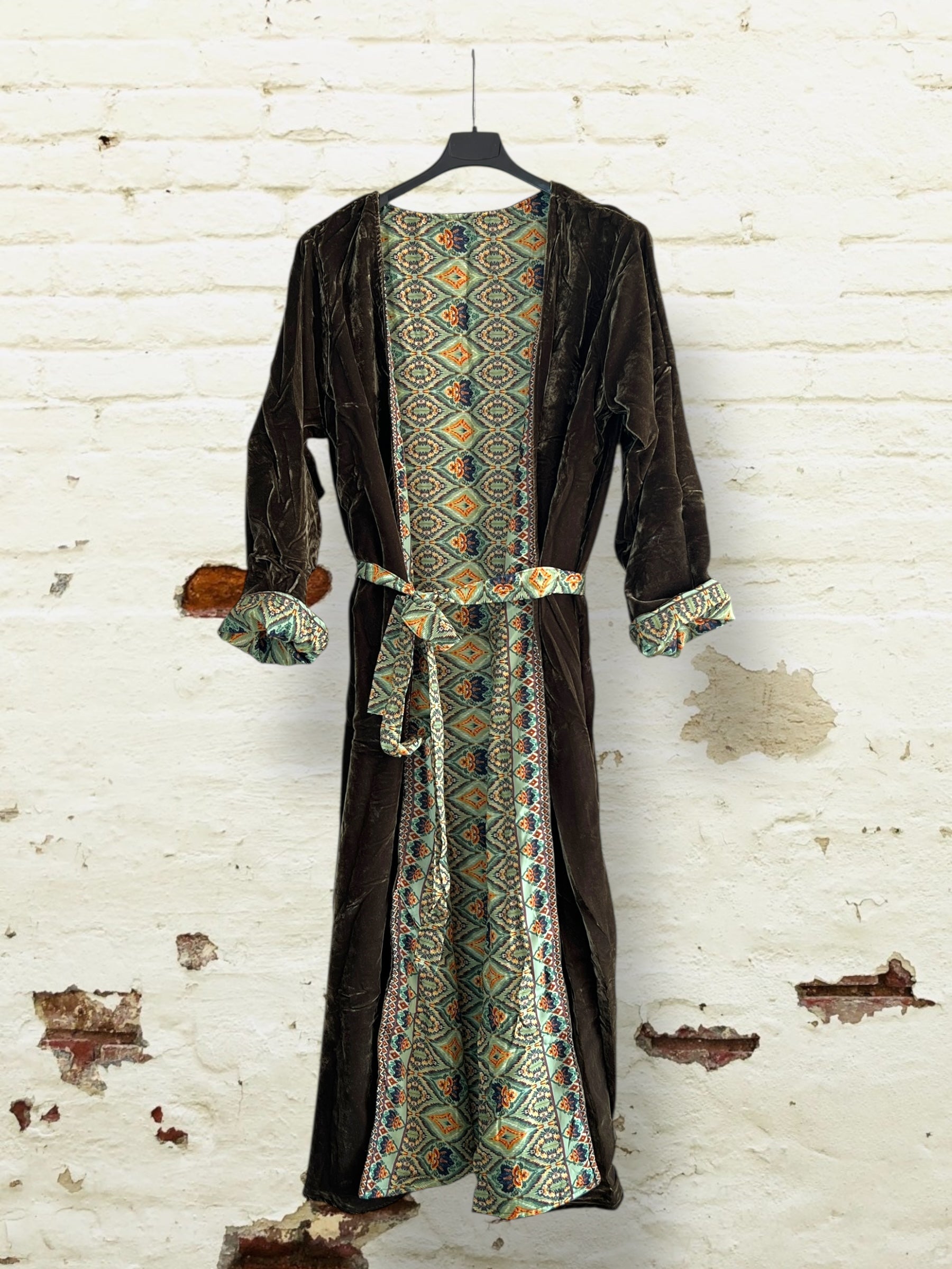 Este kimono único fusiona elegancia y versatilidad. Por un lado, luce un suave terciopelo en tono verde kaki que aporta calidez y sofisticación; por el otro, una exquisita seda estampada con motivos paisley que añade un toque artístico y refinado.