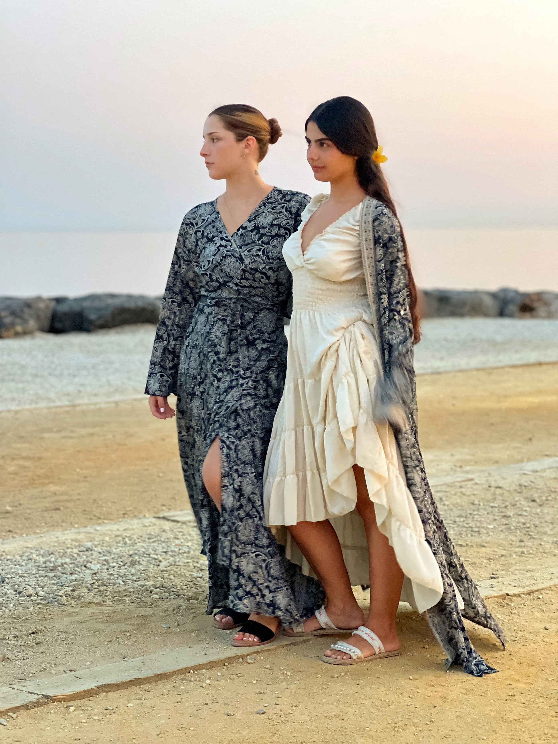 Elegante y fresco, este vestido bohemio es ideal para los días cálidos de primavera y verano. Confeccionado en seda fría de alta calidad, importada directamente desde India, ofrece un acabado suave, fluido y con una caída espectacular. Su diseño asimétrico (más corto adelante y más largo atrás) añade un toque moderno, mientras que el escote en V fruncido realza la silueta con un estilo femenino y relajado.