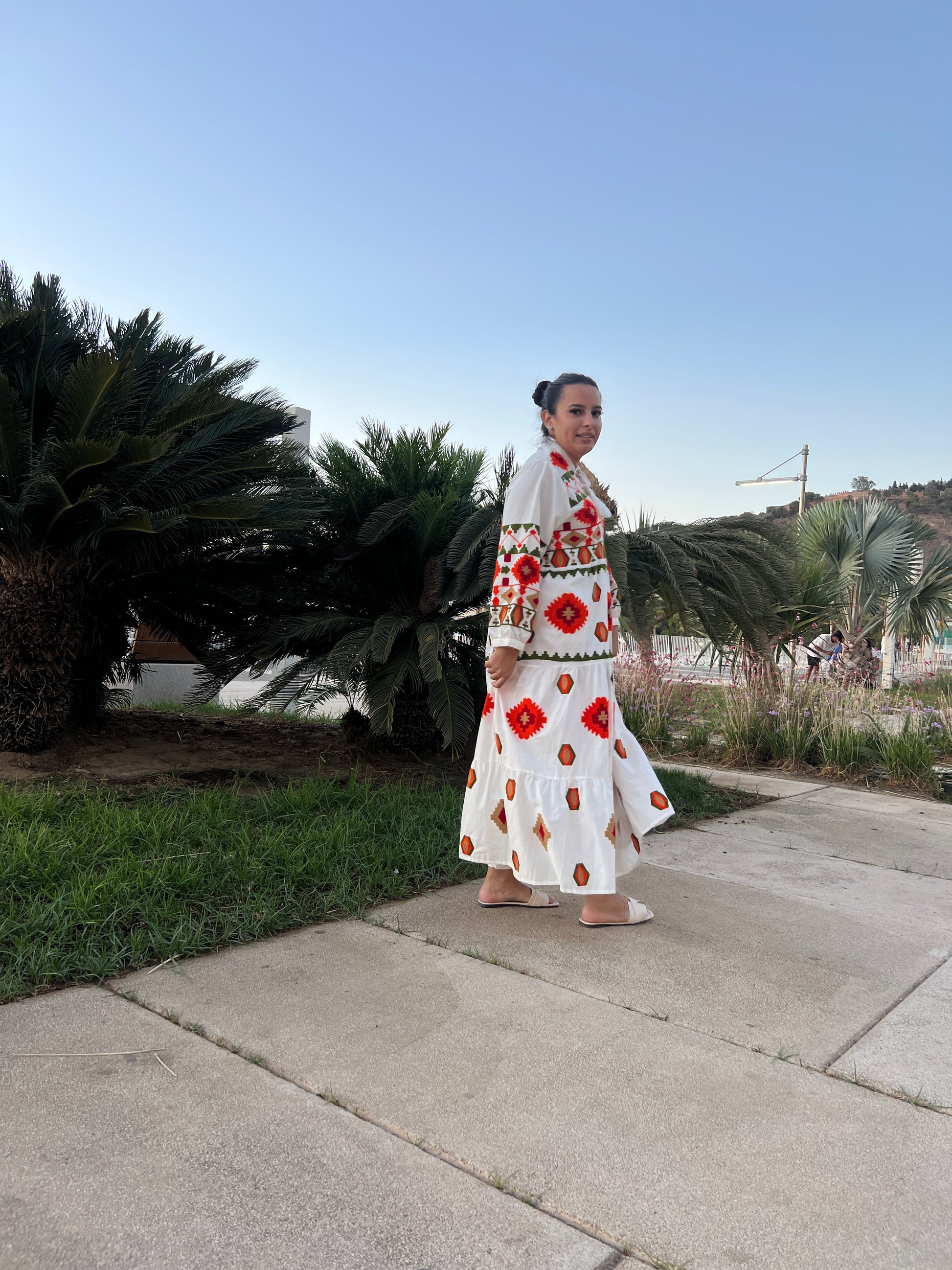 • Diseño: Corte amplio y elegante, con detalles que recuerdan los vestidos tradicionales de regiones como Oaxaca, reinterpretados con un toque oriental.
