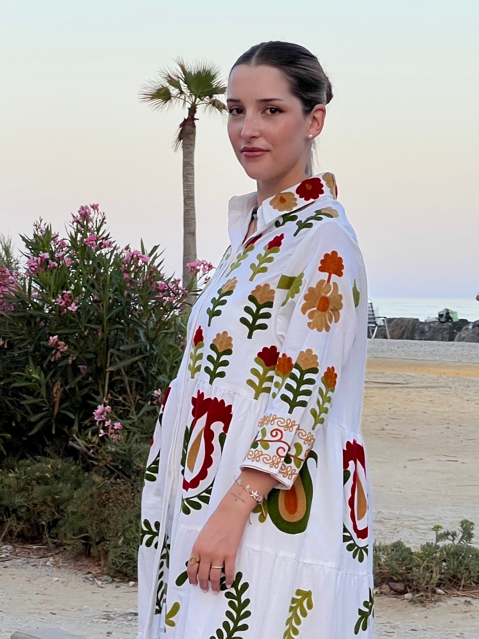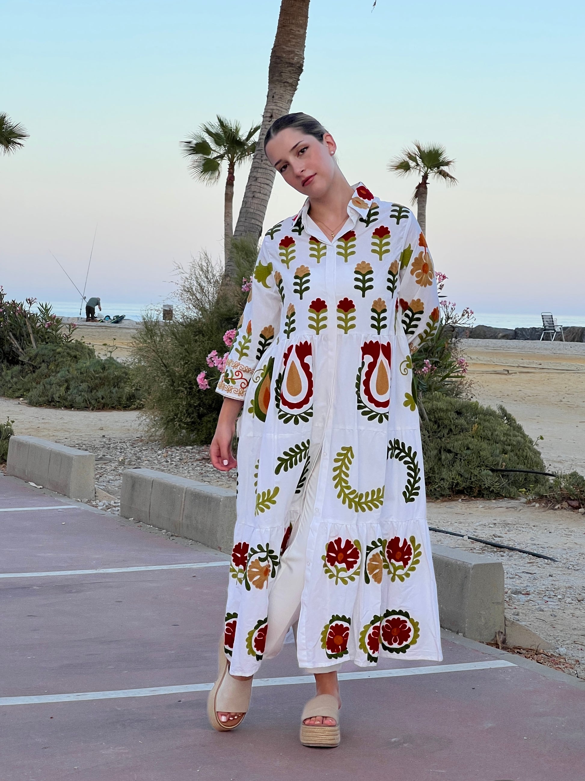 Destaca por sus mangas 3/4 y su cuello de camisa clásico, que aportan un aire estructurado a una silueta bohemia. El vestido está completamente adornado con bordados artesanales en tonos tierra, verde y rojo, con motivos florales y folclóricos que evocan la riqueza cultural de México, elaborados con técnicas tradicionales indias.