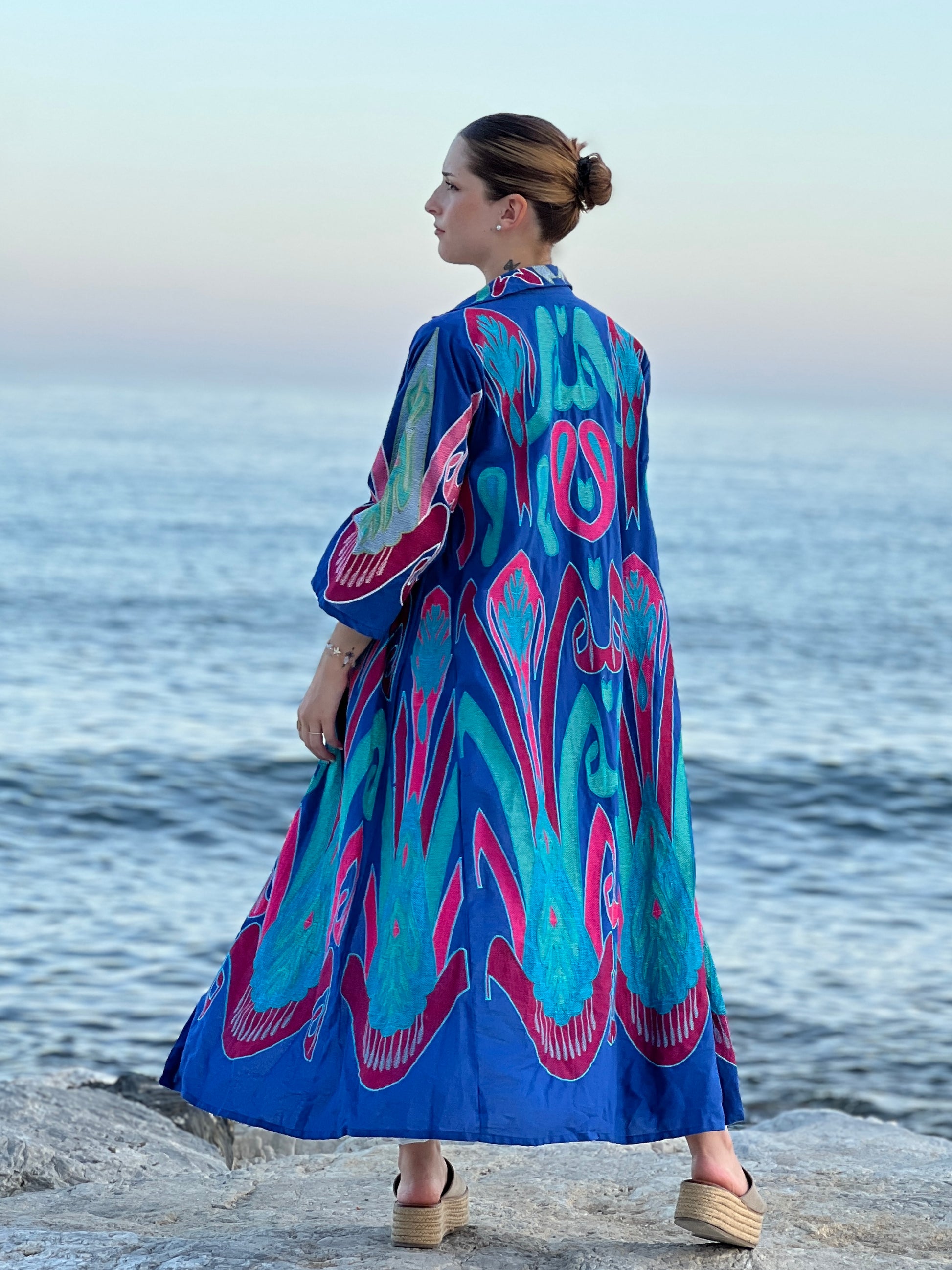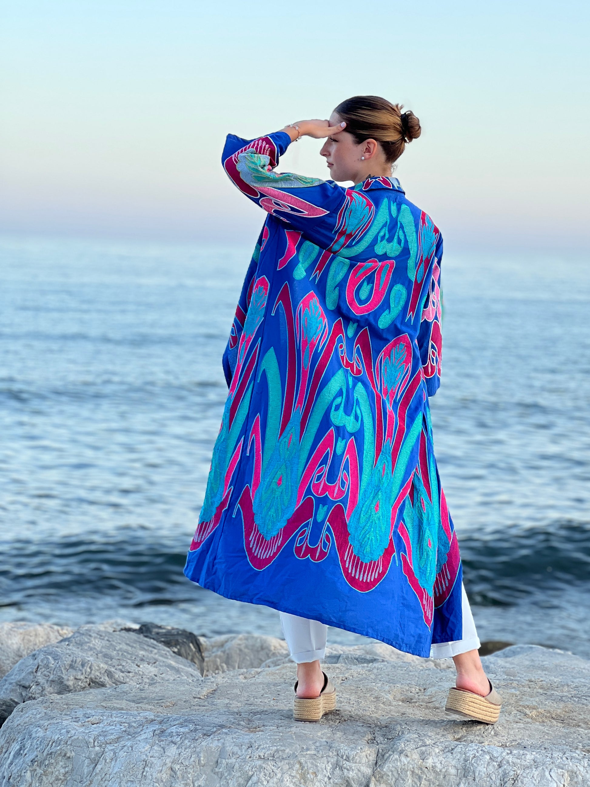 Confeccionado en algodón grueso y bordado, tiene cuerpo, estructura y un diseño que resalta por sus colores intensos: azul profundo, fucsia vibrante y verde turquesa.