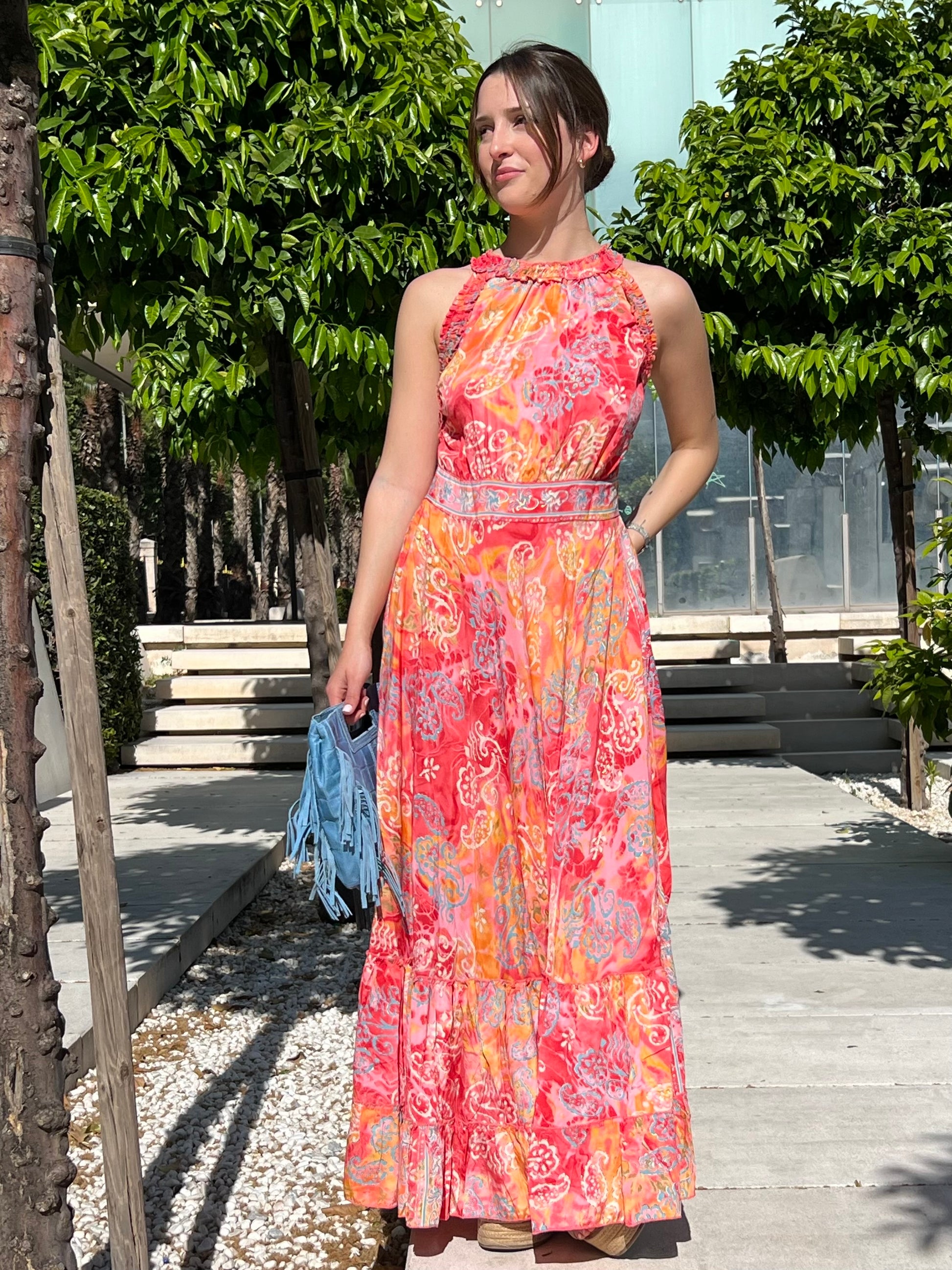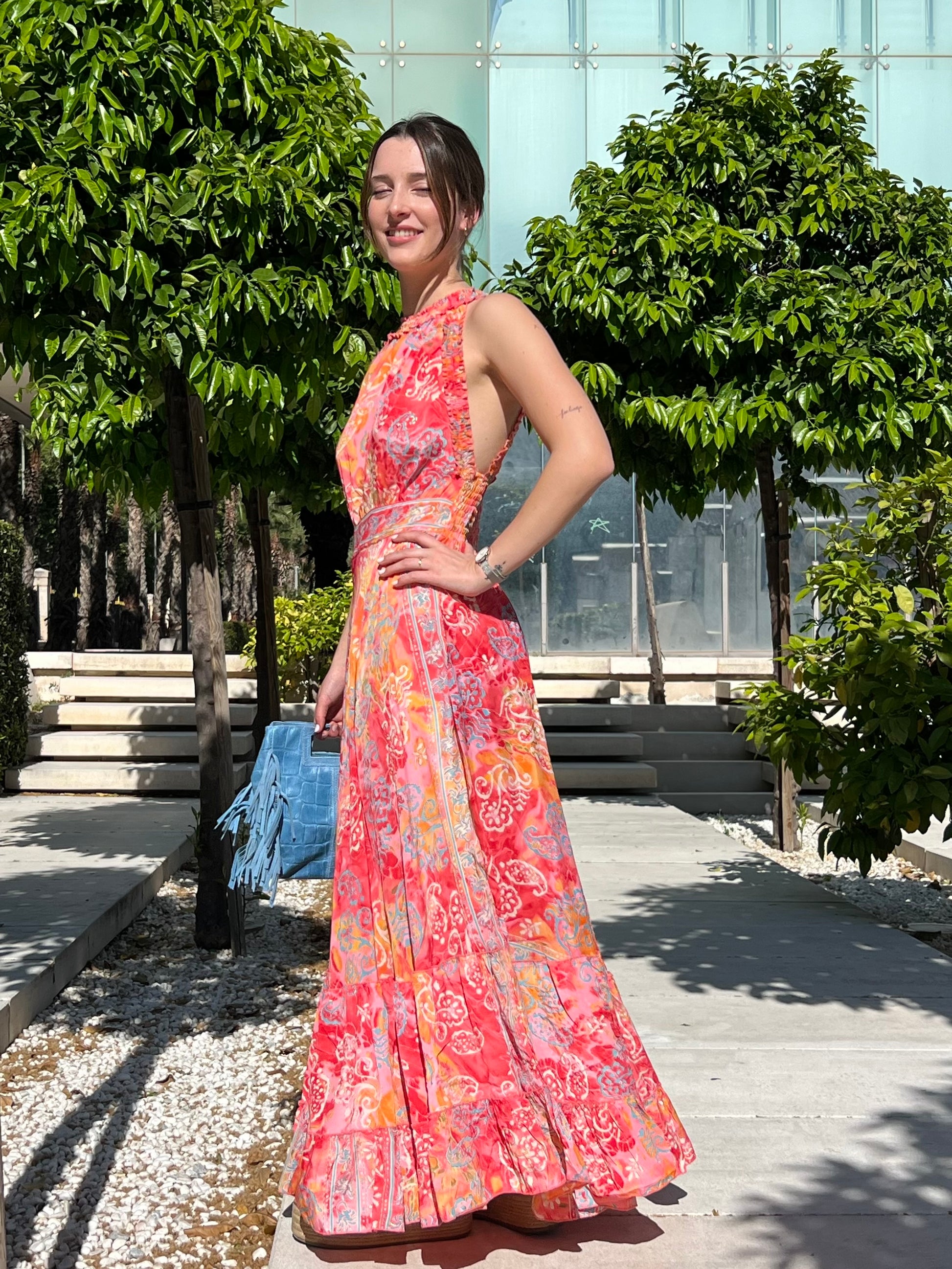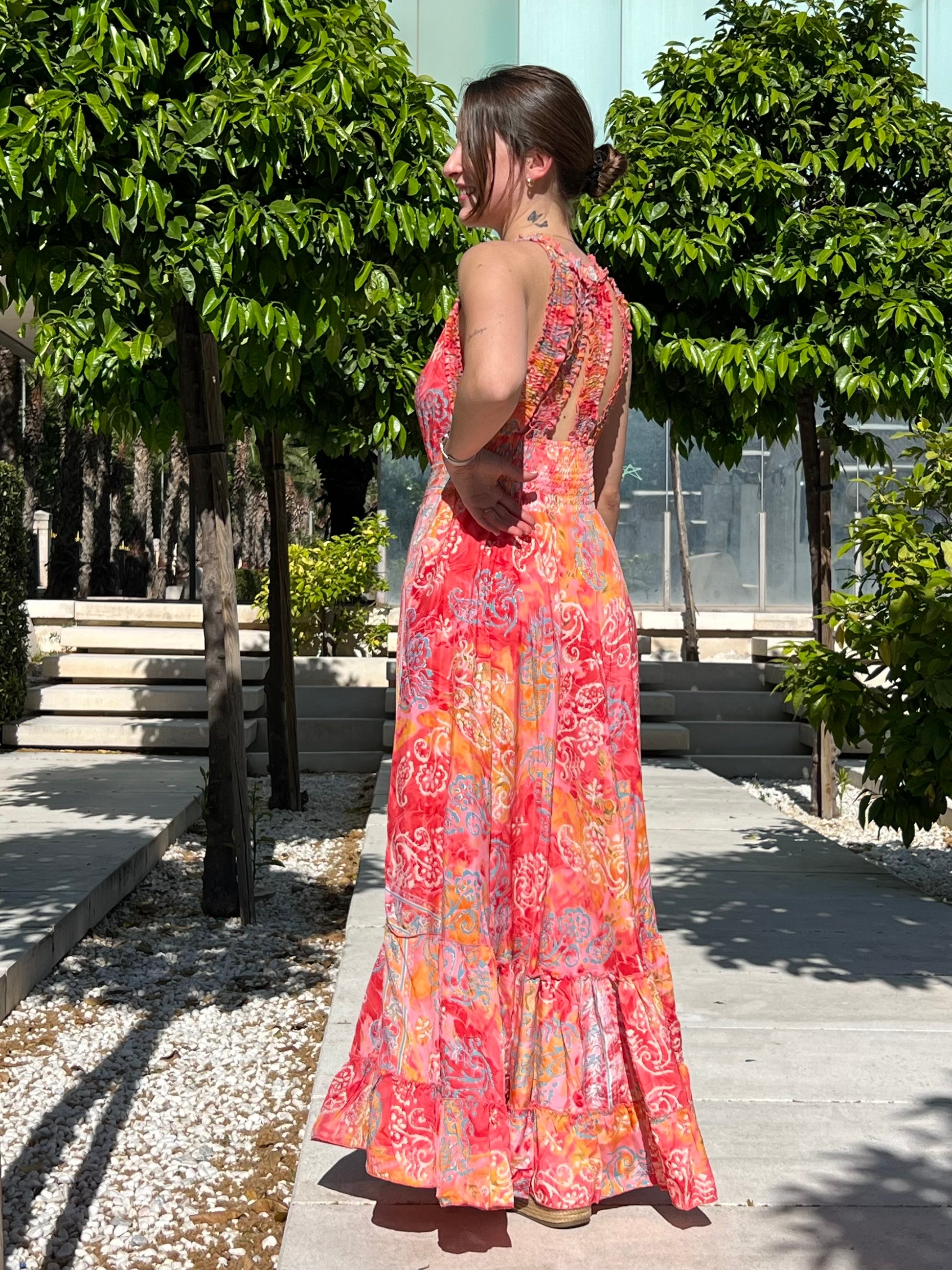 El diseño presenta un estampado floral vibrante en tonos cálidos como rojo, naranja y amarillo, ideal para destacar en cualquier ocasión. La parte trasera cuenta con aberturas decorativas y tirantes anchos, que aportan un aire sofisticado y desenfadado al mismo tiempo.