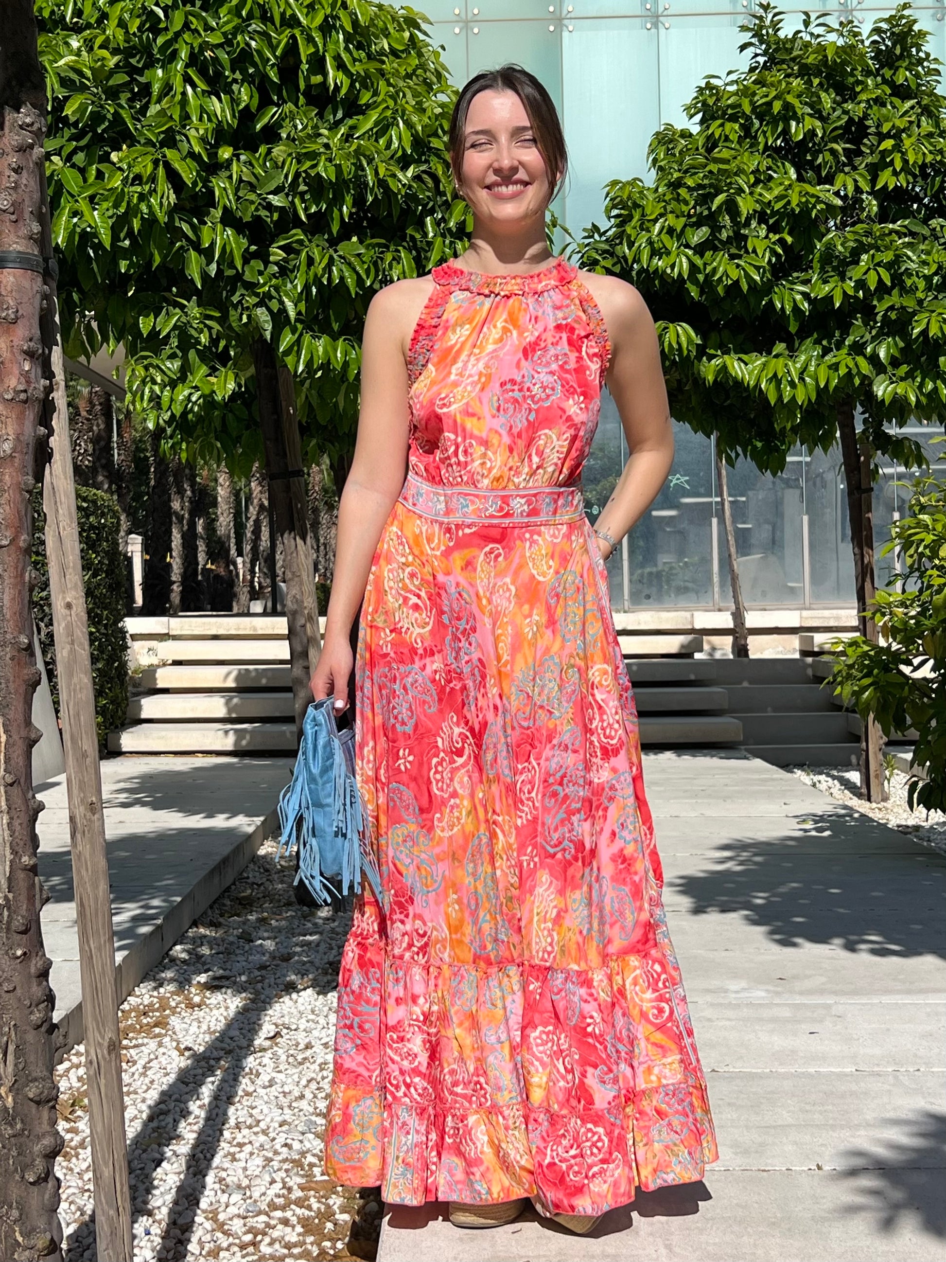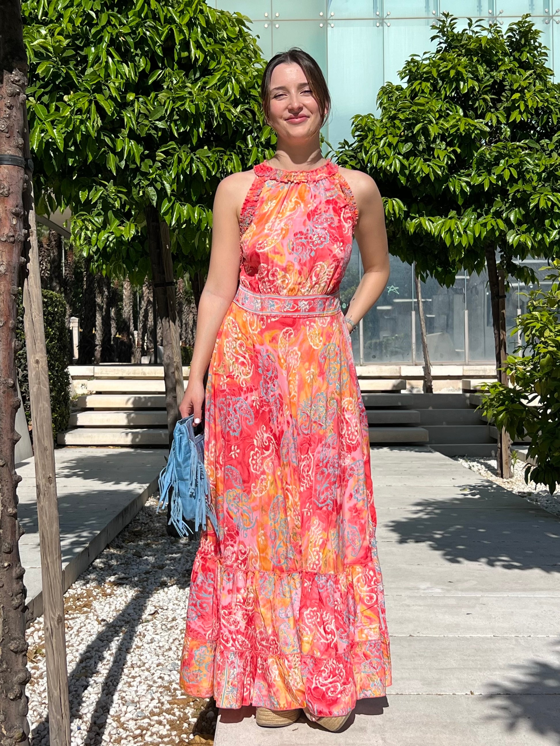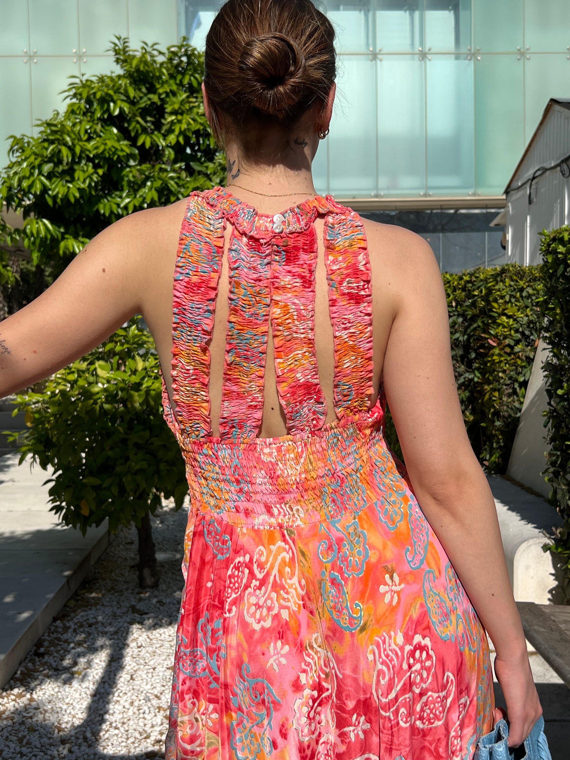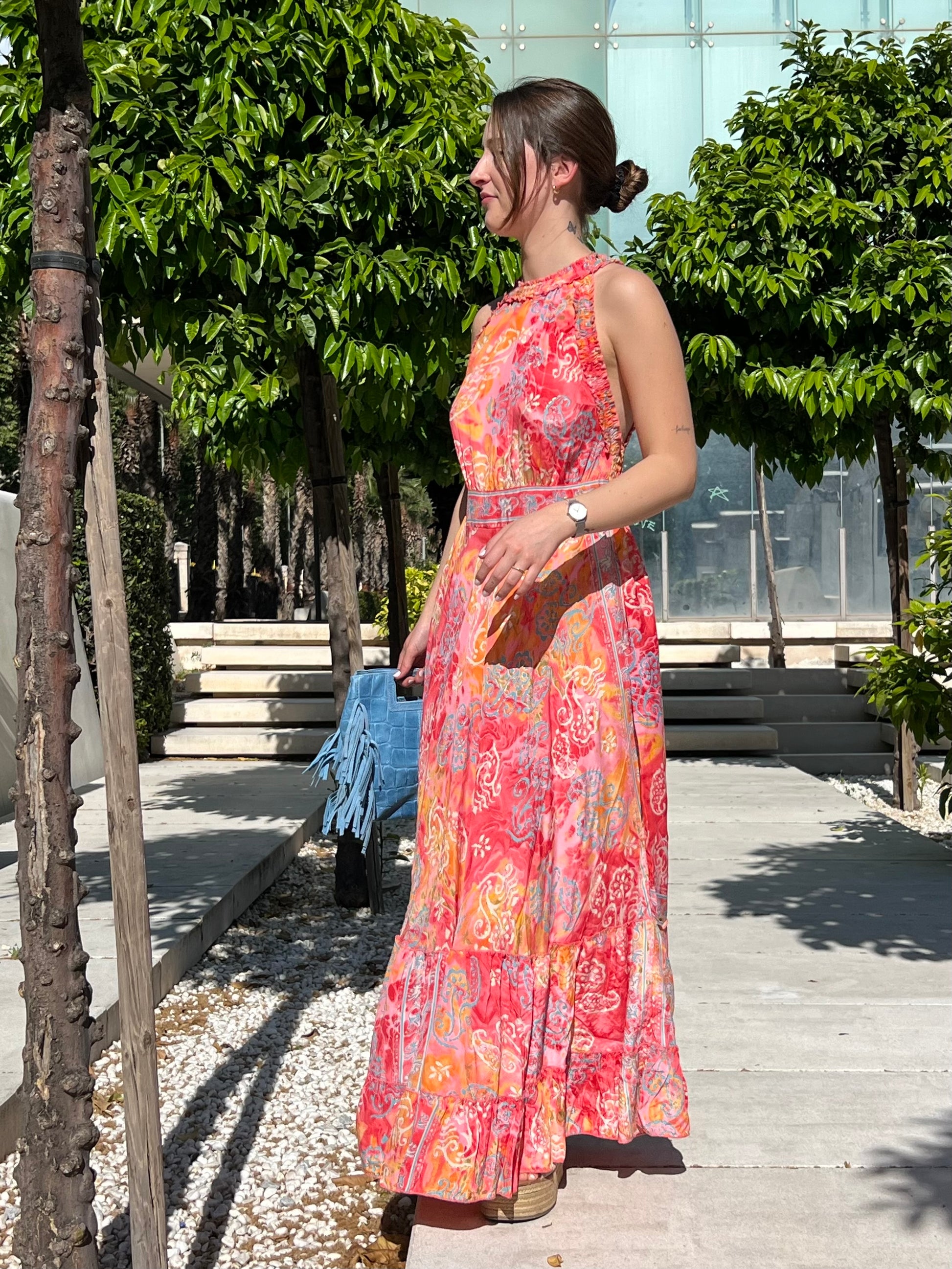 El diseño presenta un estampado floral vibrante en tonos cálidos como rojo, naranja y amarillo, ideal para destacar en cualquier ocasión. La parte trasera cuenta con aberturas decorativas y tirantes anchos, que aportan un aire sofisticado y desenfadado al mismo tiempo.
