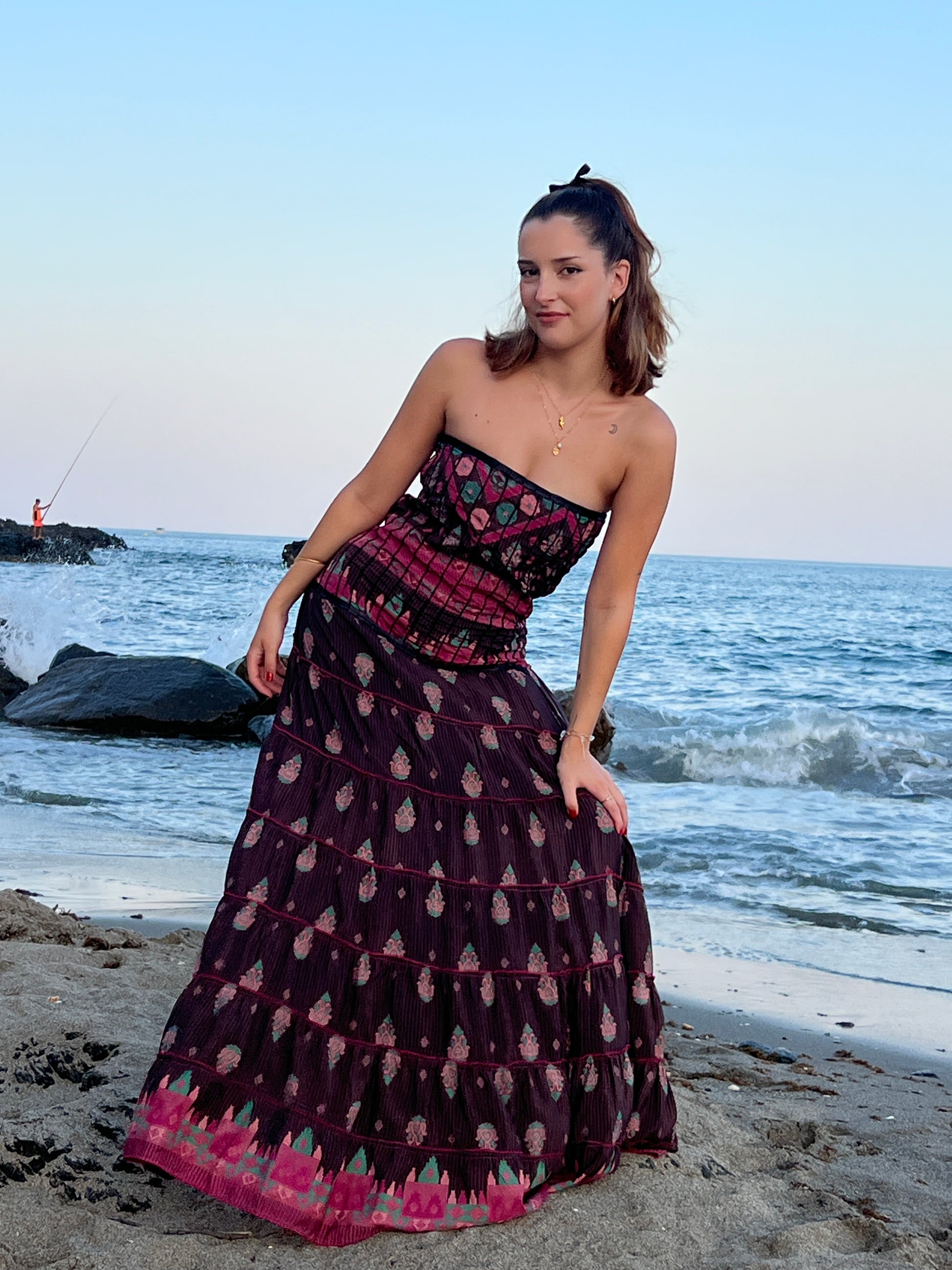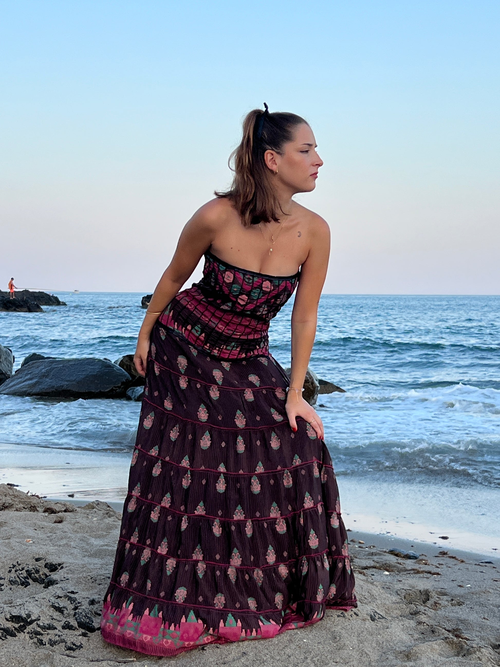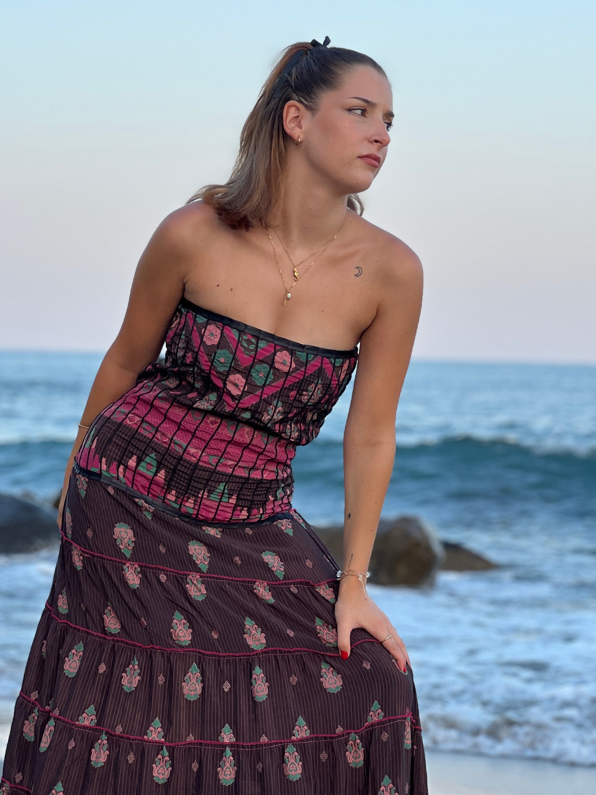 La espalda incluye un diseño tipo nido de abeja, que añade textura y elasticidad, garantizando un ajuste cómodo pero favorecedor. Su caída fluida y su combinación de tonos con detalles clásicos lo convierten en una pieza ideal para ocasiones especiales que buscan equilibrar lo sostenible con lo sofisticado