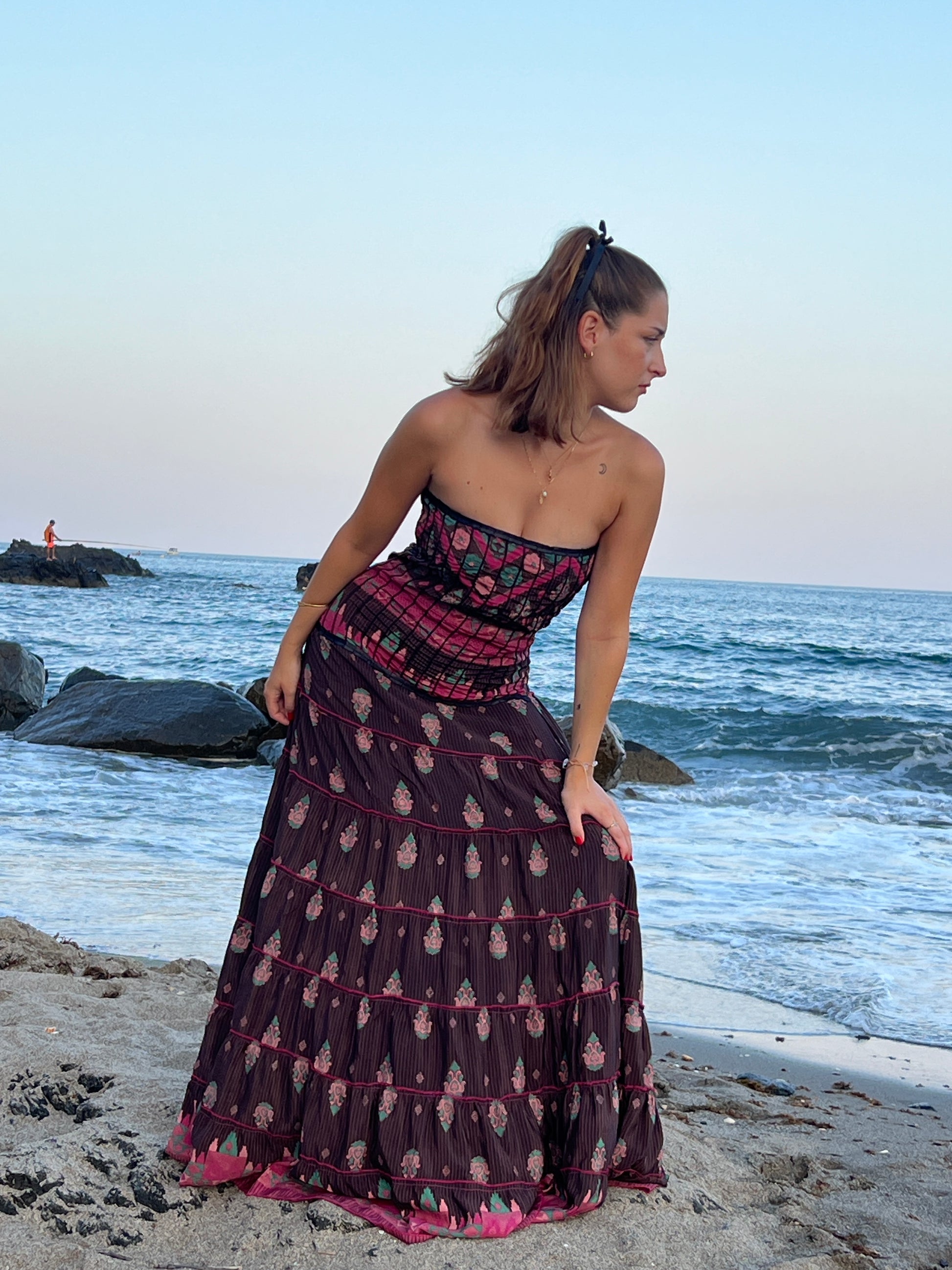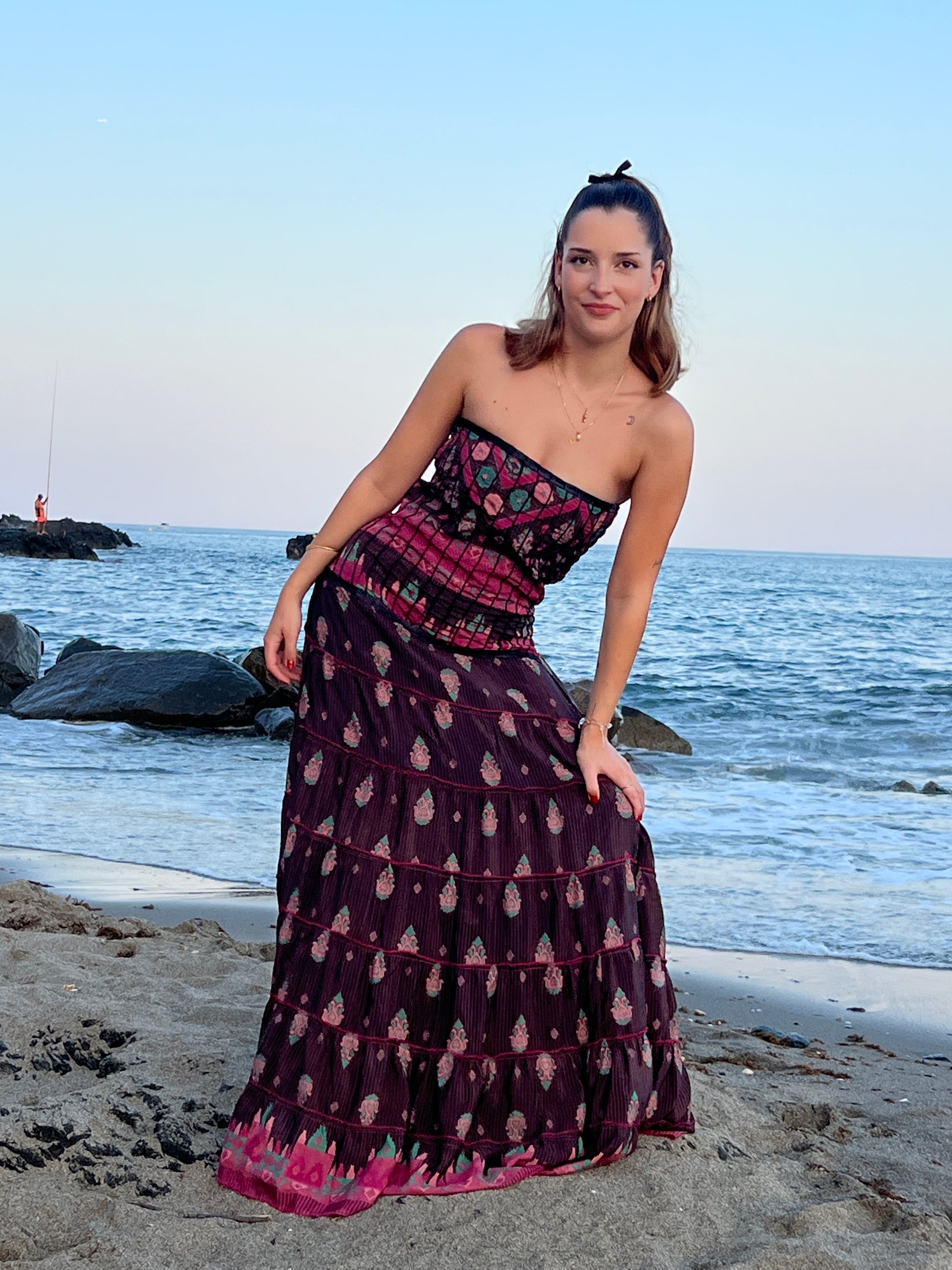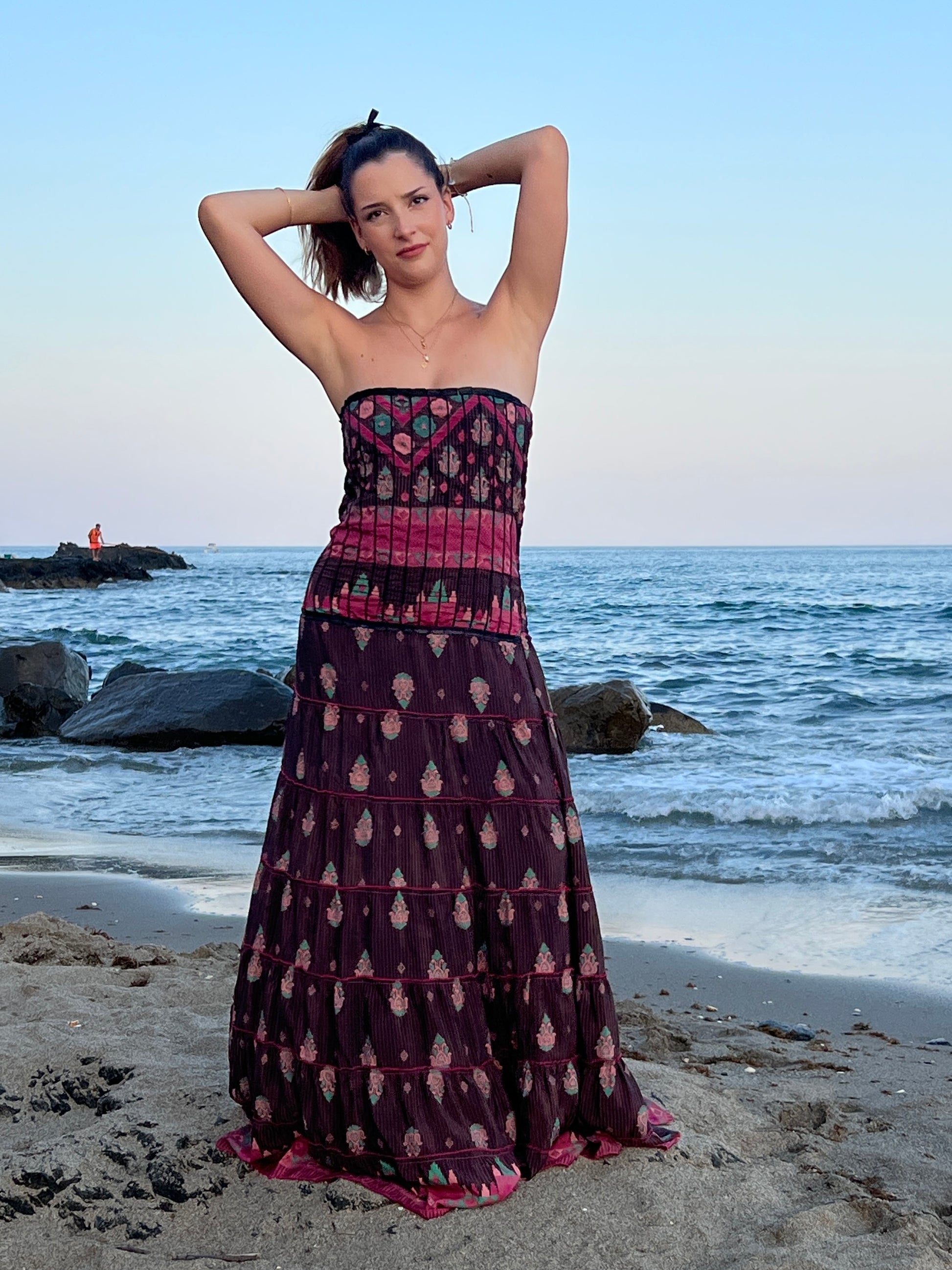 La espalda incluye un diseño tipo nido de abeja, que añade textura y elasticidad, garantizando un ajuste cómodo pero favorecedor. Su caída fluida y su combinación de tonos con detalles clásicos lo convierten en una pieza ideal para ocasiones especiales que buscan equilibrar lo sostenible con lo sofisticado