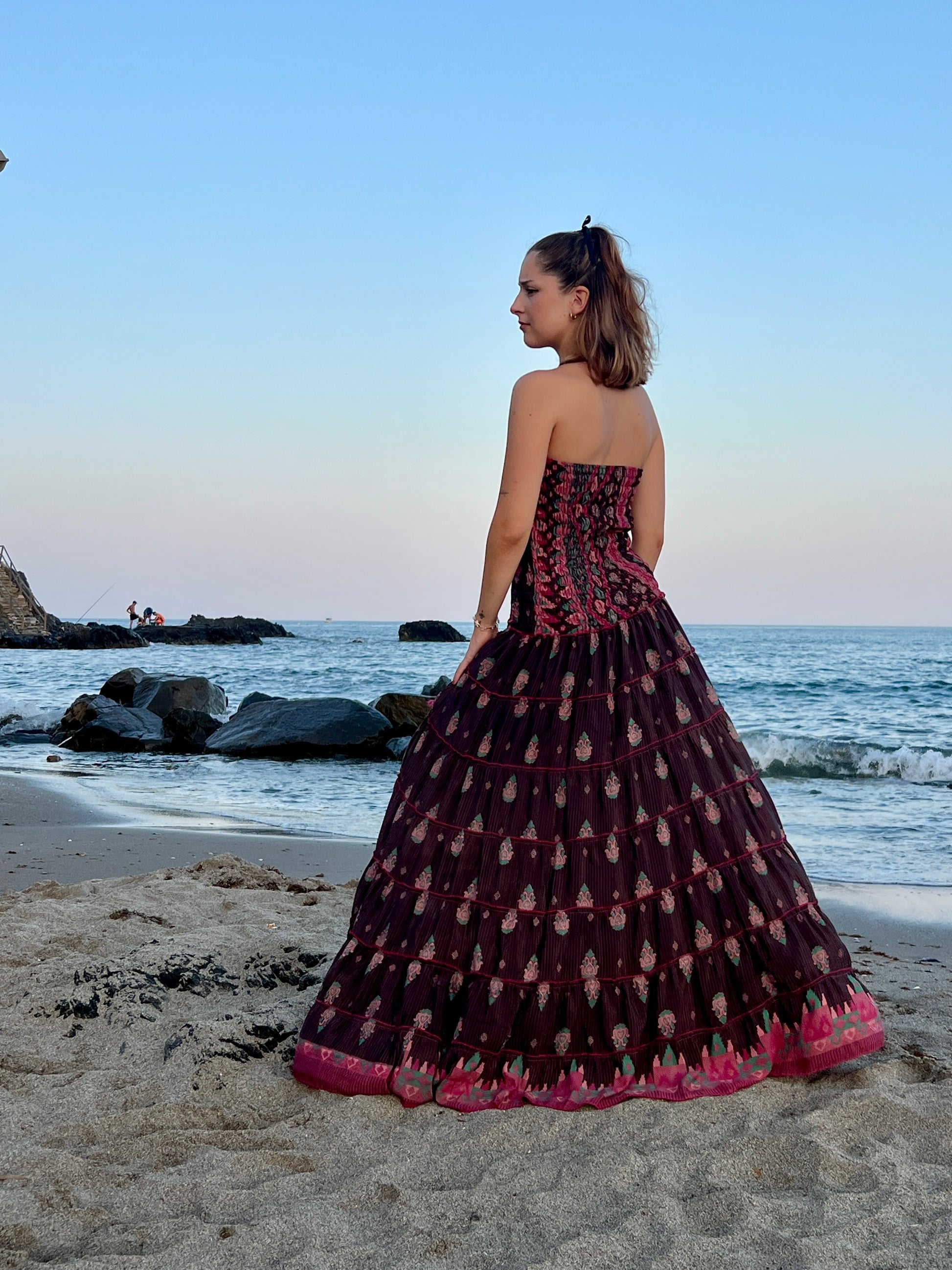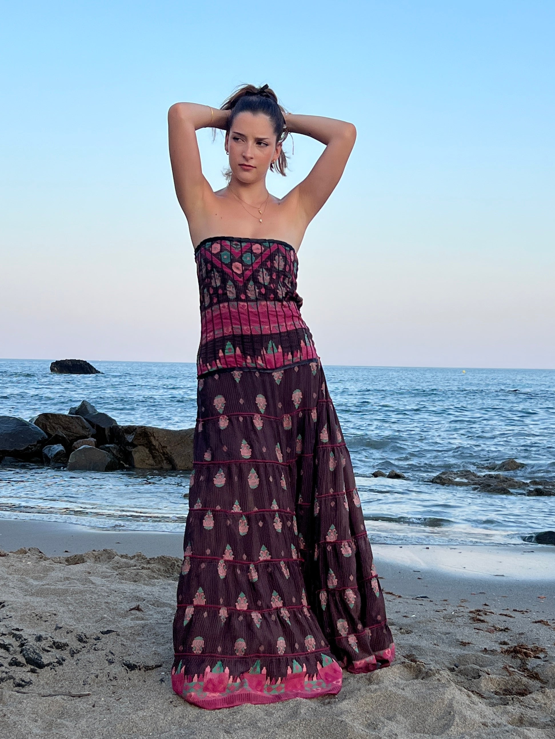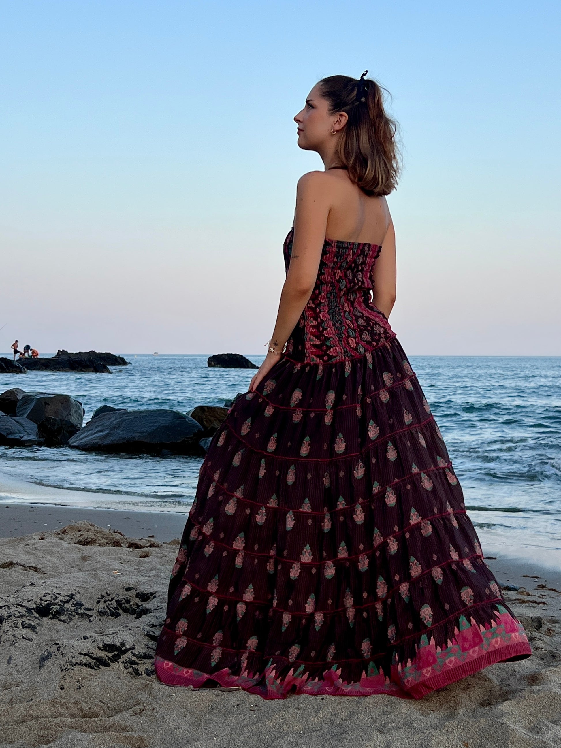 Este vestido largo, confeccionado en seda reciclada, destaca por su diseño elegante. El corte palabra de honor resalta los hombros y el escote de forma delicada, mientras que el vestido en tono marón oscuro estampado con delicadas flores crea un efecto romántico.