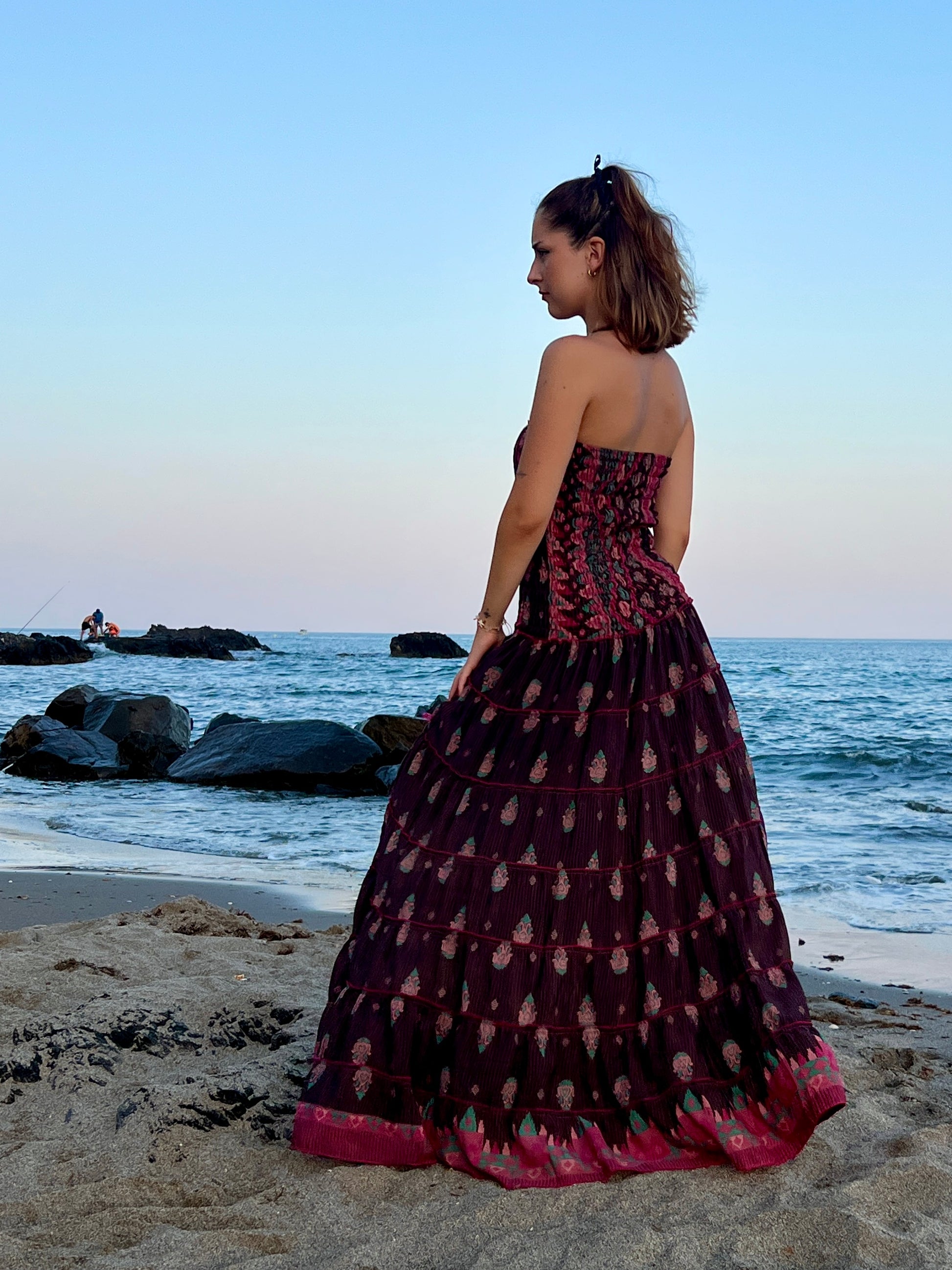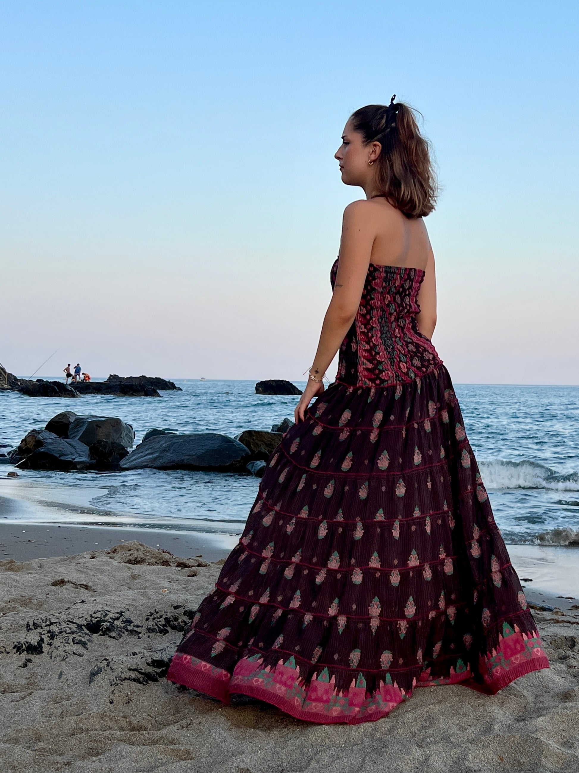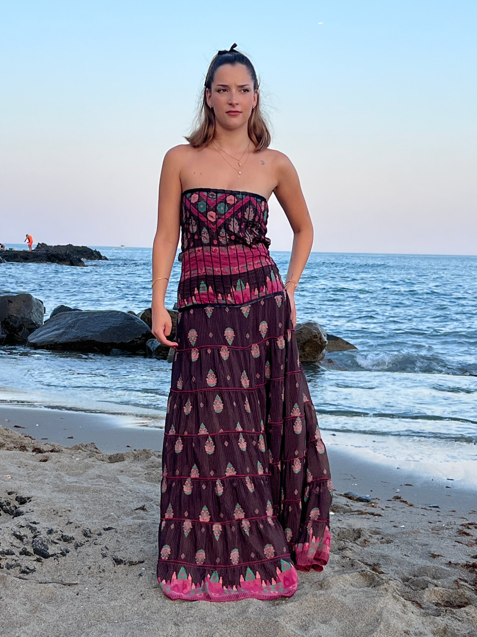 Este vestido largo, confeccionado en seda reciclada, destaca por su diseño elegante. El corte palabra de honor resalta los hombros y el escote de forma delicada, mientras que el vestido en tono marón oscuro estampado con delicadas flores crea un efecto romántico.